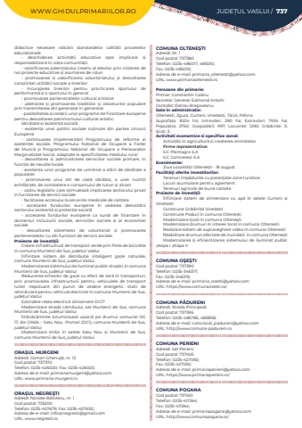 WWW.GHIDULPRIMARIILOR.RO JUDE%u021aUL VASLUI / 737didactice necesare ridic%u0103rii standardelor calit%u0103%u021bii proceselor educa%u021bionale- deschiderea activit%u0103%u021bii%u00a0 educative spre implicare %u0219i responsabilizare %u00een via%u021ba comunit%u0103%u021bii- valorificarea poten%u021bialului creativ al elevilor prin ini%u021bierea de noi proiecte educative %u0219i asumarea de roluri- promovarea %u0219i valorificarea voluntariatului %u0219i dezvoltarea con%u0219tiin%u021bei utilit%u0103%u021bii sociale a tinerilor- %u00eencurajarea tinerilor pentru practicarea sportului de performan%u021b%u0103 %u0219i a sportului %u00een general- promovarea parteneriatelor cultural artistice- p%u0103strarea %u0219i promovarea tradi%u021biilor %u0219i obiceiurilor populare prin transmiterea din genera%u021bie %u00een genera%u021bie- posibilitatea acces%u0103rii unor programe de finan%u021bare europene pentru dezvoltarea patrimoniului cultural-artistic.S%u0103n%u0103tate %u0219i asisten%u021b%u0103 social%u0103- existen%u021ba unei politici sociale su%u021binute din partea Uniunii Europene- continuarea implement%u0103rii Programului de reforme al asisten%u021bei sociale, Programului Na%u021bional de Ocupare a For%u021bei de Munc%u0103 %u0219i Programului Na%u021bional de Ocupare a Persoanelor Marginalizate Social, adaptate la specificitatea mediului rural- dezvoltarea %u0219i administrarea serviciilor sociale primare, %u00een func%u021bie de nevoile locale- existen%u021ba unor programe de urm%u0103rire a st%u0103rii de s%u0103n%u0103tate a popula%u021biei- promovarea unui stil de via%u021b%u0103 s%u0103n%u0103tos, a unei nutri%u021bii echilibrate, de combatere a consumului de tutun %u0219i alcool- cadru legislativ care stimuleaz%u0103 implicarea sectorului privat %u00een furnizarea de servicii sociale- facilitarea accesului la serviciile medicale de calitate- accesarea fondurilor europene %u00een vederea dezvolt%u0103rii sectorului asisten%u021b%u0103 %u0219i protec%u021bie social%u0103- accesarea fondurilor europene ca surs%u0103 de finan%u021bare %u00een domeniul incluzunii sociale, serviciilor sociale %u0219i al economiei sociale- dezvoltarea sistemelor de voluntariat %u0219i promovarea parteneriatelor cu al%u021bi furnizori de servicii sociale.Proiecte de investi%u0163ii:Creare infrastructur%u0103%u00a0de transport verde prin Piste de biciclete %u00een comuna Muntenii de Sus, jude%u021bul Vaslui%u00cenfiin%u021bare sistem de distribu%u021bie inteligent gaze naturale, comuna Muntenii de Sus, jude%u021bul VasluiModernizarea sistemului de iluminat public stradal, %u00een comuna Muntenii de Sus, jude%u021bul VasluiReducerea emisiilor de gaze cu efect de ser%u0103 %u00een transporturi, prin promovarea infrastructurii pentru vehiculele de transport rutier nepoluant din punct de vedere energetic: sta%u021bii de re%u00eenc%u0103rcare pentru vehicule electrice %u00een comuna Muntenii de Sus, jude%u021bul VasluiExtindere re%u021bea electric%u0103 aliniament DC17Modernizare strada L%u0103m%u00e2iului, sat Muntenii de Sus, comuna Muntenii de Sus, jude%u021bul Vaslui%u00cembr%u0103c%u0103minte bituminoas%u0103 u%u0219oar%u0103 pe drumul comunal DC 17, din DN24 %u2013 Satu Nou %u2013Portari (DC1), comuna Muntenii de Sus, jude%u021bul Vaslui Modernizare str%u0103zi %u00een satele Satu Nou %u0219i Muntenii de Sus, comuna Muntenii de Sus, jude%u021bul VasluiORA%u0218UL MURGENIAdres%u0103: Coman Ghenu%u0163%u0103, nr. 12Cod po%u0219tal: 737370Telefon: 0235-426020; Fax: 0235-426020; Adresa de e-mail: primariamurgeni@yahoo.comURL: www.primaria-murgeni.roORA%u0218UL NEGRE%u015eTIAdres%u0103: Nicolae B%u0103lcescu, nr. 1Cod po%u0219tal: 735200Telefon: 0235-457679; Fax: 0235-457630; Adresa de e-mail: inforpnegresti@gmail.comURL: www.negresti.roCOMUNA OLTENE%u015eTIAdres%u0103: Nr. 1Cod po%u0219tal: 737380Telefon: 0235-485017, 485010; Fax: 0235-485010; Adresa de e-mail: primaria_oltenesti@yahoo.comURL: www.primariaoltenesti.roPersoane din primarie:Primar: Constantin GaleruSecretar General: Edmond AntohiContabil: Elenav Bra%u015foveanuSate %u00een administra%u021bie:Oltene%u0219ti, Zgura, Curteni, Vine%u021be%u0219ti, T%u00e2rzii, P%u00e2hnaSuprafa%u021ba:%u00a0 8224 ha; Intravilan:%u00a0 290 ha; Extravilan:%u00a0 7934 ha; Popula%u021bia:%u00a0 2750; Gospod%u0103rii:%u00a0 997; Locuin%u021be:%u00a0 1290; Gr%u0103dini%u021be:%u00a0 3; %u0218coli:%u00a03; Activitati economice si specifice zonei:Activit%u0103%u021bi %u00een agricultur%u0103 %u0219i cre%u0219terea animalelorFirme reprezentative:S.C Plantagro S.AS.C Comcereal S.AEvenimente:Ziua Localit%u0103%u021bii Oltene%u0219ti - 18 augustFacilit%u00e3%u0163i oferite investitorilor:Terenuri %u00eemp%u0103durite cu poten%u0163iale zone turisticeLacuri acumulare pentru agrementTerenuri agricole de bun%u0103 calitateProiecte de investi%u0163ii:%u00cenfiin%u021bare sistem de alimentare cu ap%u0103 %u00een satele Curteni %u0219i Vine%u021be%u0219tiConstruire Gr%u0103dini%u021b%u0103 Vine%u021be%u0219tiConstruire Poduri %u00een comuna Oltene%u0219tiModernizare %u0218coli %u00een comuna Oltene%u0219tiModernizare drumuri %u00een%u00a0interes local %u00een%u00a0comuna%u00a0Oltene%u0219tiRealizare sistem de supraveghere video%u00a0%u00een comuna%u00a0Oltene%u0219tiReabilitare drumuri afectate de inunda%u021bii%u00a0%u00a0%u00een comuna%u00a0Oltene%u0219tiModernizarea %u0219i%u00a0 eficientizarea sistemului de iluminat public ,etapa I ,etapa IICOMUNA O%u015eE%u015eTICod po%u0219tal: 737390Telefon: 0235-346317; Fax: 0235-346319; Adresa de e-mail: primaria_osesti@yahoo.comURL: https://www.comunaosesti.ro/COMUNA P%u0102DURENIAdres%u0103: Strada Principal%u0103Cod po%u0219tal: 737395Telefon: 0235-485785, 485858; Adresa de e-mail: cons.local_padureni@yahoo.comURL: http://www.comuna-padureni.roCOMUNA PERIENIAdres%u0103: Sat PerieniCod po%u0219tal: 737405Telefon: 0235-427092; Fax: 0235-427092; Adresa de e-mail: primariaperieni@yahoo.comURL: https://www.primariaperieni.ro/COMUNA
