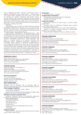 WWW.GHIDULPRIMARIILOR.RO JUDE%u021aUL VASLUI / 743tuturor angaja%u021bilor prim%u0103riei; - dotarea cu echipament IT&C %u00een vederea %u00eembun%u0103t%u0103%u021birii actului administrativ; - implementarea unui proiect pentru realizarea unei %u0219coli smart %u00een care copiii vor beneficia de mijloace inteligente educa%u021bionale precum manuale digitale, table interactive, bibliotec%u0103 virtual%u0103, catalog electronic sau o platform%u0103 prin care profesorii, elevii %u0219i p%u0103rin%u021bii pot interac%u021biona. Oferirea de solu%u021bii copiilor care, din motive medicale, lipsesc de la cursuri, ace%u0219tia put%u00e2nd s%u0103 asiste la ore conect%u00e2ndu-se de acas%u0103 la un sistem audio video EconomieDEZVOLTAREA UNUI CENTRU DE SPRIJIN PENTRU AFACERI DESCRIEREA PROIECTULUI: Proiectul are ca scop diversificarea serviciilor de sprijin pentru antreprenorii locali av%u00e2nd un prim obiectiv, acela de a facilita accesul acestora la informa%u021bii privind surse de finan%u021bare, oportunit%u0103%u021bi de afacereDEZVOLTAREA ABILIT%u0102%u021aILOR ANTREPRENORIALE PRIN OFERIREA DE ASISTEN%u021a%u0102 ANTE- %u0218I POST- INI%u021aIERE A UNEI AFACERI %u0218I ACORDAREA DE MICRO-GRANTURI PENTRU PERSOANE DIN COMUNA TUTOVA, AFLATE %u00ceN RISC DE S%u0102R%u0102CIE %u0218I EXCLUZIUNE SOCIAL%u0102 DESCRIEREA PROIECTULUI: Ideea deschiderii unei afaceri %u00een condi%u021biile ob%u021binerii unei subven%u021bii financiare este interesant%u0103 pentru majoritatea persoanelor chestionate %u00een comunit%u0103%u021bi. M%u0103suri propuse %u00een domeniul Antreprenoriatului: curs competen%u021be antreprenoriale; m%u0103suri de consiliere ante-post %u00eenfiin%u021bare afacere; concurs de planuri de afacere; subven%u021bionarea a planurilor de afacere; workshopuri pentru tinerii antreprenori %u2013 programe de finan%u021bare, utilizare software, responsabilitate social%u0103, %u00eencurajarea parteneriatelor %u00eentre %u00eentreprinderile nou-create %u0219i organiza%u021bii %u00eendreptate spre profit %u0219i organiza%u021bii non-profit; instruire pe teme privind dezvoltarea durabil%u0103 %u2013 Antreprenorul verde).MUNICIPIUL VASLUIAdres%u0103: Spiru Haret, nr. 2Telefon: 0235-310999, 313946; Fax: 0235-315946; Adresa de e-mail: pmv@primariavaslui.roURL: www.primariavaslui.roCOMUNA V%u0102LENIAdres%u0103: Sat V%u0103leni, Str. Principal%u0103, nr. 6Cod po%u0219tal: 737565Telefon: 0235-349633; Fax: 0372-893765; Adresa de e-mail: primaria@comuna-valeni.roURL: www.comuna-valeni.roPersoane din primarie:Primar: Radu BeliganViceprimar: Dumitru MoldovianuSecretar General : SanduDande%u0219 SanduContabil: Valentin LunguSate %u00een administra%u021bie:V%u0103leni, Moara Domneasc%u0103Suprafa%u021ba:%u00a0 3149 ha; Intravilan:%u00a0 293 ha; Extravilan:%u00a0 2856 ha; Popula%u021bia:%u00a05316; Gospod%u0103rii:%u00a02409; Locuin%u021be:%u00a02409; Gr%u0103dini%u021be:%u00a02; %u0218coli:%u00a02; Cum se ajunge in localitate:Pe ruta Vaslui %u2013 V%u0103leni, sau ruta Ia%u0219i %u2013 V%u0103leniLOCALIT%u0102%u021aILE %u00ceNFR%u0102%u021aITEVisoca%u00a0este un sat din%u00a0raionul Soroca,%u00a0Republica Moldova. Este amplasat la 40%u00a0km de la centrul raional%u00a0SorocaActivitati economice si specifice zonei:Cre%u0219terea animalelor, comer%u021b%u00a0 cu am%u0103nuntul, prelucrarea produselor de origine animal%u0103, activit%u0103%u021bi de service diverseFirme reprezentative:78 societ%u0103%u021bi comercialeProduc%u0103tori locali:115 produc%u0103tori localiProduse locale:Produse de origine animal%u0103; lapte, branza, cas, etc.Me%u0219te%u0219ugari:5 produc%u0103tori localiObiective turistice:Biserica de lemn Adormirea Maicii Domnului din sat V%u0103leni, comuna V%u0103leni, judetul VasluiEvenimente:Ziua satului V%u0103leni - 15 AugustFacilit%u00e3%u0163i oferite investitorilor:Terenuri pentru construc%u0163ii turistice %u015fi industrialeFacilit%u0103%u0163i fiscale oferite prin legeFor%u0163%u0103 de munc%u0103 local%u0103Proiecte de investi%u0163ii:Modernizare drumuri de interes local %u00een comuna V%u0103leni, jude%u021bul Vaslui%u00cenfiin%u021bare sistem de distribu%u021bie inteligent gaze naturale, comuna V%u0103leni, jude%u021bul VasluiDezvoltarea infrastructurii ITS %u00een comuna V%u0103leni, jude%u021b VasluiDotarea cu mobilier ,materiale didactice %u0219i echipamente didactice a %u0218c. Gimnaziale nr.1 V%u0103leniConstruire teren multisport din comuna V%u0103leni, jud. VasluiCOMUNA VETRI%u015eOAIACod po%u0219tal: 737570Telefon: 0235-432003; Fax: 0235-432016; Adresa de e-mail: primariavetrisoaia@yahoo.comcontact@primariavetrisoaia.roURL: www.primariavetrisoaia.roCOMUNA VII%u015eOARACod po%u0219tal: 737575Telefon: 0235-433060, 433011; Fax: 0235-433060; Adresa de e-mail: primaria_viisoara_vs@yahoo.comURL: www.primariaviisoara.roCOMUNA VINDEREICod po%u0219tal: 737585Telefon: 0235-434046, 434118; Fax: 0235-434046; Adresa de e-mail: vindereiprimaria@yahoo.comprimar@primariavinderei.roURL: https://www.primariavinderei.ro/COMUNA VOINE%u015eTICod po%u0219tal: 737595Telefon: 0235-347316, 347441; Fax: 0235-347441; Adresa de e-mail: primariavoinesti2007@yahoo.comURL: www.primariavoinesti.roCOMUNA VULTURE%u015eTICod po%u0219tal: 737615Telefon: 0235-457431; Fax: 0235-457431, 457830; Adresa de e-mail: primaria.vulturesti@yahoo.comURL: https://www.vulturesti-vaslui.ro/COMUNA VUTCANICod po%u0219tal: 737620Telefon: 0235-429031; Fax: 0235-429063; Adresa de e-mail: primariavutcani@yahoo.comURL: https://www.comunavutcani.ro/COMUNA Z%u0102PODENICod po%u0219tal: 737625Telefon: 0235-342216; Fax: 0235-342042; Adresa de e-mail: primaria_zapodeni_vaslui@yahoo.frURL: http://primariazapodeni.roCOMUNA ZORLENICod po%u0219tal: 737635Telefon: 0235-425000, 435756; Fax: 0235-425000; Adresa de e-mail: primarie@zorleni.ro , secretar@zorleni.ro ,sg.zorleni@gmail.comURL: www.zorleni.ro