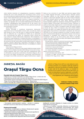 90 / JUDE%u021aUL BAC%u0102U WWW.GHIDULPRIMARIILOR.ROc%u0103tre m%u00e2inile minerilor, iar catapeteasma, icoanele %u015fi celelalte obiecte de cult au fost realizate prin contribu%u0163ia minei %u201eTrotu%u015f%u201d %u015fi a arhimandritului Epifanie Bulancea, de la M%u0103n%u0103stirea M%u0103gura Ocnei. Toate obiectele din sare au fost tratate cu un lac special, pentru a nu atrage umezeala %u015fi pentru a asigura rezisten%u0163a in timp. Biserica este destul de mare, puternic luminat%u0103, iar din interior nu lipse%u015fte nici unul dintre elementele de arhitectur%u0103 ortodox%u0103. Catapeteasma este alc%u0103tuit%u0103 din 24 de icoane, una dintre ele reprezent%u00e2nd-o pe Sf%u00e2nta Varvara, patroana spiritual%u0103 %u015fi ocrotitoarea minerilor.Salina T%u00e2rgu OcnaProfilul principal %u00eel constituie tratamentul afec%u0163iunilor respiratorii cum ar fi bron%u015fitele cronice, astm, sinuzite etc. Salina este situata la circa 2 km de ora%u0219, %u00een masivul de sare V%u00e2lcele, la 240 m ad%u00e2ncime pe o suprafa%u021b%u0103 de 13.000 mp %u0219i reprezint%u0103, prin microclimatul de salina, un important factor natural de cura utilizat %u00een terapia afec%u021biunilor respiratorii. Recunoa%u0219terea %u0219i utilizarea %u00een scop terapeutic a mediului de salina, cu prec%u0103dere %u00een ultimele decenii, a pornit de la o serie de observa%u021bii %u00eencep%u00e2nd %u00eenc%u0103 din secolul al XIX-lea. Salina ofer%u0103 condi%u021bii optime pentru: relaxare, mi%u0219care, tratarea afec%u021biunilor respiratorii, reculegere %u00een l%u0103ca%u0219ul sf%u00e2nt al bisericii ortodoxe %u201eSf%u00e2nta Varvara%u201d %u0219i cunoa%u0219tere %u00een cadrul Muzeului s%u0103rii.Monumentul M%u0103gura OcneiA fost ridicat %u00een memoria a celor peste 14000 de osta%u015fi rom%u00e2ni c%u0103zu%u0163i %u00een Primul R%u0103zboi Mondial (1916-1918) pe frontul de la OituzCo%u015fna-Cire%u015foaia. Este unic %u00een %u0163ar%u0103, at%u00e2t prin amplasament (504 m altitudine) %u015fi pe partea nord-estic%u0103 a Muntelui M%u0103gura, c%u00e2t %u015fi din punct de vedere architectural. Construirea Monumentului va %u00eencepe %u00een anul 1925, sub domnia regelui Ferdinand %u015fi a reginei Maria, %u015fi se va termina %u00een anul 1928, sub domnia regelui Mihai %u015fi a %u00cenaltei regen%u0163e domne%u015fti. Lucr%u0103rile pentru ridicarea acestui impun%u0103tor edificiu au fost f%u0103cute de c%u0103tre solda%u0163ii veterani, rama%u015fi %u00een via%u0163%u0103 dup%u0103 aprigele lupte de la Oituz-Co%u015fna-Cire%u015foaia. Fondurile necesare pentru aceast%u0103 construc%u0163ie au fost adunate prin subscrip%u0163ie public%u0103 de c%u0103tre Mihai Teodoru, ini%u0163iatorul acestui proiect, sprijinit de arhitectul Constantin Ciogolea, fiu al ora%u015fului stabilit la Bucure%u015fti. Monumentul Eroilor cuprinde un parter %u015fi dou%u0103 etaje, legate printr-o scar%u0103 interioar%u0103 circular%u0103, are o %u00een%u0103l%u0163ime de 22 m %u015fi este %u00een %u00eentregime ridicat din piatr%u0103 cioplit%u0103 %u015fi form%u0103 de obuz. P%u00e2n%u0103 la %u00eenceputul celui de-al Doilea R%u0103zboi Mondial, era p%u0103zit zi %u015fi noapte de osta%u015fii din garnizoana ora%u015fului. Dup%u0103 r%u0103zboi, Monumentul a fost l%u0103sat %u00een paragin%u0103, dar %u00eentre anii 1972-1974, el va fi renovat %u015fi deschis ca muzeu. La parter exist%u0103 o plac%u0103 comemorativ%u0103 depus%u0103 pe morm%u00e2ntul eroului necunoscut, descoperit %u00een tran%u015feele %u00eenc%u0103 vizibile de la Co%u015fna, cu un text emo%u0163ionant: Osta%u015fi ce a%u0163i c%u0103zut pentru %u0163ar%u0103, Viteji ai credin%u0163ei, solda%u0163i, Oriunde %u00een morminte voi sta%u0163i, V%u0103 fie %u0163%u0103r%u00e2na u%u015foar%u0103! (Eroilor c%u0103zu%u0163i %u00een r%u0103zboiul 1916-1919).De asemenea , exista si o serie de monumente comemorative:1.Monumentul Eroilor Independentei 1877 %u2013 18782.Cimitirul Eroilor de pe platoul Ciresoaia3.Cimitirul Eroilor de la Biserica Sfantul Nicolae4.Cimitirul si osuarul de la Poieni5.Monumentul eroilor sovieticiUn interes deosebit il constituie si cladirile si obiectivele cu valoare arhictonica %u0219i istoric%u0103:1. Administra%u021bia minei Salina -19112. Scoala nr. 2. 1868 %u2013 actual%u0103 anexa a Colegiului C. Negri3. Statia C.F.R. Targu Ocna %u2013 1884