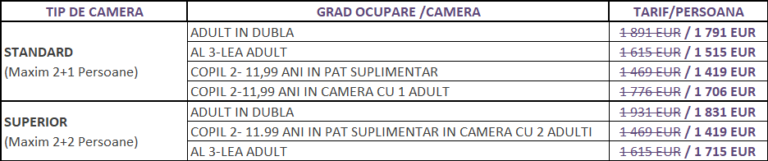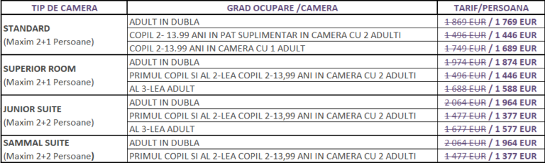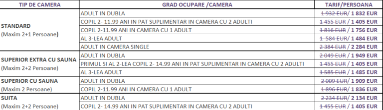 • Tarifele sunt calculate in euro pentru intregul sejur per persoana.