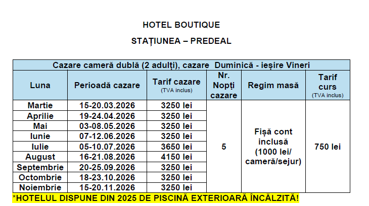 CURSURILE ORGANIZATE LA HOTELUL BOUTIQUE DIN STAȚIUNEA PREDEAL SUNT: