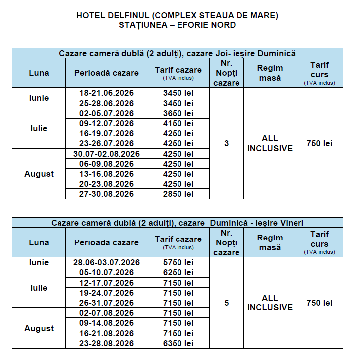 - 3 mese în sistem bufet suedez (servite în restaurantul Delfinul - modernizat în anul 2023).