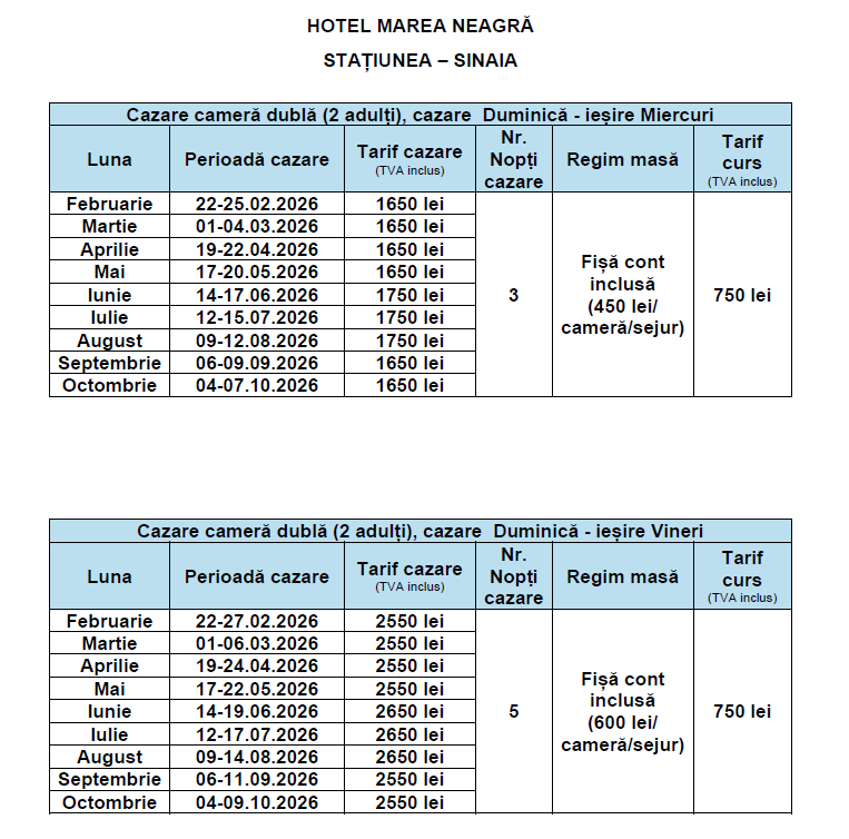 Regim masă: FIȘĂ CONT (600 lei/cameră/sejur) sau (450 lei/cameră/sejur)