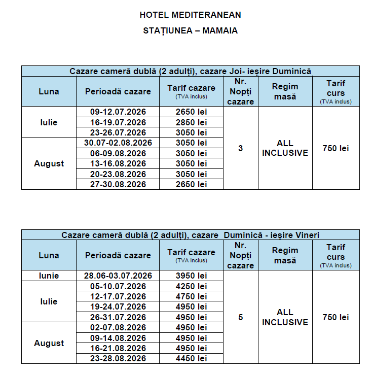Regim masă: ALL INCLUSIVE (mic dejun + prânz + cină + băuturi)