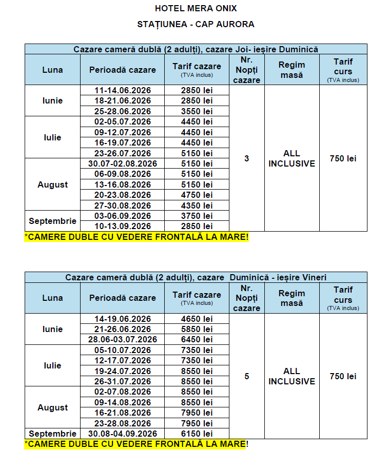 Regim masă: ALL INCLUSIVE (mic dejun, prânz, cină, gustare între mese)