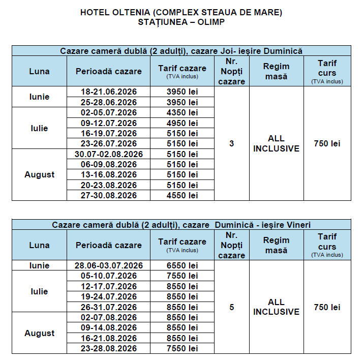 Regim masă: ALL INCLUSIVE (mic dejun, prânz, cină)
