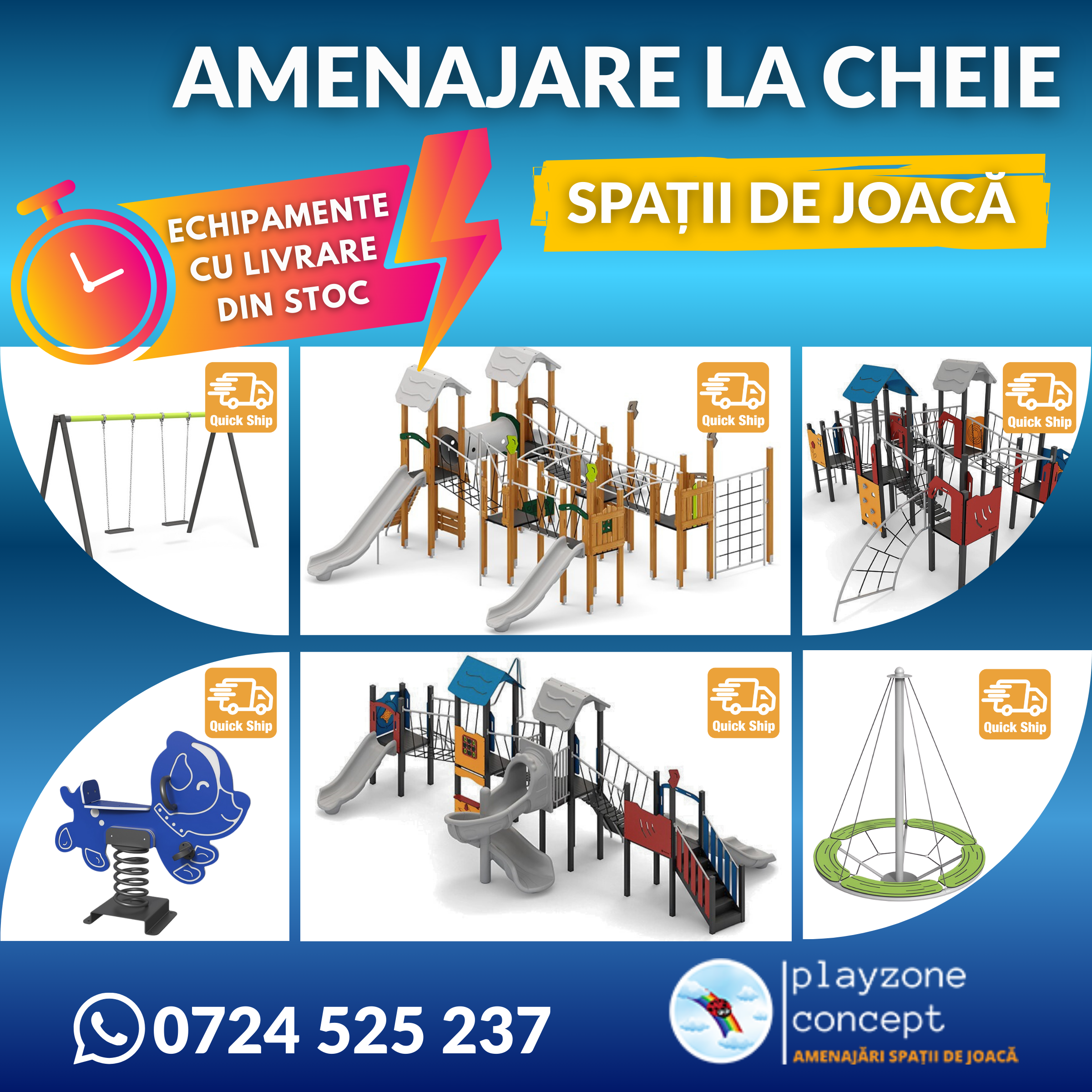 La Playzone Concept, introducem o categorie de STOC – livrare rapida dedicata de echipamente profesionale pentru spatii de joaca de exterior, disponibile cu livrare imediata, direct din stoc, cu termene de maximum 10 zile lucratoare. Quick Ship – este o solutie gandita pentru proiecte care necesita implementare intr-un termen scurt de timp, fara compromisuri in ceea ce priveste calitatea, siguranta si durabilitatea.Un avantaj major al gamei de echipamente disponibile prin Playzone Concept este diversitatea extinsa a solutiilor oferite, adaptate tuturor tipurilor de proiecte si categoriilor de varsta. Portofoliul include ansambluri de joaca cu structuri din lemn laminat sau metal, de la modele simple, dedicate celor mai mici copii cu varsta de peste 1 an, pana la configuratii complexe, cu multiple turnuri, tobogane spiralate, poduri mobile de trecere, pereti de escalada si franghii de catarare, destinate prescolarilor si copiilor de gimnaziu.