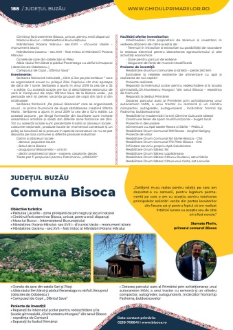 188 / JUDE%u021aUL BUZ%u0102U WWW.GHIDULPRIMARIILOR.ROCimitirul far%u0103%u00a0oseminte Bisoca, unicat, pentru eroii disparu%u021biMasa lui Bucur %u2013 %u00eentemeietorul Bucure%u0219tiuluiM%u0103n%u0103stirea Poiana M%u0103rului- sec.XVIII %u2013 sf.cuvios Vasile %u2013 monument istoricM%u0103n%u0103stirea Gavanu %u2013 sec.XVII %u2013 fost mitoc al M%u0103n%u0103stirii Poiana M%u0103ruluiOcnele de sare din satele Sari %u0219i Ple%u0219iAlbia r%u00e2ului Rm.S%u0103rat %u0219i p%u00e2r%u00e2ul Peceneaga cu v%u00e2rful Ulmu%u0219orul ( descries de Odobescu )Campusul de Copii ,, Sf%u00e2ntul Sava%u201cEvenimente:Serbarea folcloric%u0103%u00a0intitulat%u0103%u00a0,, C%u00e2nt %u0219i Joc pe plai str%u0103bun %u201c care se organizeaz%u0103%u00a0 anual cu prilejul Zilei Copilului c%u00e2t mai aproape de data de 1 Iunie. Serbarea a ajuns %u00een anul 2019 la cea de a 32 %u2013 a edi%u021bie. Cu aceast%u0103%u00a0ocazie are loc %u0219i deschiderea sezonului de var%u0103%u00a0 la Campusul de copii Sf%u00e2ntul Sava de la Bisoca unde , pe perioada verii %u00ee%u0219i petrec vacan%u021ba grupuri de copii din %u021bar%u0103%u00a0%u0219i din str%u0103inatateSerbarea folcloric%u0103%u00a0%u201ePe plaiuri Bisocene%u201c care se organizeaz%u0103 anual , %u00een prima Duminic%u0103%u00a0 de dup%u0103 s%u0103rb%u0103toarea cre%u0219tin%u0103%u00a0 Sf%u00e2nta Maria . Serbarea a ajuns %u00een anul 2019 la cea de a 52-a edi%u021bie. La aceast%u0103%u00a0ac%u021biune , pe l%u00e2ng%u0103%u00a0forma%u021biile din localitate sunt invitate ansambluri artistice %u0219i soli%u0219ti din diferite zone folclorice ale %u021b%u0103rii. Tot cu aceast%u0103%u00a0ocazie sunt prezentate tradi%u021bii %u0219i obiceiuri locale , costume na%u021bionale , produse locale iar momentul constituie %u0219i un prilej ca locuitorii s%u0103-%u0219i procure %u00een special zarzavaturi ce nu se pot dezvolta pe raza comunei %u0219i diferite produse industrialDatini %u0219i obiceiuri locale :- dansuri populare locale- Br%u00e2ul de la Bisoca- plugu%u0219orul Bisocenilor %u2013 unicat- datini cre%u0219tinesti %u0219i laice %u2013 na%u0219tere, casatorie, decesToate pot fi propuneri pentru Patrimoniu %u201eUNESCO%u201cFacilit%u00e3%u0163i oferite investitorilor:Intermedieri %u00eentre proprietarii de terenuri %u0219i investitori %u00een vederea ob%u021binerii de c%u0103tre ace%u0219tia de :- Terenuri %u00een intravilan %u0219i extravilan cu posibilit%u0103%u021bi de racordare la re%u021beaua electric%u0103%u00a0 pentru dezvoltarea agroturismului %u0219i alte activit%u0103%u021bi economice- Zone pentru parcuri de eoliene-%u00a0Asigurare de for%u021b%u0103%u00a0de munc%u0103%u00a0necalificat%u0103Proiecte de investi%u0163ii:Reabilitare drumuri comunale %u0219i s%u0103te%u021bti %u2013 peste 240 kmExtindere la re%u021belele existente de alimentare cu ap%u0103%u00a0 %u0219i realizarea de noi capt%u0103riProiecte realizateRepara%u021bii la Internatul %u0219colar pentru redeschidere %u0219i la %u0218coala gimnazial%u0103,,Gh.Munteanu Murgoci %u201cdin satul Bisoca %u2013 re%u0219edin%u021ba de Comun%u0103Repara%u021bii la Sediul Prim%u0103rieiDotarea parcului auto al Prim%u0103riei prin achizi%u021bionarea unui autocamion MAN, a unui tractor cu remorc%u0103%u00a0 %u0219i un cilindru compactor, autogreder, autogunoier%u0103%u00a0 , %u00eenc%u0103rc%u0103tor frontal tip Fadroma, buldoexcavatorReabilit%u0103ri %u0219i moderniz%u0103ri la trei C%u0103mine Culturale s%u0103te%u0219tiConstruire teren de sport multifunc%u021bional %u2013 buget localProiecte %u00een deruralareAlimentare cu Ap%u0103%u00a0satele Recea %u0219i S%u0103rile %u2013 PNDL 2Reabilitare Drum Comunal 199 Recea - Anghel SalignyProiecte de viitorReabilitare Drum Comunal 161 S%u0103rile-Bisoca - CNIReabilitare Drum Comunal 170 Plesi-Bisoca - CNI%u00cenfiin%u021bare serviciu propriu Ap%u0103-SalubrizareReabilitare Drum S%u0103tesc 161Reabilitare Drum S%u0103tesc%u00a0Lop%u0103t%u0103reasaReabilitare Drum S%u0103tesc%u00a0C%u0103tunu Rudarui, satul S%u0103rileReabilitare Drum S%u0103tesc C%u0103tununul Coita, sat Lacurile