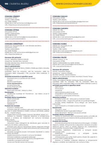 192 / JUDE%u021aUL BUZ%u0102U WWW.GHIDULPRIMARIILOR.ROCOMUNA C%u0102NE%u015eTICod po%u0219tal: 127135Telefon: 0338-408356; Fax: 0338-408356; Adresa de e-mail: primariacanesti@yahoo.comURL: https://www.comunacanesti.ro/COMUNA C%u0102TINACod po%u0219tal: 127145Telefon: 0238-504003; Fax: 0238-504430; Adresa de e-mail: primaria@primariacatinabz.roURL: www.primariacatinabz.roCOMUNA CERN%u0102TE%u015eTIAdres%u0103: Str. Principal%u0103 ZN, Nr. 1, Sat Z%u0103rne%u0219tii de Sl%u0103nicCod po%u0219tal: 127150Telefon: 0238-508001; Fax: 0238-750398; Adresa de e-mail: primariacernatesti@yahoo.comURL: https://cernatesti.ro/Persoane din primarie:Primar: %u00a0Sebastian%u00a0Valentin%u00a0St%u0103nil%u0103%u00a0Viceprimar: Nicolae Doru%u00a0Samoil%u0103Secretar General: Doru Vasile DumitrascuContabil: Stela CaloianSate %u00een administra%u021bie:Cern%u0103te%u015fti, Z%u0103rne%u015ftii de Sl%u0103nic, Vl%u0103deni, C%u0103ld%u0103ru%u015fa, Aldeni, Manasia, Fulga, B%u0103e%u015ftiSuprafa%u021ba:%u00a0 5043 ha; Intravilan:%u00a0 463 ha; Extravilan:%u00a0 4580 ha; Popula%u021bia:%u00a0 3659; Gospod%u0103rii:%u00a0 1718; Locuin%u021be:%u00a0 1502; Gr%u0103dini%u021be:%u00a0 3; %u0218coli:%u00a01; Activitati economice si specifice zonei:Procesare lemn %u0219i a produc%u021biei de mobil%u0103Comer%u021b Mor%u0103rit %u0219i panifica%u021bieFirme reprezentative:SC Romvitrine SRL SC leu Prod Com SRL%u00a0Obiective turistice:Rezerva%u021bie natural%u0103 - Dealul cu lilieciEvenimente:S%u0103rb%u0103toarea localit%u0103%u021bii SF. Pantelimon , Sat Aldeni, anual %u00een data: 27 iulieFacilit%u00e3%u0163i oferite investitorilor:Spa%u021bii comercialeAp%u0103 curent%u0103Drumuri bune TelelefonieProiecte de investi%u0163ii:Proiecte %u00een desf%u0103%u0219urare%u00cenfiin%u021bare re%u021bea de canalizare ap%u0103%u00a0uzat%u0103%u00a0menajera%u0103 %u0219i sta%u021bie de epurare %u00een satele Manasia %u0219i Aldeni, comuna Cern%u0103te%u0219ti, jude%u021bul Buz%u0103u - Anghel SalignyModernizare iluminat public Comuna Cern%u0103te%u0219ti, etapa I %u0219i IIDotarea cu mobilier, materiale didactice %u0219i echipamente digitale a unit%u0103%u021bilor de %u00eenv%u0103%u021b%u0103m%u00e2nt din comuna Cern%u0103te%u0219ti, Jude%u021bul Buz%u0103uProiecte propuse:Dezvoltare re%u021bea inteligent%u0103 de distribu%u021bie gaze naturale %u00een comuna Cern%u0103te%u0219ti, jude%u021bul Buz%u0103u%u00cenfiin%u021bare parc panouri fotovoltaice pentru asigurare energie electric%u0103, iluminat public %u0219i cl%u0103diri administrative de interes public (prim%u0103rie, %u0219coal%u0103, etc)Eficien%u021b%u0103 energetic%u0103 %u0218coala Gimnazial%u0103 Cern%u0103te%u0219ti %u0219i sediul Prim%u0103riei Cern%u0103te%u0219tiModernizare drumuri locale %u00een comuna Cern%u0103te%u0219ti%u00cenfiin%u021bare Gr%u0103dini%u021ba cu program prelungitAmenajare %u0219i dotare parcuri de joac%u0103 %u0219i de agreementGr%u0103dini%u021b%u0103 cu program prelungit Construire Pod de trecere Sat ManasiaCOMUNA CHILIILECod po%u0219tal: 127160Telefon: 0371-352013; Adresa de e-mail: primariachiliilebuzau@yahoo.comURL: https://www.primariachiliile.ro/COMUNA CHIOJDUAdres%u0103: Nr. 396Cod po%u0219tal: 127170Telefon: 0238-799618; Fax: 0238-799500; Adresa de e-mail: primariachiojdu@yahoo.comURL: www.comunachiojdu.roCOMUNA CILIBIAAdres%u0103: Str. Principal%u0103, Nr. 65Cod po%u0219tal: 127180Telefon: 0786-140310; Adresa de e-mail: primarcilibia@yahoo.comURL: www.comunacilibia.roCOMUNA CISL%u0102UAdres%u0103: Culturii, nr. 64Cod po%u0219tal: 127185Telefon: 0238-501580; Fax: 0238- 501363; Adresa de e-mail: primarie@primariacislau.roURL: www.primariacislau.roPersoane din primarie:Primar: Constantin Mu%u015fatViceprimar : Valentin Mih%u0103il%u0103Secretar General :%u00a0Dorina Diaconu%u00a0Inspector cu atributii de contabil:%u00a0Ana Maria Tatiana Tailup%u00a0Sate %u00een administra%u021bie:Cisl%u0103u, Gura-B%u00e2scei, B%u0103r%u0103%u015fti, Sc%u0103ri%u015foara, Buda-Cr%u0103ciune%u015ftiSuprafa%u021ba:%u00a0 6199 ha; Intravilan:%u00a0 329 ha; Extravilan:%u00a0 5870 ha; Popula%u021bia:%u00a04697; Gospod%u0103rii:%u00a01666; Locuin%u021be:%u00a02090; Gr%u0103dini%u021be:%u00a04; %u0218coli:%u00a03; Activitati economice si specifice zonei:Agricultur%u0103Pomicultur%u0103ZootehnieAdiministra%u0163ie public%u0103 local%u0103Gospod%u0103rire comunal%u0103 %u015fi locatar%u0103Urbanism %u015fi amenajarea teritoriuluiObiective turistice:Complex turistic 2D - restaurant %u015fi motel de 3 steleHerghelia Cisl%u0103u - singura din %u0163ar%u0103 de cai purs%u00e2nge englezRuinele Cet%u0103%u0163ii Medievale %u201cD-na Neaga%u201d din satul BudaCr%u0103ciune%u015ftiZon%u0103 montan%u0103 cu 12 trasee turistice marcateEvenimente:T%u00e2rg zilnic, vineriS%u0103rb%u0103toarea local%u0103 %u201cLegendele Cisl%u0103ului%u201dPe 20 decembrie - festival-concurs de colindeFacilit%u00e3%u0163i oferite investitorilor:Terenuri %u015fi construc%u0163ii spre concesionare pentru activit%u0103%u0163i de prelucrarea lemnului %u015fi industria textil%u0103, produse petroliereFacilit%u0103%u0163i fiscaleProiecte de investi%u0163ii:Achizi%u021bia de echipamente din domeniul tehnologiei - it mobile, respectiv tablete, echipamente %u015fi dispozitive necesare activit%u0103%u021bii didactice pentru elevii %u015fi cadrele didactice din %u00eenv%u0103%u0163%u0103m%u00e2ntul preuniversitar, Comuna Cisl%u0103u, Jude%u021bul Buz%u0103uExtindere, reabilitare, modernizare %u0219i echipare %u0218coala Gimnaziala Cisl%u0103uReabilitare, modernizare %u0219i echipare %u0218coala Gimnazial%u0103%u00a0Sc%u0103ri%u0219oaraAchizi%u021bionarea unui utilaj mobil pentru situa%u021bii de urgen%u021b%u0103 %u00een comuna Cisl%u0103u, jude%u021bul Buz%u0103uDotarea cu mobilier, materiale didactice %u015fi echipamente digitale a unit%u0103%u021bilor de %u00eenv%u0103%u021b%u0103m%u00e2nt din comuna Cisl%u0103u