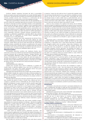 194 / JUDE%u021aUL BUZ%u0102U WWW.GHIDULPRIMARIILOR.ROConform datelor statistice furnizate de INS %u015fi autorit%u0103%u0163ile locale, la nivelul comunei functioneaz%u0103 un num%u0103r de 68 de agen%u0163i economici. Domeniile de activitate sunt diversificate (agricultur%u0103, comer%u0163, prest%u0103ri servicii, etc). Comer%u0163ul cu am%u0103nuntul (24 de agen%u0163i economici) %u015fi agricultura sunt principalele activit%u0103%u0163i.Agricultura practicat%u0103 %u00een prezent este una de subzisten%u0163%u0103, un procent ridicat din suprafa%u021ba agricol%u0103 se lucreaz%u0103 %u00een form%u0103 privat%u0103 iar restul %u00een asocia%u021bii lucrative. Suprafa%u0163a medie a unei exploata%u0163ii agricole este de 350 HA. Av%u00e2nd %u00een vedere c%u0103 din suprafa%u021ba total%u0103 a 114 comunei de 7685 hectare, 6832 ha este teren agricol, se poate concluziona c%u0103 exist%u0103 posibilit%u0103%u021bi pentru practicarea unei agriculturi performante %u00een G%u0103lbina%u015fi. Produc%u021bia agricol%u0103, at%u00e2t cea total%u0103 c%u00e2t %u0219i cea medie, are valori constant %u00een ultima perioada %u00een cazul majorit%u0103%u021bii culturilor. Aceast%u0103 evolu%u021bie constant%u0103 este %u00een corela%u021bie cu p%u0103strarea suprafe%u021belor cultivate efectiv din aceea%u0219i perioad%u0103 fapt ce sugereaz%u0103 c%u0103 multe dintre suprafe%u021be sunt cultivate %u015fi nu au o alta destina%u021bie. Comer%u021bul %u00een aceast%u0103 zon%u0103 este reprezentat de 68 de firme, conform datelor furnizate de INS. Serviciile oferite pe raza comunei G%u0103lbina%u015fi sunt diversificate, f%u0103r%u0103 a acoperi %u00eentreaga gam%u0103 necesar%u0103. Astfel oferta de servicii este dominat%u0103 de: alimenta%u021bie public%u0103, comer%u0163, activit%u0103%u021bi de comer%u0163 cu am%u0103nuntul. Din punct de vedere al serviciilor necesare pentru desf%u0103%u0219urarea de activit%u0103%u021bi economice este necesar%u0103 existen%u0163a societ%u0103%u021bilor bancare precum, BCR, BRD, Banca Transilvania, Raiffeisen Bank, CEC, etc.Obiective turistice:Principalele obiective turistice ale Jude%u021bului Buz%u0103u lacul Vulturilor numit %u0219i Lacul F%u0103r%u0103 Fund, format %u00een perioada periglaciar%u0103, Vulcanii Noroio%u0219i de la Dealurile P%u00e2clelor, C%u00e2mpul Roman din satul Pietroasele, Biblioteca Vasile Voiculescu fondat%u0103 %u00een 1893, Muzeul Chihlimbarului din Col%u021bi, tab%u0103ra de var%u0103 de Sculptur%u0103 %u00een aer liber de la M%u0103gura, cu peste 256 sculpturi de piatr%u0103 realizate %u00een 16 edi%u021bii, Tezaurul de la Pietroasele (%u201eClo%u0219ca cu Puii de Aur%u201d) %u00een 1837 pe dealul Istri%u021ba, Mina de petrol din sta%u021biunea S%u0103rata Monteoru.Tradi%u021bii localeCasa %u0163%u0103r%u0103neasc%u0103 din G%u0103lbina%u1e63iCasele erau scunde (circa 2,25 m %u00een%u0103l%u021bime), cu pere%u021bii din nuiele, lipite cu p%u0103m%u00e2nt galben, erau mai mici la %u00een%u00e2l%u021bime %u0219i cu acoperi%u0219urile mai plate, fiind astfel adaptate climei mai putin ploioase %u0219i cu curen%u021bi mai puternici (v%u00e2ntul).Tipologia este asem%u0103n%u0103toare (locuin%u021belor de munte %u0219i deal), cu dou%u0103 %u00eenc%u0103peri situate de o parte %u0219i de alta a chilerului (sala) %u0219i cu polata sau cu pola%u021bi pe lungimea sau l%u0103timea casei. Pe fa%u021b%u0103 sau pe una dintre laturi, uneori pe am%u00e2ndou%u0103, era prispa inchis%u0103 cu galerie sau deschis%u0103.Temelia casei era din grinzi de lemn sprijinit%u0103 pe c%u00e2te o bucat%u0103 (sau buc%u0103%u021bi) de piatr%u0103 la col%u021buri. Pere%u021bii erau ridica%u021bi pe furci %u0219i umplu%u021bi cu pam%u00e2nt prins %u00een astereal%u0103 sau din chirpici f%u0103cu%u021bi din p%u0103m%u00e2nt amestecat cu paie, turna%u021bi %u00een form%u0103, usca%u021bi %u0219i apoi zidi%u021bi. Peste pere%u021bi se a%u0219eza acoperi%u0219ul. %u00cen zona lacurilor %u0219i b%u0103l%u021bilor, casele %u0219i anexele erau acoperite cu stuf (rogoz) care se g%u0103sea din abunden%u021b%u0103 %u00een zon%u0103 %u0219i care era un izolant termic foarte eficient at%u00e2t iarna, c%u00e2t %u0219i vara. Nu se poate face o diferen%u021biere categoric%u0103 %u00eentre locuin%u021ba din zonele de munte, deal %u0219i c%u00e2mpie %u00eentruc%u00e2t str%u00e2nsele rela%u021bii economice %u0219i de rudenie dintre locuitori au f%u0103cut ca multe elemente s%u0103 circule dintr-o zon%u0103 %u00eentr-alta, fie pornind de la preten%u021biile comanditarilor, fie folosind aceia%u0219i me%u0219teri. Putem concluziona c%u0103 amplasamentul, dimensiunea, decorul %u0219i calitatea materialelor de construc%u021bie reflectau starea material%u0103 %u0219i gustul proprietarului comanditar.Mobilierul: casele t%u0103r%u0103ne%u0219ti din zon%u0103 aveau mobilier simplu, rezum%u00e2ndu-se numai la necesar. %u00cen c%u0103mara %u2015de locuit%u00a0se g%u0103sea obligatoriu o mas%u0103 %u00eenalt%u0103 (de multe ori %u00eenfundat%u0103), un dulap de perete, iar deasupra sobei cu plit%u0103 se g%u0103sea un gr%u0103tar cu poli%u021b%u0103 pe care se prindeau vasele. %u00cen camer%u0103 se aflau dou%u0103 %u2013 trei paturi dup%u0103%u00a0necesitatea familiei, a%u0219ezate %u00een jurul peretilor %u0219i l%u0103zi folosite drept canapele %u0219i pentru depozitare.-%u00a0 Casa mare%u00a0 era folosit%u0103 pentru p%u0103strarea lucrurilor %u2015de zestre%u00a0%u0219i pentru g%u0103zduirea unor musafiri de seam%u0103. De obicei nu avea sob%u0103, dar dac%u0103 se punea soba aceasta era din zid, f%u0103r%u0103 plit%u0103 %u0219i lipit%u0103 de peretele dinspre sal%u0103. %u00cen camer%u0103 erau dou%u0103 paturi, %u00eentre ele o mas%u0103 %u00eenalt%u0103, la cap%u0103tul paturilor c%u00e2te o lad%u0103 de zestre, iar %u00een col%u021bul opus sobei, un cuier sau un dulap.Sala (tinda) era camera de legatur%u0103 %u00eentre cele dou%u0103 camere %u0219i exterior. Uneori tot din sal%u0103 s