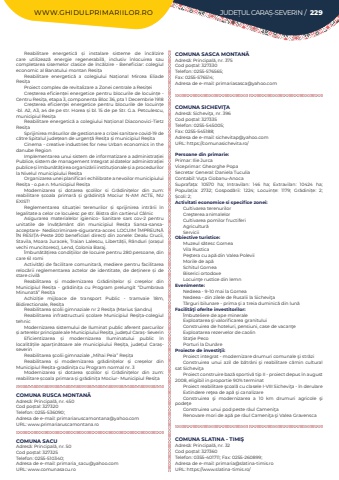WWW.GHIDULPRIMARIILOR.RO JUDE%u021aUL CARA%u0218-SEVERIN / 229Reabilitare energetic%u0103%u00a0 %u0219i instalare sisteme de %u00eenc%u0103lzire care utilizeaz%u0103%u00a0 energie regenerabil%u0103, inclusiv %u00eenlocuirea sau completarea sisemelor clasice de %u00eenc%u0103lzire - Beneficiar: colegiul economic al Banatului montan Resi%u021baReabilitare energetic%u0103 a colegiului Na%u021bional Mircea Eliade Resi%u021baProiect complex de revitalizare a Zonei centrale a Resi%u021beiCre%u0219terea eficien%u021bei energetice pentru blocurile de locuin%u021be - Centru Resi%u021ba, etapa 3, componenta Bloc 36, pta 1 Decembrie 1918Cre%u0219terea eficien%u021bei energetice pentru blocurile de locuin%u021be -bl. A2, A3, a4 de pe str. Horea %u0219i bl. 15 de pe Str. G.a. Petculescu, municipiul Resi%u021baReabilitare energetic%u0103%u00a0a colegiului Na%u021bional Diaconovici-Tietz Resi%u021ba Sprijinirea m%u0103surilor de gestionare a crizei sanitare covid-19 de c%u0103tre Spitalul jude%u021bean de urgen%u021b%u0103%u00a0Resi%u021ba %u0219i municipiul Re%u0219itaCinema - creative industries for new Urban economics in the danube RegionImplementarea unui sistem de informatizare a administra%u021biei Publice, sistem de management Integrat al datelor administra%u021biei publice %u0219i %u00eembun%u0103t%u0103%u021birea organiz%u0103rii institu%u021bionale %u0219i a procedurilor la Nivelul municipiului Resi%u021baOrganizarea unei planificari echilibrate a nevoilor municipiului Resi%u021ba - o.p.e.n. Municipiul Resi%u021baModernizarea %u0219i dotarea %u0219colilor si Gr%u0103dini%u021belor din zum: reabilitare %u0219coala primar%u0103%u00a0 %u0219i gr%u0103dini%u021b%u0103%u00a0 Mociur N-AM ACTE, NU EXIST!Reglementarea situa%u021biei terenurilor %u0219i sprijinirea intr%u0103rii %u00een legalitate a celor ce locuiesc pe str. Bistra din cartierul C%u00e2lnicAsigurarea materialelor igienico- Sanitare sars cov-2 pentru unitatile de %u00eenv%u0103%u021b%u0103m%u00e2nt din municipiul Resi%u021ba Sansa-sansaacceptare- Nediscriminare-siguranta-acces LOCUIM %u00ceMPREUN%u0102 %u00ceN RESI%u021aA-Peste 200 beneficiari direc%u021bi din zonele: Dealu Crucii, Stavila, Moara Juracek, Traian Lalescu, Libert%u0103%u021bii, R%u00e2nduri (ora%u0219ul vechi muncitoresc), Lend, Colonia Baraj.%u00cembun%u0103t%u0103%u021birea condi%u021biilor de locuire pentru 280 persoane, din care 61 romiActivit%u0103%u021bi de facilitare comunitar%u0103, mediere pentru%u00a0facilitarea reloc%u0103rii reglementarea actelor de identitate, de de%u021binere %u0219i de stare civil%u0103Reabilitarea %u0219i modernizarea Gr%u0103dini%u021belor %u0219i cre%u0219elor din Municipiul Resi%u021ba - gr%u0103dini%u021ba cu Program prelungit %u201cDumbrava Minunat%u0103%u201d Resi%u021baAchizi%u021bie mijloace de transport Public - tramvaie 18m, Bidirectionale, Resi%u021baReabilitarea %u0219colii gimnaziale nr 2 Resi%u021ba (Marius %u0218andru)Reabilitarea infrastructurii %u0219colare Municipiul Re%u0219i%u021ba-colegiul tehnicModernizarea sistemului de Iluminat public aferent parcurilor %u0219i arterelor principale ale Municipiului Re%u0219i%u021ba, jude%u021bul%u00a0Cara%u0219- SeverinEficientizarea %u0219i modernizarea Iluminatului public %u00een localit%u0103%u021bile apar%u021bin%u0103toare ale municipiului Re%u0219i%u021ba, jude%u021bul Cara%u0219severinReabilitarea %u015fcolii gimnaziale %u201eMihai Peia%u201d Re%u0219i%u021baReabilitarea %u0219i modernizarea gr%u0103dini%u021belor %u0219i cre%u0219elor din Municipiul Re%u0219ita-gradini%u021ba cu Program normal nr. 3Modernizarea %u0219i dotarea %u0219colilor %u0219i Gr%u0103dini%u021belor din zum: reabilitare %u0219coala primara %u0219i gr%u0103dini%u021ba Mociur- Municipiul Resi%u021baCOMUNA RUSCA MONTAN%u0102Adres%u0103: Principal%u0103, nr. 450Cod po%u0219tal: 327320Telefon: 0255-536090; Adresa de e-mail: primariaruscamontana@yahoo.comURL: www.primariaruscamontana.roCOMUNA SACUAdres%u0103: Principal%u0103, nr. 50Cod po%u0219tal: 327325Telefon: 0255-510340; Adresa de e-mail: primaria_sacu@yahoo.comURL: www.comunasacu.roCOMUNA SASCA MONTAN%u0102Adres%u0103: Principal%u0103, nr. 375Cod po%u0219tal: 327330Telefon: 0255-576565; Fax: 0255-576514; Adresa de e-mail: primariasasca@yahoo.comCOMUNA SICHEVI%u0162AAdres%u0103: Sichevi%u0163a, nr. 396Cod po%u0219tal: 327335Telefon: 0255-545005; Fax: 0255-545188; Adresa de e-mail: sichevitap@yahoo.comURL: https://comunasichevita.ro/Persoane din primarie:Primar:%u00a0Ilie JurcaViceprimar: Gheorghe PopaSecretar General: Daniela TuculiaContabil: Vu%u0163a Ciobanu-AnocaSuprafa%u021ba:%u00a0 10570 ha; Intravilan:%u00a0 146 ha; Extravilan:%u00a0 10424 ha; Popula%u021bia:%u00a0 2732; Gospod%u0103rii:%u00a0 1224; Locuin%u021be:%u00a0 1179; Gr%u0103dini%u021be:%u00a0 2; %u0218coli:%u00a02; Activitati economice si specifice zonei:Cultivarea terenurilorCre%u015fterea animalelorCultivarea pomilor fructiferiAgricultur%u0103Servicii%u00a0Obiective turistice:Muzeul s%u0103tesc GorneaVila RusticaPe%u015ftera cu ap%u0103 din Valea PoleviiMorile de ap%u0103Schitul GorneaBiserici ortodoxeLocuin%u0163e rustice din lemnEvenimente:Nedeea - 9-10 mai la GorneaNedeea - din zilele de Rusalii la Sichevi%u0163aT%u00e2rguri bilunare - prima %u015fi a treia duminic%u0103 din lun%u0103Facilit%u00e3%u0163i oferite investitorilor:%u00cembuteliere de ape mineraleExploatarea %u015fi valorificarea granituluiConstruirea de hoteluri, pensiuni, case de vacan%u0163eExploatarea rezervelor de caolinSta%u0163ie PecoPorturi la Dun%u0103reProiecte de investi%u0163ii:Proiect integrat - modernizare drumuri comunale %u015fi str%u0103ziConstruirea unui azil de b%u0103tr%u00e2ni %u015fi reabilitare c%u0103min cultural sat Sichevi%u0163aProiect construire baz%u0103 sportiv%u0103 tip II - proiect depus %u00een august 2008, eligibil in proportie 90% terminatProiect reabilitare %u015fcoal%u0103 cu clasele I-VIII Sichevi%u0163a - %u00een derulareExtindere re%u0163ea de ap%u0103%u00a0%u015fi%u00a0canalizareC