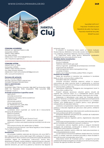 WWW.GHIDULPRIMARIILOR.RO 249Suprafa%u021b%u0103: 6.674 km%u00b2Popula%u021bie: 724.605 locuitoriRe%u0219edin%u021b%u0103 de jude%u021b: Cluj-NapocaPopula%u021bia re%u0219edin%u021bei de jude%u021b: 333.607 locuitoriJUDE%u021aULClujCOMUNA AGHIRE%u015eUAdres%u0103: Loc. Aghiresu Fabrici nr.86Cod po%u0219tal: 407010Telefon: 0264-358001; Fax: 0264-357252; Adresa de e-mail: rimaria@aghiresu.roURL: http://www.aghiresu.roCOMUNA AITONAdres%u0103: Morii, nr. 419/ACod po%u0219tal: 407025Telefon: 0264-310400, 310404; Fax: 0264-310400, 310404; Adresa de e-mail: comunaaiton2013@gmail.comURL: www.primariaaiton.roPersoane din primarie:Primar: Nicolae F%u0103g%u0103darSecretar General: Oltean Gabriel IoanContabil: Potoapea Daniela MariaSate %u00een administra%u021bie:Aiton, RediuSuprafa%u021ba:%u00a04596, 7736 ha; Intravilan:%u00a0288, 5267 ha; Extravilan:%u00a04308, 2469 ha; Popula%u021bia:%u00a0 1000; Gospod%u0103rii:%u00a0 1786; Locuin%u021be:%u00a0 898; Gr%u0103dini%u021be:%u00a01; %u0218coli:%u00a01; Activitati economice si specifice zonei:Agricultur%u0103 Activit%u0103%u0163i economiceCre%u015fterea animalelor, ferme zootehniceCultur%u0103 mareAlimenta%u0163ie public%u0103Firme reprezentative:SC TRANSAVIA SA, jude%u0163 AlbaSC GCB CONS&FIN SRLObiective turistice:Localitatea Aiton cuprinde un num%u0103r de 3 monumente istorice %u015fi de arhitectur%u0103:Biserica ortodox%u0103Biserica reformat%u0103Biserica Greco-catolic%u0103Frasinul de peste 300 de ani, Drumul CruciiRezerva%u0163ia %u2018%u2019P%u0103durea Ciolt%u2019%u2019 - obiectiv turistic naturalMiliarium-ul Aiton care atest%u0103 existen%u0163a localit%u0103%u0163ii %u00eenc%u0103 din anul 102 e.n.Monumentul Eroilor din satele Aiton %u015fi RediuRuinele Drumului Roman care f%u0103cea lega%u0103tura %u00eentre Drobeta Turnu Severin %u015fi NapocaCastelul Medieval %u015eandor BelaEvenimente:C%u00e2t prive%u015fte tradi%u0163iile na%u0163ionale ale Aitonului, din anul 2007 a fost rdeschis pentru prima dat%u0103 dup%u0103 1970, serbarea Fii Satului. De asemenea %u00een Aiton oamenii sunt profund ocupa%u0163i de p%u0103strarea tradi%u0163iilor legate de s%u0103rb%u0103toarea Cr%u0103ciunului, Anului Nou, Boboteaz%u0103 %u015fi Pa%u015ftele. Aceste s%u0103rb%u0103tori reprezint%u0103 pentru aitoneni un bun prilej de a face leg%u0103tura %u00eentre via%u0163a prezent%u0103 a satului %u015fi datinile str%u0103vechi, pe care%u00a0le-au p%u0103strat %u015fi transmis mai departe str%u0103mo%u015fii no%u015ftrii%u00cen prezent %u00een localitatea Aiton exist%u0103 un C%u0103min Cultural, Muzeul Satului, Biblioteca Comunal%u0103, %u015ecoala General%u0103 cu clasele I-VI, Gr%u0103dini%u0163a, Dispensar Veterinar, Farmacia, Poli%u0163ia%u00cen organizare avem pia%u0163a pentru desfacerea produselor agroalimentare ale produc%u0103torilor localiFacilit%u00e3%u0163i oferite investitorilor:Infrastructur%u0103 bun%u0103Drumuri asfaltateTelefonie, electricitate, gaz, ap%u0103Terenuri agricole - posibilit%u0103%u0163i de achizi%u0163ionare, %u00eenchiriereOrganizare de v%u00e2n%u0103toareZone de agrement (zona metropolitan%u0103 Cluj)Localit%u0103%u0163i %u00eenfr%u0103%u0163ite:Dabas, or%u015f %u00een districtul Dabas, jude%u0163ul Pesta, UngariaProiecte de investi%u0163ii:Re%u021bea de canalizare %u0219i racorduri de canalizare %u00een localitate Rediu %u0219i Aiton, comuna Aiton, jude%u021bul ClujExtindere re%u021bea de canalizareAchizi%u021bie microbuz nepoluat (electric) utilizat %u00een scopuri comunitare de c%u0103tre comuna Aiton %u00een parteneriat cu comuna Feleacu %u0219i comuna Tureni %u0219i montajul a dou%u0103 sta%u021bii de re%u00eenc%u0103rcare %u00een comuna Aiton, jude%u021bul ClujDezvoltarea sistemelor inteligente de management local %u00een comuna Aiton, jude%u021bul ClujProiect%u201d dotarea serviciului voluntar pentru situa%u021bii de urgen%u021b%u0103%u00a0 din comuna Aiton cu o autospeciala pentru prima interven%u021bie%u201d, finan%u021bat prin fonduri Feader, submasura 19.2-m1/6bElaborarea %u0219i dezvoltarea unei cereri de finan%u021bare pentru proiectul%u201c dotarea cu mobilier, materiale didactice %u0219i echipamente digitale a unit%u0103%u021bilor de %u00eenv%u0103%u021b%u0103m%u00e2nt preuniversitar %u0219i a unit%u0103%u021bilor conexe%u201d, prin PNRR-pilonul vi.-Politici pentru noua genera%u021biecomponenta c15: educa%u021bie-reformaCre%u0219terea competen%u021belor digitale pentru exercitarea func%u021biei publice %u0219i educa%u021bie digital%u0103 pe parcursul vie%u021bii pentru cet%u0103%u021beni/investi%u021biaEchiparea laboratoarelor informatice din %u0219colile de educa%u021bie %u0219i formare profesional%u0103 (EFP) %u0219i \\investi%u021biaEchiparea atelierelor de practic%u0103 din unit%u0103%u021bile de %u00eenv%u0103%u021b%u0103m%u00e2nt profesional %u0219i tehnic %u0219i reformaAdoptarea cadrului legislativ pentru digitalizarea educa%u021biei\\ investi%u021biaAsigurarea echipamentelor %u0219i a resurselor tehnologice digitale pentru unit%u0103%u021bile de %u00eenv%u0103%u021b%u0103m%u00e2nt precum %u0219i reformaActualizarea cadrului legislativ pentru a asigura standarde ecologice de proiectare, construc%u021bie %u0219i dotare %u00een sistemul de %u00eenv%u0103%u021b%u0103m%u00e2nt preuniversitar\\ investi%u021biaAsigurarea dot%u0103rilor pentru s%u0103lile de clas%u0103 preuniversitare %u0219i laboratoarele/atelierele %u0219colareLucr%u0103ri tehnico-economice edilitare (re%u021bele electrice, iluminat public, %u0219i utilit%u0103%u021bi, re%u021bea de canalizare pluvial%u0103) %u0219i re%u021bea stradal%u0103%u00a0%u00een zona de locuin%u021be concesionate, zona CioltDepunerea cererii de finan%u021bare pentru %u201c programul privind cre%u0219terea eficien%u021bei energetice a infrastructurii de iluminat public, finan%u021bat de agen%u021bia fondului de mediu%u201d