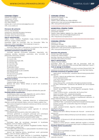 WWW.GHIDULPRIMARIILOR.RO JUDE%u021aUL CLUJ / 257COMUNA C%u0102%u015eEIUAdres%u0103: Principal%u0103, nr. 54Cod po%u0219tal: 407155Telefon: 0264-229101; Fax: 0264-229101; Adresa de e-mail: primarcaseiu@yahoo.comURL: www.caseiu.roPersoane din primarie:Primar: Marinel Baia%u0219Viceprimar: Marinela-Nicoleta CremeneSecretar General: Maria BotizaContabil:%u00a0Alina-Teodora HrubanSate %u00een administra%u021bie:C%u0103%u015feiu, Uri%u0219or, Coplean, Rug%u0103%u0219e%u0219ti, Guga, Custura, Comor%u00e2%u021ba, S%u0103l%u0103truc, Leudra, G%u00eerb%u0103u DejuluiSuprafa%u021ba:%u00a0 8328 ha; Intravilan:%u00a0 524 ha; Extravilan:%u00a0 7834 ha; Popula%u021bia:%u00a04375; Gospod%u0103rii:%u00a01173; Gr%u0103dini%u021be:%u00a05; %u0218coli:%u00a02; Cum se ajunge in localitate:Comuna C%u0103%u0219eiu este %u00een apropierea municipiului Dej, accesul %u00een comun%u0103 fiind facilitat prin existen%u021ba DN 18BActivitati economice si specifice zonei:Activit%u0103%u021bi agricole (cultivarea cerealelor, legumelor, etc; cre%u0219terea ovinelor, bovinelor, porcinelor, etc), activit%u0103%u021bi de prelucrare a lemnului, comer%u021bFirme reprezentative:SC Ivoram SRLSC Madamari Impex SRLSC Cavrom SRLSC Domiflor SRLSC Glemar SRLProduc%u0103tori locali:PFA HOZA SABIN-MARIUSPFA BOLDOR NICULAE-COSMIN PFA T%u0102TAR ALINPFA BUJOR AUGUSTINProduse locale: Miere de albin%u0103, cultivare legume de sezon, etc. Obiective turistice:Castrul roman SamumCastelul Haller din Coplean Biserica din lemn %u201cSfin%u021bii Mihail %u0219i Gavril%u201d din localitatea G%u00e2rboul DejuluiEvenimente:Serb%u0103ri %u0219i spectacole de Cr%u0103ciun Jocuri populare organizate %u00een preajma s%u0103rb%u0103torilor pascaleFacilit%u00e3%u0163i oferite investitorilor:Posibilitatea cre%u0103rii unor hale, depozite, etc. pentru fabriciAcces rutier facil %u00een localit%u0103%u021bile din comun%u0103For%u021b%u0103 de munc%u0103 cu varste %u00eentre 20-40 aniProiecte de investi%u0163ii:Dotarea cu mobilier, materiale didactice %u0219i echipamente digitale a %u0219colii gimnaziale C%u0103%u0219eiu, comuna C%u0103%u0219eiu, jude%u021bul ClujRenovarea energetic%u0103 moderat%u0103 a sediului prim%u0103riei, comunei C%u0103%u0219eiu, jude%u021bul ClujModernizare drumuri %u00een comuna C%u0103%u0219eiuModernizarea infrastructurii rutiere agricole %u00een comuna C%u0103%u0219eiu, jude%u021bul ClujMicrobuze electrice pentru elevii din jude%u021bul Cluj%u00cenfiin%u021bare gr%u0103dini%u021b%u0103 cu program prelungit prin schimbare destina%u021bie din %u0219coala Uri%u0219or, comuna C%u0103%u0219eiu, jude%u021bul ClujProgramul privind casarea autovehiculelor uzateModernizare infrastructur%u0103%u00a0rutier%u0103 %u00een comuna C%u0103%u0219eiu, jude%u021bul ClujExtindere re%u021bea de canalizare menajer%u0103 %u00een localitatea Rug%u0103%u0219e%u0219ti, comuna C%u0103%u0219eiu, jude%u021bul ClujExtindere re%u021bea de ap%u0103 potabil%u0103 Rug%u0103%u0219e%u0219ti-Garb%u0103u Dejului, comuna C%u0103%u0219eiu, jude%u021bul ClujExtindere re%u021bea alimentare cu ap%u0103 potabil%u0103 %u00een localitatea Guga, comuna C%u0103%u0219eiu, jude%u021bul ClujServicii de catering pentru beneficiarii %u0219colii gimnaziale C%u0103%u0219eiu, comuna C%u0103%u0219eiu, jude%u021bul Cluj Extindere re%u021bea de gaze naturale %u00een localit%u0103%u021bile Rug%u0103%u0219e%u0219ti, Custura, Guga %u0219i Garb%u0103u-Dejului, comuna C%u0103%u0219eiu, jude%u021bul ClujCOMUNA C%u0102TINAAdres%u0103: Principal%u0103, nr. 154Cod po%u0219tal: 407170Telefon: 0264-287618; Fax: 0264-287602; Adresa de e-mail: primariacatina@yahoo.comURL: www.primariacatina.roMUNICIPIUL C%u00c2MPIA TURZIIAdres%u0103: Laminori%u015ftilor, nr. 2Cod po%u0219tal: 405100Telefon: 0264-368001, 368002; Fax: 0264-365467; Adresa de e-mail: primaria@campiaturzii.roURL: http://www.campiaturzii.roCOMUNA C%u00c2%u0162C%u0102UAdres%u0103: nr. 100Cod po%u0219tal: 407180Telefon: 0264-225101; Fax: 0264-225301; Adresa de e-mail: primariacitcau@yahoo.comURL: www.primariacatcau.roPersoane din primarie:Primar: Ing. C%u0103lin Mure%u0219anViceprimar: Vasile Dobo%u015fSecretar General: Ana Maria T%u00e2rnovanContabil: Alina Elena Mure%u0219anSate %u00een administra%u021bie:C%u00e2%u0163c%u0103u, Muncel, S%u0103li%u015fcaSuprafa%u021ba:%u00a0 3740 ha; Intravilan:%u00a0 303 ha; Extravilan:%u00a0 3437 ha; Popula%u021bia:%u00a02240; Gospod%u0103rii:%u00a0979; Locuin%u021be:%u00a0808; Gr%u0103dini%u021be:%u00a02; %u0218coli:%u00a01; Cum se ajunge in localitate:Comuna C%u00e2%u021bc%u0103u se afl%u0103 la 12 km de municipiul Dej pe DN1C. De asemena se poate ajunge %u0219i pe DJ109E, pe ruta Dej-Vad-C%u00e2%u021bc%u0103uActivitati economice si specifice zonei:Agricultur%u0103 - mici fermieri , cresc%u0103tori de animale %u015fi produc%u0103tori de legumeComer%u021b- Fabric%u0103 de prefabricate , Fabric%u0103 cabluriFirme reprezentative:Leier Rom IMM HIDRO ESTProduc%u0103tori locali:Graur Marius PFA %u2013 produc%u0103tor de lapte %u015fi produse lactateSC MALI IMPEX SRL %u2013 productor de obiecte de cult sculptate %u00een lemnMure%u015fan D. Andreea PFA %u2013 ferma pomicol%u0103Mocan Sergiu PFA %u2013 ferma de legume proaspete: fasole , cartofi , usturoiUngur Cristina Ionela %u2013 produc%u0103tor de fructe %u015fi floriMocan M sergiu PFA - produc%u021bie de pele%u021biB%u0103ban Bogdan Gabriel PFA - ferm%u0103 de legume proaspeteBaneas Loredana PFA- cre%u0219terea %u0219i exploatarea albinelor, %u00een scopul ob%u021binerii de produc%u021bii apicolePe%u0219te%u0219an Alin Valer- produc%u0103tor legume ecologiceALEFRUCT SRL- cultivarea fructelor semin%u021boase %u0219i s%u00e2mburoaseFren%u021biu Lavinia PFA- produc%u0103tor legume ecologiceProduse locale: Lapte , produse lactate , legume , cereale , fructe, animale %u00een viu pentru carneObiective turistice:Biserica de lemn Sf%u00e2ntul%u00a0 Nicolae din Muncel - construit%u0103 %u00een secolul XVIBiserica de lemn Sf%u00e2ntul Mihail %u015fi Gavril din Salisc