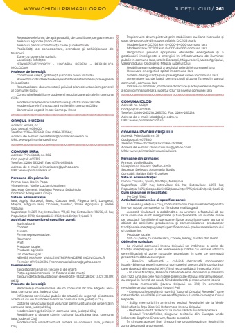 WWW.GHIDULPRIMARIILOR.RO JUDE%u021aUL CLUJ / 261Re%u021bea de telefonie, de ap%u0103 potabil%u0103, de canalizare, de gaz metanTerenuri agricole productiveTerenuri pentru construc%u021bii civile %u015fi industrialePosibilit%u0103%u021bi de concesionare, arendare %u015fi achizi%u021bionare de terenuriZone cu poten%u0163ial turisticLocalit%u0103%u021bii %u00cenfr%u0103%u021bite: ISZKASZENTGYORGY - UNGARIA PEPENI %u2013 REPUBLICA MOLDOVAProiecte de investi%u0163ii:Construire cre%u0219%u0103, gr%u0103dini%u021b%u0103 %u015fi scoal%u0103 nou%u0103 %u00een Gil%u0103uProiect /Iucr%u0103ri de extindere/reabilitare sistem de supraveghere %u00een localitateReactualizare documenta%u021bii privind plan de urbanism general al comunei Gil%u0103uConstruire/reabilitare pode%u0163e %u015fi regularizare p%u00e2raie %u00een comuna Gil%u0103uModernizare/modificare trotuare %u015fi str%u0103zi %u00een localitateModernizare infrastructur%u0103 rutier%u0103 %u00een comuna Gil%u0103uConstruire capel%u0103%u00a0%u00een sat Some%u015fu ReceORA%u0218UL HUEDINAdres%u0103: Horea, nr. 1Cod po%u0219tal: 405400Telefon: 0264-351548; Fax: 0264-351564; Adresa de e-mail: secretariat@primariahuedin.roURL: www.primariahuedin.roCOMUNA IARAAdres%u0103: Principal%u0103, nr. 282Cod po%u0219tal: 407315Telefon: 0264 333247; Fax: 0374-093428; Adresa de e-mail: primariaiara@yahoo.comURL: www.primariaiara.roPersoane din primarie:Prima:%u00a0Ioan Dorin%u00a0PopaViceprimar:%u00a0Vasile%u00a0Lucian%u00a0Ursulean%u00a0Secretar General: Mariana%u00a0Petru%u021ba%u00a0Dr%u0103ghiciu%u00a0Contabil:%u00a0Margareta%u00a0Ghi%u015fa%u00a0Sate %u00een administra%u021bie:Iara, Agri%u015f, Borze%u015fti, Buru, Cacova Ierii, F%u0103getu Ierii, Lunge%u015fti, Ma%u015fca, M%u0103gura Ierii, Ocolisel, Surduc, Valea Agri%u015fului %u015fi Valea VaduluiSuprafa%u021ba:%u00a0 14387 ha; Intravilan:%u00a0 711,03 ha; Extravilan:%u00a0 13676,45 ha; Popula%u021bia:%u00a03719; Gospod%u0103rii:%u00a02162; Gr%u0103dini%u021be:%u00a01; %u0218coli:%u00a01; Activitati economice si specifice zonei:Agricultur%u0103Comer%u021bTurismFirme reprezentative:Roxmont ProfiProduse locale:Produse agricoleUn me%u0219te%u0219ugar :NEME%u0218 MARIAN VASILE INTREPRINDERE INDIVIDUAL%u0102 Fermier 0747469314 / nemesmariaileana@yahoo.comEvenimente:T%u00e2rg s%u0103pt%u0103m%u00e2nal-%u00een fiecare zi de mar%u021biPia%u021ba agroalimentar%u0103--%u00een fiecare zi de mar%u021bi T%u00e2rguri de %u0163ar%u0103 sau b%u00e2lciuri deosebite -13.02; 28.04; 13.07; 28.09; 06.12Proiecte de investi%u0163ii:Refacere %u0219i modernizare drum comunal dc 104 F%u0103getu IeriiIara, comuna Iara, jude%u021bul Cluj%u00cenfiin%u021barea serviciului public de situa%u021bii de urgen%u021b%u0103 %u0219i dotarea acestuia cu un buldoexcavator %u00een comuna Iara, jude%u021bul ClujDotarea serviciului local voluntar pentru situa%u021bii de urgen%u021b%u0103 %u00een comuna Iara, jude%u021bul ClujModernizare gr%u0103dini%u021b%u0103 %u00een comuna Iara, jude%u021bul ClujReabilitare %u0219i dotare c%u0103min cultural localitatea%u00a0 Iara, comuna Iara, jude%u021bul ClujModernizare infrastructur%u0103 rutier%u0103 %u00een comuna Iara, jude%u021bul Cluj%u00cempietruire drum pietruit prin stabilizare cu liant hidraulic %u0219i strat de protec%u021bie din covor asfaltic DC 103 Agri%u0219Modernizare DC 102 km 0+000-9+000 comuna IaraModernizare DC 102 km 0+000-9+000 comuna IaraProgramul privind sprijinirea eficien%u021bei energetice %u0219i a gestion%u0103rii inteligente a energiei %u00een infrastructura de iluminat public %u00een comuna Iara, satele Borze%u0219ti, M%u0103gura Ierii, Valea Agri%u0219ului, Valea Vadului, Ocoli%u0219el %u0219i M%u00e2%u0219ca, jude%u021bul ClujReabilitarea moderat%u0103 a sediului prim%u0103riei comunei IaraRenovare energetic%u0103%u00a0spital %u00een comuna IaraSistem de siguran%u021ba %u0219i supreveghere video %u00een comuna IaraAmenajare loc de joac%u0103 pentru copii %u0219i zona fitness %u00een parcul comunal , comuna IaraDotare cu mobilier , materiale didactice %u0219i echipamente digitale a %u0219colii gimnaziale Iara, jude%u021bul Cluj%u201d la nivelul comunei IaraCOMUNA ICLODAdres%u0103: nr. 440/ACod po%u0219tal: 407335Telefon: 0264-263218, 263370; Fax: 0264-263218; Adresa de e-mail: iclod@cj.e-adm.roURL: www.primariaiclod.roCOMUNA IZVORU CRI%u015eULUIAdres%u0103: Principal%u0103, nr. 39Cod po%u0219tal: 407340Telefon: 0264-257140; Fax: 0264-257198; Adresa de e-mail: izvorucrisului@yahoo.comURL: www.primariaizvorucrisului.roPersoane din primarie:Primar: Vasile Bodi%u0219Viceprimar: Kovacs %u0218tefan-AttilaSecretar Delegat: Anamaria Bodi%u0219Contabil: Bal%u00e1zs Edit-Erzs%u00e9betSate %u00een administra%u021bie:Izvoru Cri%u015fului, %u015eaula, Nad%u0103%u015fu, Near%u015fovaSuprafa%u021ba:%u00a0 4137 ha; Intravilan:%u00a0 64 ha; Extravilan:%u00a0 4073 ha; Popula%u021bia:%u00a01476; Gospod%u0103rii:%u00a0652; Locuin%u021be:%u00a0775; Gr%u0103dini%u021be:%u00a02; %u0218coli:%u00a02; Cum se ajunge in localitate:Pe DN1 /E60Activitati economice si specifice zonei:La nivelul jude%u0163ului Cluj, comuna Izvoru Cri%u015fului este me%u0163ionat%u0103 %u00eentr-un top al comunelor ca fiind cea mai bogat%u0103Aceast%u0103 titulatur%u0103 a dob%u00e2ndit-o ca urmare a faptului c%u0103 pe raza comunei sunt %u00eenregistrate %u015fi func%u0163ioneaz%u0103 un num%u0103r mare de asocia%u0163ii familiale %u015fi persoane fizice autorizate care au ca %u015fi obiect de activitate producerea %u015fi comercializarea produselor tradi%u0163ionale me%u015fte%u015fug%u0103re%u015fti specifice zonei - prelucrarea lemnului %u015fi cus%u0103torilor.Produse locale: %u0218ah cu piese, Cutie secret%u0103, Cosele, Remy, Juc%u0103rii din lemnObiective turistice:La nivelul comunei Izvoru Cri%u0219ului se %u00eent%u00e2lnesc o serie de tradi%u021bii, me%u0219te%u0219uguri %u0219i de asemenea %u0219i cl%u0103diri cu valoare istoric%u0103 semnificativ%u0103 %u0219i zone naturale protejate. %u00cen cele ce urmea