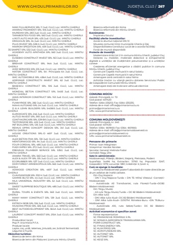 WWW.GHIDULPRIMARIILOR.RO JUDE%u021aUL CLUJ / 267MAXI FULLSERVICE SRL 11 Jud. CLUJ, Loc. MINTIU GHERLIIAMARAZ PADIMENTI SRL 106 Jud. CLUJ, Loc. MINTIU GHERLIIMUREMIX SRL 283 Jud. CLUJ, Loc. MINTIU GHERLIITARABOSTES FOOD SRL 563 Jud. CLUJ, Loc. MINTIU GHERLII4 ROTI AUTO MUR SRL 435 Jud. CLUJ, Loc. MINTIU GHERLIIDRAGOLIN SRL 34 Jud. CLUJ, Loc. MINTIU GHERLIIPLUS INVEST SRL 538 A Jud. CLUJ, Loc. MINTIU GHERLIIMIAROM SPEDITION SRL 459 Jud. CLUJ, Loc. MINTIU GHERLII 35 SANPET SRL 532 Jud. CLUJ, Loc. MINTIU GHERLIIACADEMY AUTO APATHIDA SRL 563 Jud. CLUJ, Loc. MINTIU GHERLIIEUSEBIO CONSTRUCT INVEST SRL 163 Jud. CLUJ, Loc. MINTIU GHERLIIBREHAR CONSTRUCT SRL 94A Jud. CLUJ, Loc. MINTIU GHERLIIAOM SERVICES SRL 515 Jud. CLUJ, Loc. MINTIU GHERLIIMATSIK CONSTRUCT SRL Str. Principala 64 Jud. CLUJ, Loc. MINTIU GHERLIISMC AUTOMOBILE SRL 436A Jud. CLUJ, Loc. MINTIU GHERLIIADRYMAR CONSTRUCTII INVEST SRL 62 Jud. CLUJ, Loc. MINTIU GHERLIIBASESCU CONSTRUCT SRL 106 Jud. CLUJ, Loc. MINTIU GHERLIIMONDIAL BETON CONSTRUCT SRL 540E Jud. CLUJ, Loc. MINTIU GHERLIIIANIS INTERIOR CONSTRUCT SRL 153 Jud. CLUJ, Loc. MINTIU GHERLIIFUNNYRIDE SRL 282 Jud. CLUJ, Loc. MINTIU GHERLIIMAHA AUTOAND SRL 24 Jud. CLUJ, Loc. MINTIU GHERLIID & A LEMN BUILDERS SRL 540BIS Jud. CLUJ, Loc. MINTIU GHERLIIELIROXCAFE SRL 246 Jud. CLUJ, Loc. MINTIU GHERLIIALITUD INVEST SRL 393 Jud. CLUJ, Loc. MINTIU GHERLIICONTYAGRICARS SRL 539 BIS Jud. CLUJ, Loc. MINTIU GHERLIITEOTONMOB SRL 402 Jud. CLUJ, Loc. MINTIU GHERLIIINF BUILDING SRL 126 Jud. CLUJ, Loc. MINTIU GHERLIIREMUS OPRIS CONCEPT DESIGN SRL 341 Jud. CLUJ, Loc. MINTIU GHERLIIHOUSE CREATIONS SRL-D 461F Jud. CLUJ, Loc. MINTIU GHERLIIALEX BETON FMA SRL 130 Jud. CLUJ, Loc. MINTIU GHERLIIMENTORWOOD SRL 94 Jud. CLUJ, Loc. MINTIU GHERLIIFOUR CORDIAL SRL 485 Jud. CLUJ, Loc. MINTIU GHERLIIFIADI IMPEX SRL 272 Jud. CLUJ, Loc. MINTIU GHERLIIPREMIUM PLUMBER SERVICE SRL 535G Jud. CLUJ, Loc. MINTIU GHERLIIAMARA TRAVEL SRL 563 Jud. CLUJ, Loc. MINTIU GHERLIIALEX & ALEX ITP SRL 515 Jud. CLUJ, Loc. MINTIU GHERLIIECORUBBER SRL 537 Jud. CLUJ, Loc. MINTIU GHERLIIDOR FOREST ARMENOPOLIS SRL 563 Jud. CLUJ, Loc. MINTIU GHERLIIADWOOD CREATION SRL 461F Jud. CLUJ, Loc. MINTIU GHERLIICLAUDANDMB SRL 330 H Jud. CLUJ, Loc. MINTIU GHERLIIGAMME BLITZ SRL 44 Jud. CLUJ, Loc. MINTIU GHERLIIMLA UNIVERSAL INDUSTRY SRL 52 Jud. CLUJ, Loc. MINTIU GHERLIISWEET SURPRISE BOUTIQUE SRL 485 Jud. CLUJ, Loc. MINTIU GHERLIIRURAL TOURS & EVENTS SRL 563 Jud. CLUJ, Loc. MINTIU GHERLIIMANY MANY CONSTRUCT SRL 129 Jud. CLUJ, Loc. MINTIU GHERLIIESTRICH BOB SRL 106 Jud. CLUJ, Loc. MINTIU GHERLIIMUSOMA PROD SRL 326 Jud. CLUJ, Loc. MINTIU GHERLIIBEST AUTODEVELOPMENT SRL 564A Jud. CLUJ, Loc. MINTIU GHERLIILAURENT CONCEPT INVEST SRL 210A Jud. CLUJ, Loc. MINTIU GHERLIIProduc%u0103tori locali:Pop P. Ana Maria P.F.A.Produse locale: Lapte, ca%u0219, urd%u0103, telemea, jintuial%u0103, zer, br%u00e2nz%u0103 fermentat%u0103. Legume si fructe.Obiective turistice:Biserica de lemn din NimaBiserica de lemn din P%u0103dureni (comuna Mintiu Gherlii)Biserica reformat%u0103 din Nima Biserica reformat%u0103 din Mintiu GherliiEvenimente:%u00cemp%u0103natul bouluiFacilit%u00e3%u0163i oferite investitorilor:Acces la drumul na%u0163ional DN 1CSituarea comunei %u00eentre municipiile Gherla %u015fi DejDisponibilitatea Consiliului Local de a acorda facilit%u0103%u0163iFor%u0163%u0103 de munc%u0103 disponibil%u0103Proiecte de investi%u0163ii:Modernizare str%u0103zi lot 2 %u00een comuna Mintiu Gherlii, jude%u021bul ClujDotarea cu mobilier, materiale didactice %u0219i echipamente digitale a unit%u0103%u021bilor de %u00eenv%u0103%u021b%u0103m%u00e2nt preuniversitar %u0219i a unit%u0103%u021bilor conexeCre%u0219terea eficien%u021bei energetice a cl%u0103dirii publice %u00een comuna Mintiu Gherlii, jude%u021bul ClujConstruire Capel%u0103 mortuar%u0103 %u00een satul SalatiuConstruire Capel%u0103 mortuar%u0103 %u00een satul NimaAmenajare zon%u0103 central%u0103 %u00een satul NimaAchizi%u021bie tractor cu vitanj%u0103 pentru dotarea Serviciului Public de Gospod%u0103rire Comunal%u0103 Mintiu Gherlii Amenajare sta%u021bii de %u00eenc%u0103rcare vehicule electriceCOMUNA MOCIUAdres%u0103: Principal%u0103, nr. 72Cod po%u0219tal: 407420Telefon: 0264-235212; Fax: 0264-235235; Adresa de e-mail: office@primariamociu.roprimar@primariamociu.roURL: www.primariamociu.roCOMUNA MOLDOVENE%u015eTIAdres%u0103: Principal%u0103, nr. 240Cod po%u0219tal: 407430Telefon: 0364 -801900; Fax: 0364 -801900; Adresa de e-mail: office@primariamoldovenesti.roprimar@primariamoldovenesti.roURL: www.primariamoldovenesti.roPersoane din primarie:Primar: Ioan M%u0103rgineanViceprimar: Kardos NicolaeSecretar General: Melinda FodorContabil: Nagy ZitaSate %u00een administra%u021bie:Moldovene%u015fti, Pl%u0103ie%u015fti, B%u0103deni, Stejeri%u015f, Pietroasa, PodeniSuprafa%u021ba:%u00a0 14496 ha; Extravilan:%u00a0 13763 ha; Popula%u021bia:%u00a0 3247; Gospod%u0103rii:%u00a01379; Locuin%u021be:%u00a01891; Gr%u0103dini%u021be:%u00a05; %u0218coli:%u00a04; Cum se ajunge in localitate:Comuna Moldovene%u0219ti poate fi abordat%u0103 din toate direc%u021biile pe drum asfaltat de %u00eenalt%u0103 calitate.Din Cluj-Napoca:-%u00a0DN 1: Cluj-Napoca-Turda %u2192 DN 75: Mihai Viteazul -Corne%u0219ti%u2013 Moldovene%u0219ti-%u00a0 Autostrada A3 Transilvaniei, ruta Flore%u0219ti-Turda%u2192DC82: B%u0103deni-Moldovene%u0219tiDin T%u00e2rgu Mure%u0219:-%u00a0A3 ruta T%u00e2rgu Mure%u0219-Turda %u2192 DC 82 B%u0103deni-Moldovene%u0219tiDin Alba Iulia:- DN1 Alba Iulia-Aiud%u2192 DC 82 B%u0103deni-Moldovene%u0219ti- DN1 Alba Iulia-Aiud%u2192 DJ107M: Rimetea-Buru %u2192DN 75:BuruMoldovene%u0219ti -%u00a0 Autostrada A10, ruta Sebe%u0219-Turda%u2192 DC 82 B%u0103deniMoldovene%u0219tiActivitati economice si specifice zonei:Firme reprezentative:SC FRANKISCHE ROM%u00c2NIA S RLSC SONACA AEROSPACE TRANSILVANIA SRLPORR CONSTRUCT SRLSC FYNAS ENERGY SRLSC KLIM PROD SRLSC AGROTUNDEAN SRLSC AUTONET SRLSC AUTONET SRL SC KESZ SRL