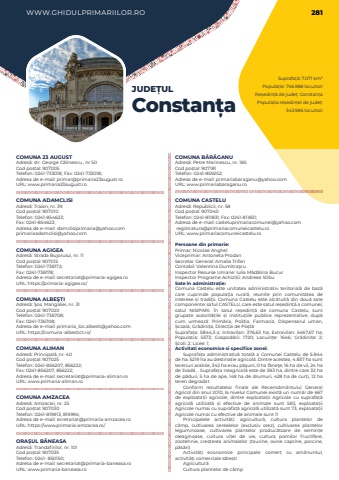 WWW.GHIDULPRIMARIILOR.RO 281Suprafa%u021b%u0103: 7.071 km%u00b2Popula%u021bie: 746.988 locuitoriRe%u0219edin%u021b%u0103 de jude%u021b: Constan%u021baPopula%u021bia re%u0219edin%u021bei de jude%u021b: 343.986 locuitoriJUDE%u021aULConstan%u021baCOMUNA 23 AUGUSTAdres%u0103: str. George C%u0103linescu , nr 50Cod po%u0219tal: 907005Telefon: 0241-733018; Fax: 0241-733018; Adresa de e-mail: primar@primaria23august.roURL: www.primaria23august.roCOMUNA ADAMCLISIAdres%u0103: Traian, nr. 39Cod po%u0219tal: 907010Telefon: 0241-854623; Fax: 0241-854623; Adresa de e-mail: damclisiprimaria@yahoo.comprimariaadamclisi@yahoo.comCOMUNA AGIGEAAdres%u0103: Strada Bujorului, nr. 11Cod po%u0219tal: 907015Telefon: 0241-738172; Fax: 0241-738178; Adresa de e-mail: secretariat@primaria-agigea.roURL: https://primaria-agigea.ro/COMUNA ALBE%u015eTIAdres%u0103: %u015eos. Mangaliei, nr. 31Cod po%u0219tal: 907020Telefon: 0241-736708; Fax: 0241-736708; Adresa de e-mail: primaria_loc.albesti@yahoo.comURL: https://comuna-albestict.ro/COMUNA ALIMANAdres%u0103: Principal%u0103, nr. 40Cod po%u0219tal: 907025Telefon: 0241-856207, 856222; Fax: 0241-856207, 856222; Adresa de e-mail: secretariat@primaria-aliman.roURL: www.primaria-aliman.roCOMUNA AMZACEAAdres%u0103: Amzaciei, nr. 25Cod po%u0219tal: 907030Telefon: 0241-819913, 819994; Adresa de e-mail: ecretariat@primaria-amzacea.roURL: https://www.primaria-amzacea.ro/ORA%u0218UL B%u0102NEASAAdres%u0103: Trandafirilor, nr. 101Cod po%u0219tal: 907035Telefon: 0241- 850150; Adresa de e-mail: secretariat@primaria-baneasa.roURL: www.primaria-baneasa.roCOMUNA B%u0102R%u0102GANUAdres%u0103: Petre Marinescu, nr. 185Cod po%u0219tal: 907181Telefon: 0241-859252; Adresa de e-mail: primariabaraganu@yahoo.comURL: www.primariabaraganu.roCOMUNA CASTELUAdres%u0103: Republicii, nr. 58Cod po%u0219tal: 907040Telefon: 0241-811831; Fax: 0241-811831; Adresa de e-mail: casteluprimariacomunei@yahoo.com registratura@primariacomuneicastelu.roURL: www.primariacomuneicastelu.roPersoane din primarie:Primar: Nicolae AnghelViceprimar: Antoneta ProdanSecretar General:%u00a0Amalia TrifanContabil: Valentina Dumitra%u015fcuInspector Resurse Umane: Iulia M%u0103d%u0103lina BucurInspector Programe Achizi%u021bii: Andreea S%u00eerbuSate %u00een administra%u021bie:Comuna Castelu este unitatea administrativ teritorial%u0103 de baz%u0103 care cuprinde popula%u021bia rural%u0103, reunite prin comunitatea de interese %u0219i tradi%u021bii. Comuna Castelu este alc%u0103tuit%u0103 din dou%u0103 sate componente: satul CASTELU, care este satul re%u0219edin%u021b%u0103 a comunei; satul NISIPARI. %u00cen satul re%u0219edin%u021b%u0103 de comuna Castelu, sunt grupate autorit%u0103%u021bile %u0219i institu%u021biile publice reprezentative, dup%u0103 cum urmeaz%u0103: Prim%u0103ria, Poli%u021bia, Farmacia, Dispensarul uman, %u0218coala, Gr%u0103dini%u021ba, Direc%u021bia de Po%u0219t%u0103Suprafa%u021ba:%u00a0 5844,3 a; Intravilan:%u00a0 376,63 ha; Extravilan:%u00a0 5467,67 ha; Popula%u021bia:%u00a0 5573; Gospod%u0103rii:%u00a0 1720; Locuin%u021be:%u00a0 1646; Gr%u0103dini%u021be:%u00a0 2; %u0218coli:%u00a02; Licee:%u00a01; Activitati economice si specifice zonei:Suprafa%u021ba administrativ%u0103 total%u0103 a Comunei Castelu de 5.844 de ha. 5219 ha au destina%u021bie agricol%u0103. Dintre acestea, 4.837 ha sunt terenuri arabile, 342 ha erau p%u0103%u015funi, 0 ha f%u00e2ne%u0163e, 16 ha de vii, 24 ha de livad%u0103, . Suprafa%u021ba neagricol%u0103 este de 593 ha, dintre care 32 ha de p%u0103duri, 5 ha de ape, 148 ha de drumuri, 428 ha de cur%u021bi, 12 ha teren degradatConform rezultatelor finale ale Recens%u0103m%u00e2ntului General Agricol din anul 2010, la nivelul Comunei exist%u0103 un num%u0103r de 667 de exploata%u021bii agricole, dintre exploata%u021bii Agricole cu suprafa%u021b%u0103 agricol%u0103 utilizat%u0103 %u0219i efective de animale sunt 583, exploata%u021bii Agricole numai cu suprafa%u021b%u0103 agricol%u0103 utilizat%u0103 sunt 73, exploata%u021bii Agricole numai cu efective de animale sunt 11Principalele activit%u0103%u021bi: agricultur%u0103, cultura plantelor de c%u00e2mp, cultivarea cerealelor (exclusiv orez), cultivarea plantelor leguminoase, cultivarea plantelor produc%u0103toare de semin%u021be oleaginoase, cultura vi%u021bei de vie, cultura pomilor fructifere, zootehnie, cre%u0219terea animalelor (taurine, ovine caprine, porcine, p%u0103s%u0103ri)Activit%u0103%u021bi economice principale: comer%u021b cu am%u0103nuntul, activit%u0103%u021bi comerciale s%u0103te%u0219tiAgricultur%u0103Cultura plantelor de c%u00e2mp