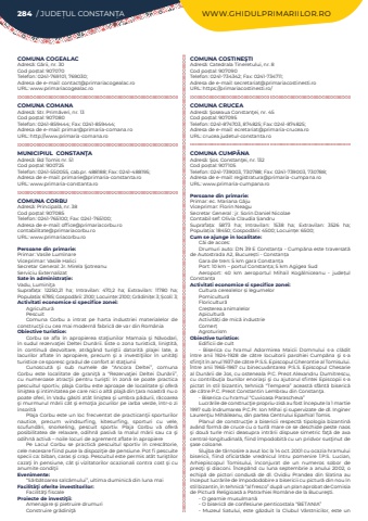 284 / JUDE%u021aUL CONSTAN%u021aA WWW.GHIDULPRIMARIILOR.ROCOMUNA COGEALACAdres%u0103: G%u0103rii, nr. 30Cod po%u0219tal: 907070Telefon: 0241-769101, 769030; Adresa de e-mail: contact@primariacogealac.roURL: www.primariacogealac.roCOMUNA COMANAAdres%u0103: Str. Prim%u0103veri, nr. 13Cod po%u0219tal: 907080Telefon: 0241-859444; Fax: 0241-859444; Adresa de e-mail: primar@primaria-comana.roURL: http://www.primaria-comana.roMUNICIPIUL CONSTAN%u0162AAdres%u0103: Bd Tomis nr. 51Cod po%u0219tal: 900725Telefon: 0241-550055, cab.pr. 488188; Fax: 0241-488195; Adresa de e-mail: primarie@primaria-constanta.roURL: www.primaria-constanta.roCOMUNA CORBUAdres%u0103: Principal%u0103, nr. 38Cod po%u0219tal: 907085Telefon: 0241-765100; Fax: 0241-765100; Adresa de e-mail: office@primariacorbu.rocontabilitate@primariacorbu.roURL: www.primariacorbu.roPersoane din primarie:Primar: Vasile Lum%u00eenareViceprimar: Vasile HaliciSecretar General: Jr. Mirela %u015eotreanuServiciu ExternalizatSate %u00een administra%u021bie:Vadu, Lumini%u0163aSuprafa%u021ba:%u00a0 12250,21 ha; Intravilan:%u00a0 470,2 ha; Extravilan:%u00a0 11780 ha; Popula%u021bia:%u00a06785; Gospod%u0103rii:%u00a02100; Locuin%u021be:%u00a02100; Gr%u0103dini%u021be:%u00a03; %u0218coli:%u00a03; Activitati economice si specifice zonei:Agricultur%u0103PescuitComuna Corbu a intrat pe harta industriei materialelor de construc%u0163ii cu cea mai modern%u0103 fabric%u0103 de var din Rom%u00e2niaObiective turistice:Corbu se afla %u00een apropierea sta%u0163iunilor Mamaia %u015fi N%u0103vodari, %u00een sudul rezerva%u0163iei Deltei Dun%u0103rii. Este o zona turistic%u0103, lini%u015ftit%u0103, %u00een continu%u0103 dezvoltare, atr%u0103g%u00e2nd turi%u015ftii datorit%u0103 plajei late, a lacurilor aflate %u00een apropiere, precum %u015fi a investi%u0163iilor %u00een unit%u0103%u0163i turistice ce sporesc gradul de confort al sta%u0163iuniiCunoscut%u0103 %u015fi sub numele de %u201cAncora Deltei%u201d, comuna Corbu este localitate de grani%u0163%u0103 a %u201cRezerva%u0163iei Deltei Dun%u0103rii%u201d, cu numeroase atrac%u0163ii pentru turi%u015fti: %u00een zon%u0103 se poate practica pescuitul sportiv, plaja Corbu este aproape de localitate %u015fi ofer%u0103 lini%u015ftea %u015fi intimitatea pe care nici o alt%u0103 plaj%u0103 din %u0163ara noastr%u0103 nu o poate oferi, %u00een Vadu g%u0103siti at%u00e2t lini%u015ftea %u015fi umbra p%u0103durii, r%u0103coarea %u015fi murmurul m%u0103rii c%u00e2t %u015fi emo%u0163ia jocurilor pe iarba verde, %u00eentr-o zi %u00eensorit%u0103Plaja Corbu este un loc frecventat de practican%u0163ii sporturilor nautice, precum windsurfing, kitesurfing, sporturi cu vele, scufund%u0103ri, snorkeling, pescuit sportiv. Plaja Corbu v%u0103 ofer%u0103 posibilitatea de relaxare, odihn%u0103 pasiv%u0103 la malul m%u0103rii sau ca %u015fi odihn%u0103 activ%u0103 %u2013 noile locuri de agrement aflate %u00een apropierePe Lacul Corbu se practic%u0103 pescuitul sportiv %u00een cresc%u0103torie, cele necesare fiind puse la dispozi%u0163ie de pensiune. Pot fi pescuite specii ca: biban, caras %u015fi crap. Pescuitul este permis at%u00e2t turi%u015ftilor caza%u0163i %u00een pensiune, c%u00e2t %u015fi vizitatorilor ocazionali contra cost %u015fi cu anumite condi%u0163iiEvenimente:%u201cS%u0103rb%u0103toarea salc%u00e2mului%u201d, ultima duminic%u0103 din luna maiFacilit%u00e3%u0163i oferite investitorilor:Facilit%u0103%u0163i fiscaleProiecte de investi%u0163ii:Amenajare %u015fi pietruire drumuriConstruire gr%u0103dini%u0163%u0103COMUNA COSTINE%u015eTIAdres%u0103: Catedrala Tineretului, nr. 8Cod po%u0219tal: 907090Telefon: 0241-734342; Fax: 0241-734711; Adresa de e-mail: secretariat@primariacostinesti.roURL: https://primariacostinesti.ro/COMUNA CRUCEAAdres%u0103: %u015eoseaua Constan%u0163ei, nr. 45Cod po%u0219tal: 907095Telefon: 0241-874703, 874825; Fax: 0241-874825; Adresa de e-mail: ecretariat@primaria-crucea.ro URL: crucea.judetul-constanta.roCOMUNA CUMP%u0102NAAdres%u0103: %u015eos. Constan%u0163ei, nr. 132Cod po%u0219tal: 907105Telefon: 0241-739003, 730788; Fax: 0241-739003, 730788; Adresa de e-mail: registratura@primaria-cumpana.roURL: www.primaria-cumpana.roPersoane din primarie:Primar: ec. Mariana G%u00e2juViceprimar: Florin NeaguSecretar General : jr. Sorin Daniel NicolaeContabil sef: Olivia Claudia %u0218andruSuprafa%u021ba:%u00a0 5873 ha; Intravilan:%u00a0 1538 ha; Extravilan:%u00a0 3526 ha; Popula%u021bia:%u00a018450; Gospod%u0103rii:%u00a04500; Locuin%u021be:%u00a06500; Cum se ajunge in localitate:C%u0103i de acces:Drumuri auto: DN 39 E Constan%u021ba - Cump%u0103na este traversat%u0103 de Autostrada A2, Bucure%u0219ti - Constan%u021baGara de tren: 5 km gara Constan%u021baPort: 10 km %u2013 portul Constan%u021ba; 5 km Agigea Sud Aeroport: 40 km aeroportul Mihail Kog%u0103lniceanu - jude%u021bul Constan%u021baActivitati economice si specifice zonei:Cultura cerealelor %u0219i legumelorPomicultur%u0103Floricultur%u0103Cre%u0219terea animalelorApicultur%u0103Activit%u0103%u021bi de mic%u0103 industrieComer%u021bAgroturismObiective turistice:Edificii de cult- Biserica cu hramul Adormirea Maicii Domnului s-a cl%u0103dit %u00eentre anii 1924-1928 de c%u0103tre locuitorii parohiei Cump%u0103na %u015fi s-a sfin%u0163it %u00een anul 1937 de c%u0103tre P.S.S. Episcopul Gherontie al Tomisului. %u00centre anii 1965-1967 cu binecuv%u00e2ntarea P.S.S. Episcopul Chesarie al Dun%u0103rii de Jos, cu osteneala P.C. Preot Alexandru Dumitrescu, cu contribu%u0163ia bunilor enoria%u015fi %u015fi cu ajutorul sfintei Episcopii s-a pictat %u00een stil bizantin, tehnic%u0103 %u201cTempera%u201d aceast%u0103 sf%u00e2nt%u0103 biseric%u0103 de c%u0103tre P.C. Preot Constantin Lembrau din Constan%u0163a.- Biserica cu hramul %u201cCuvioasa Parascheva%u201dLucr%u0103rile de construc%u0163ie propriu-zis%u0103 au fost %u00eencepute la 1 martie 1997 sub %u00eendrumarea P.C.Pr. Ion Mihai %u015fi supervizate de dl. Inginer Lauren%u0163iu Mih%u0103ileanu, din partea Centr