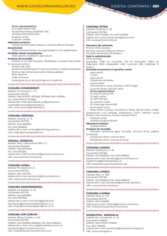 WWW.GHIDULPRIMARIILOR.RO JUDE%u021aUL CONSTAN%u021aA / 289Firme reprezentative:ECO DBR INVEST SRLVALENTINA PAN & MORARIT SRLVALINIK DEM PROD SRLProduse locale: Cultivare cerealeObiective turistice:O biseric%u0103 monument istoric cu Hramul Sf%u00e2ntul NicolaeEvenimente:Zilele Comunei Garliciu se organizeaz%u0103%u00a0%u00een luna septembrieFacilit%u00e3%u0163i oferite investitorilor:Teren pentru investi%u0163ii %u00een agricultur%u0103Proiecte de investi%u0163ii:Proiect %u00een curs de finalizare %u201cReabilitare %u0219i modernizare str%u0103zi %u00een Comuna Garliciu%u201dProiecte de viitorConstruire sal%u0103%u00a0de sport %u00een Comuna Garliciu, Jude%u021bul Constan%u021baDrumuri de interes local %u0219i de interes jude%u021beanBaza sportiv%u0103Cas%u0103%u00a0mortuar%u0103Amenajare locuri de joac%u0103 sigure %u0219i moderneCOMUNA GHIND%u0102RE%u015eTIAdres%u0103: str.Primaverii , nr 1Cod po%u0219tal: 907135Telefon: 0241-873077, 873060, 873099, 0341-453090; Fax: 0241-873077, 873060; Adresa de e-mail: ghindaresti_pri@yahoo.comcontact@comunaghindaresti.roURL: www.comunaghindaresti.roCOMUNA GR%u0102DINAAdres%u0103: Victoriei, nr. 9Cod po%u0219tal: 907278Telefon: 0241-853800; Fax: 0241-853800; Adresa de e-mail: contact@primariagradina.roURL: https://primariagradina.ro/ORA%u0218UL H%u00c2R%u015eOVAAdres%u0103: Pia%u0163a 1 Decembrie 1918, nr. 1Cod po%u0219tal: 905400Telefon: 0241-870300; Fax: 0241-870301; Adresa de e-mail: secretariat@primaria-harsova.roURL: www.primaria-harsova.roCOMUNA HORIAAdres%u0103: Principal%u0103, Nr. 31Cod po%u0219tal: 907140Telefon: 0241-257750; Adresa de e-mail: secretariat@comunahoria.roURL: https://comunahoria.ro/COMUNA INDEPENDEN%u0162AAdres%u0103: Constan%u0163ei, nr. 37Cod po%u0219tal: 907145Telefon: 0241-857860; Fax: 0241-857930; Adresa de e-mail: rimariaind@gmail.comsecretariat@primariaindependenta-ct.roURL: https://primariaindependenta-ct.ro/COMUNA ION CORVINAdres%u0103: Sf%u00e2ntul Andrei, nr. 50Cod po%u0219tal: 907150Telefon: 0241-856200, 856464; Fax: 0241-856464; Adresa de e-mail: comuna@primariaioncorvin.rosecretariat@primariaioncorvin.roURL: https://www.primariaioncorvin.ro/COMUNA ISTRIAAdres%u0103: Prim%u0103riei, nr. 10Cod po%u0219tal: 907155Telefon: 0241-522581; Fax: 0241-522581; Adresa de e-mail: primar.istria@yahoo.comURL: www.primaria-istria.roPersoane din primarie:Primar: Mihai IonescuSecretar General: R%u0103ducan Petric%u0103Contabil: Alexandrina Bu%u0163ulescuSate %u00een administra%u021bie:Istria, Nunta%u015fiSuprafa%u021ba:%u00a0 17361 ha; Intravilan:%u00a0 451 ha; Extravilan:%u00a0 16910 ha; Popula%u021bia:%u00a0 2500; Gospod%u0103rii:%u00a0 2163; Locuin%u021be:%u00a0 925; Gr%u0103dini%u021be:%u00a0 2; %u0218coli:%u00a02; Activitati economice si specifice zonei:Agricultur%u0103TurismAgricultur%u0103Cre%u015fterea animalelorOportunit%u0103%u021bi:%u00cenvecinarea cu zona riveran%u0103 a m%u0103rii NegreLacurile: Sinoie, Nunta%u0219i, IstriaFirme reprezentative:SC Maria Trasing SRLI.F Raftv MihaiSC OPT MP SRLSC Halmiris TradeSC Flamingo Pound SRLProduc%u0103tori localiRaftu Mihai, Curelaru Constantin, Maier Daniel, Eranu Vasile, Dragomiroiu Luci Mihaela, Bra%u0219oveanu Florin, M%u0103r%u0103cin Iacob Remus, Nicu Dumitru, Coman Leonard PetruProduse locale Cereale, produse lactateObiective turistice:Cetatea HistriaProiecte de investi%u0163ii:%u00cenfiin%u021bare distribu%u021bie gaze naturale, comuna Istria, jude%u021bul Constan%u021baConstruire c%u0103min cultural Istria Reabilitare c%u0103min cultural Nunta%u0219iCOMUNA LIMANUAdres%u0103: Castanului, nr. 32Cod po%u0219tal: 907160Telefon: 0241-858204; Fax: 0241-858201; Adresa de e-mail: secretar@primarialimanu.roregistratura@primarialimanu.roURL: https://www.primarialimanu.ro/COMUNA LIPNI%u0162AAdres%u0103: Morii, nr. 350Cod po%u0219tal: 907165Telefon: 0241-856545; Fax: 0241-856545; Adresa de e-mail: secretariat@primaria-lipnita.roURL: www.primaria-lipnita.roCOMUNA LUMINAAdres%u0103: Mare, nr. 170Cod po%u0219tal: 907175Telefon: 0241-251828; Adresa de e-mail: contact@primaria-lumina.roURL: https://www.primaria-lumina.ro/MUNICIPIUL MANGALIAAdres%u0103: %u015eos. Constan%u0163ei, nr. 13Cod po%u0219tal: 905500Telefon: 0241-751011, 751060; Fax: 0241-755606; Adresa de e-mail: secretariat@primaria.mangalia.roURL: www.mangalia.ro