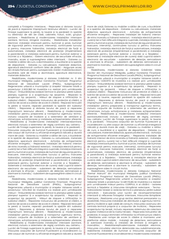294 / JUDE%u021aUL CONSTAN%u021aA WWW.GHIDULPRIMARIILOR.ROcomplet%u0103 a finisajelor interioare; %u2022 Repararea %u0219i dotarea locului de joac%u0103 %u0219i repararea %u00eemprejmuirii terenului aferent; %u2022 Lucr%u0103ri de finisaje superioare la pere%u0163i, la tavane %u0219i la pardoseli %u00een spa%u021biile cu destina%u0163ii de s%u0103li de clas%u0103, cabinete, holuri, sc%u0103ri, grupuri sanitare; %u2022 Reabilitarea %u015fi modernizarea instala%u0163iilor interioare sanitare, termice, stingere incendiu; %u2022 Reabilitarea instala%u0163iilor electrice: instala%u0163ie interioar%u0103 pentru iluminat %u0219i prize, iluminat de siguran%u0163%u0103 pentru evacuare, interven%u0163ii, continuarea lucrului %u0219i pentru marcarea hidran%u021bilor, instala%u0163ia electric%u0103 de for%u0163%u0103 %u0219i automatizare, instala%u0163ia electric%u0103 de protec%u0163ie (%u00eemp%u0103m%u00e2ntare %u0219i paratr%u0103snet) %u0219i instala%u0163ia exterioar%u0103 pentru iluminat exterior a incintei %u0219i a fa%u0163adelor; %u2022 Sistem electronic de securitate: efrac%u021bie, incendiu, acces %u0219i supraveghere video interioar%u0103; %u2022 Dotarea cu mobilier a s%u0103lilor de curs, a dormitoarelor, a buc%u0103tariei %u0219i la spa%u021biile de depozitare; %u2022 Dotarea cu calculatoare, materiale didactice, aparatur%u0103 electronic%u0103 conform listei de dot%u0103ri %u2022 Asigurare acces din strada Rahovei pentru autospeciale. Dot%u0103ri: mobilier/accesorii buc%u0103t%u0103rie, sal%u0103 de mese %u015fi dormitoare, aparatur%u0103 electronic%u0103, materiale didactice.Reabilitarea, modernizarea %u0219i dotarea Gr%u0103dini%u021bei nr. 3 din municipiul Medgidia, jude%u021bul Constan%u021ba Finan%u021bare: Programul Na%u021bional de Dezvoltare Local%u0103 (PNDL), Subprogramul: Regenerarea urban%u0103 a municipiilor %u0219i ora%u0219elor Valoarea total%u0103 a proiectului: 2.303.383 lei Investi%u021bia s-a realizat prin urm%u0103toarele m%u0103suri: %u2022 %u00cembun%u0103t%u0103%u0163irea izola%u0163iei termice la plan%u0219eul peste subsol, plan%u015feu superior %u0219i a acoperi%u0219ului tip %u0219arpant%u0103; %u2022 Repara%u021bii la acoperi%u0219ul tip %u0219arpant%u0103; %u2022 M%u0103suri de stopare a infiltra%u021biilor %u00een subsolul cl%u0103dirii; %u2022 Repararea trotuarului de protec%u021bie al cl%u0103dirii, a sc%u0103rilor de acces %u0219i a aleilor de acces %u00een cl%u0103dire; %u2022 Repara%u021bii tencuieli la pere%u021bi %u0219i tavane, repara%u021bii pardoseli la spa%u021biile din subsolul cl%u0103dirii; %u2022 Repararea %u0219i dotarea locului de joac%u0103 %u0219i repararea %u00eemprejmuirii terenului aferent; %u2022 Reabilitarea %u015fi modernizarea instala%u0163iilor pentru prepararea %u015fi transportul agentului termic, inclusiv corpurile de %u00eenc%u0103lzire %u015fi a sistemelor de ventilare %u015fi climatizare, achizi%u0163ionarea %u015fi instalarea echipamentelor aferente; %u2022 Reabilitarea %u015fi modernizarea instala%u0163iilor interioare(sanitare, electrice) inclusiv a sistemelor de reglaj cantitativ sau calitativ; %u2022 Lucr%u0103ri de finisaje superioare la pere%u021bi, la tavane %u0219i la pardoseli; %u2022 %u00cenlocuirea corpurilor de iluminat fluorescent %u015fi incandescent cu alte corpuri de iluminat cu eficien%u0163%u0103 energetic%u0103 ridicat%u0103 %u015fi durat%u0103 mare de via%u0163%u0103; %u2022 Dotarea cu mobilier a s%u0103lilor de curs, a buc%u0103t%u0103riei %u0219i la spa%u021biile de depozitare; %u2022 Dotarea cu calculatoare, materiale didactice, aparatur%u0103 electronic%u0103; %u2022 Achizi%u0163ia de echipamente eficiente energetic; %u2022 Repararea instala%u0163iei de hidran%u021bi interiori de stins incendiu %u0219i hidran%u021bii exteriori; %u2022 Instala%u0163ia electric%u0103 pentru curen%u0163i tari a fost ref%u0103cut%u0103 integral %u0219i cuprinde, instala%u0163ia interioar%u0103 pentru iluminat %u0219i prize, instala%u0163ia de iluminat de siguran%u0163a pentru evacuare, interven%u0163ii, continuarea lucrului %u0219i pentru marcarea hidran%u021bilor, instala%u0163ia electric%u0103 de for%u0163%u0103 %u0219i automatizare, instala%u0163ia electric%u0103 de protec%u0163ie (%u00eemp%u0103m%u00e2ntare %u0219i paratr%u0103snet) %u0219i instala%u0163ia exterioar%u0103 pentru iluminat exterior a incintei %u0219i a fa%u0163adelor; %u2022 Sistemele %u0219i instala%u0163iile electrice de curen%u0163i slabi cuprind sistem electronic de securitate: - subsistem de detec%u0163ie, semnalizare %u0219i alarmare la efrac%u0163ie; - subsistem de detec%u0163ie, semnalizare %u0219i alarmare la incendiu; - subsistem de supraveghere video %u00een circuit inchisReabilitarea, modernizarea %u0219i dotarea Gr%u0103dini%u021bei nr. 8 din municipiul Medgidia, jude%u021bul Constan%u021ba Finan%u021bare: Programul Na%u021bional de Dezvoltare Local%u0103 (PNDL), Subprogramul: Regenerarea urban%u0103 a municipiilor %u0219i ora%u0219elor Valoarea total%u0103 a proiectului: 1.014.940 lei Investi%u021bia s-a realizat prin urm%u0103toarele m%u0103suri: %u2022 %u00cembun%u0103t%u0103%u0163irea izola%u0163iei termice la plan%u0219eul peste subsol, plan%u015feul superior %u0219i a acoperi%u0219ului tip %u0219arpant%u0103; %u2022 Repara%u021bii la acoperi%u0219ul tip %u0219arpant%u0103; %u2022 M%u0103suri de stopare a infiltra%u021biilor %u00een subsolul cl%u0103dirii; %u2022 Repararea trotuarului de protec%u021bie al cl%u0103dirii, a sc%u0103rilor de acces %u0219i a aleilor de acces %u00een cl%u0103dire; %u2022 Repara%u021bii tencuieli la pere%u021bi %u0219i tavane, repara%u021bii pardoseli la spa%u021biile din subsolul cl%u0103dirii; %u2022 Repararea %u0219i dotarea locului de joac%u0103 %u0219i repararea %u00eemprejmuirii terenului aferent; %u2022 Reabilitarea %u015fi modernizarea instala%u0163iilor pentru prepararea %u015fi transportul agentului termic, inclusiv corpurile de %u00eenc%u0103lzire %u015fi a sistemelor de ventilare %u015fi clima
