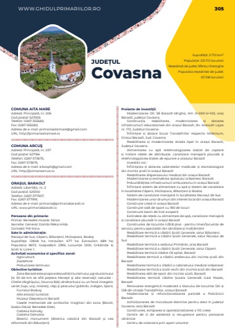WWW.GHIDULPRIMARIILOR.RO 305Suprafa%u021b%u0103: 3.710 km%u00b2Popula%u021bie: 231.172 locuitoriRe%u0219edin%u021b%u0103 de jude%u021b: Sf%u00e2ntu GheorghePopula%u021bia re%u0219edin%u021bei de jude%u021b: 67.108 locuitoriJUDE%u021aULCovasnaCOMUNA AITA MAREAdres%u0103: Principal%u0103, nr. 206Cod po%u0219tal: 527005Telefon: 0267-355582; Fax: 0267-355582; Adresa de e-mail: primariaaitamare@gmail.comURL: http://primariaaitamare.roCOMUNA ARCU%u015eAdres%u0103: Principal%u0103, nr. 237Cod po%u0219tal: 527166Telefon: 0267-373675; Fax: 0267-373675; Adresa de e-mail: arkosph@gmail.comURL: http://primariaarcus.roORA%u0218UL BARAOLTAdres%u0103: Libert%u0103%u0163ii, nr. 2Cod po%u0219tal: 525100Telefon: 0267-377507; Fax: 0267-377919; Adresa de e-mail: primaria@primariabaraolt.roURL: www.primariabaraolt.roPersoane din primarie:Primar: Benedek-Husz%u00e1r J%u00e1nosSecretar General: Dombi R%u00e9ka HildaContabil: P%u00e1l IlonaSate %u00een administra%u021bie:Raco%u015ful de Sus,%u00a0C%u0103peni,%u00a0Bibor%u0163eni, Miclo%u015foara,%u00a0Bodo%u015fSuprafa%u021ba:%u00a0 12848 ha; Intravilan:%u00a0 677 ha; Extravilan:%u00a0 689 ha; Popula%u021bia:%u00a0 8672; Gospod%u0103rii:%u00a0 2395; Locuin%u021be:%u00a0 1200; Gr%u0103dini%u021be:%u00a0 6; %u0218coli:%u00a06; Licee:%u00a01; Activitati economice si specifice zonei:Agricultur%u0103Zootehnie Prelucrarea lemnuluiObiective turistice:Zona Baraolt este propice dezvolt%u0103rii turismului, agroturismului (la 30 de km se afl%u0103 pe%u015ftera Mere%u015fti %u015fi alte rezerva%u0163ii naturale - Cheile V%u00e2rghi%u015fului, Ozunca B%u0103i) v%u00e2n%u0103toritului cu un fond cinegetic variat (lupi, ur%u015fi, mistre%u0163i, r%u00e2%u015fi) %u015fi pescuitul (p%u0103str%u0103v, indigen, lipan)Furnalul BodvajAlte atrac%u0163ii turistice:Muzeul Depresiunii BaraoltCasele memoriale ale scriitorilor maghiari din zona (B%u00f3roti, Szabo D%u00e1vid, Benedek Elek)Castelul KalnokyCastelul DalnokiaBiserici monument (Biserica catolic%u0103 din Baraolt %u015fi cea reformat%u0103 din Bibor%u0163eni)Proiecte de investi%u0163ii:Modernizarea DC 38 Baraolt-V%u0103rghi%u0219, Km 0+000-5+100, ora%u0219 Baraolt, jude%u021bul CovasnaConstruc%u021bia, reabilitarea, modernizarea %u0219i dotarea infrastructurii educa%u021bionale din ora%u0219ul Baraolt, Str. Kossuth Lajos nr. 172, Jude%u021bul Covasna%u00cenfiin%u021bare %u0219i dotare Scuar Trandafirilor respectiv Millenium, Ora%u0219ul Baraolt, Jud. CovasnaReabilitarea %u0219i modernizarea strada Apei %u00een ora%u0219ul Baraolt, Jude%u021bul%u00a0CovasnaAlimentarea cu ap%u0103%u00a0 retehnologizarea sta%u021biei de captare %u0219i tratare re%u021bele de distribu%u021bie, canalizare menajer%u0103 pluvial%u0103 %u0219i retehnologizarea sta%u021biei de epurare a ora%u0219ului BaraoltInvesti%u021bii noi :%u00cenfiin%u021barea %u0219i dotarea cabinetelor medicale %u0219i stomatologice din incinta %u0219colii %u00een ora%u0219ul BaraoltReabilitarea dispensarului medical din ora%u0219ul BaraoltModernizarea %u0219i extinderea spitalului or%u0103%u0219enesc Baraolt%u00cembun%u0103t%u0103%u021birea infrastructurii ambulatoriu %u00een ora%u0219ul Baraolt%u00cenfiin%u021bare sistem de alimentare cu ap%u0103 %u0219i sistem de canalizare %u00een localitatea C%u0103peni, Miclo%u0219oara, Bibor%u021beni %u0219i Bodo%u0219Sistem de canalizare menajer%u0103%u00a0%u00een localitatea Raco%u0219ul de SusModernizarea unor drumuri din interes local din ora%u0219ul BaraoltConstruire cre%u0219%u0103 %u00een ora%u0219ul BaraoltConstruire sal%u0103 de sport cu 180 de locuriConstruire bazin de %u00eenot acoperitExtindere de re%u021bele cu alimentare de ap%u0103, canalizare menajer%u0103 %u0219i canalizare pluvial%u0103 %u00een ora%u0219ul BaraoltConstruirea de locuin%u021be nZEB plus - pentru tineri/locuin%u021be de serviciu pentru speciali%u0219ti din s%u0103n%u0103tate %u0219i %u00eenv%u0103%u021b%u0103m%u00e2ntReabilitare termic%u0103 a cl%u0103dirii %u0218colii Generale, satul Bibor%u021beniReabilitare termic%u0103 a cl%u0103dirii %u0218colii Generale, satul Raco%u0219ul de SusReabilitare termic%u0103 a sediului Prim%u0103riei, ora%u0219 BaraoltReabilitare termic%u0103 a cl%u0103dirii %u0218colii Generale, satul C%u0103peniReabilitare termic%u0103 cl%u0103dire C6 spital, BaraoltReabilitarea termic%u0103 a cl%u0103dirii atelierului din incinta %u0219colii din BaraoltReabilitarea termic%u0103 a cl%u0103dirii a cabinetului medical or%u0103%u0219enescReabilitarea termic%u0103 a %u0219colii vechi din incinta %u0219coli din BaraoltReabilitarea s%u0103lii de sport din incinta %u0219colii, BaraoltReabilitarea termic%u0103 cl%u0103dire %u0218coala General%u0103 Gaal Mozes, BaraoltRenovarea energetic%u0103 moderat%u0103 a blocului de locuin%u021be 12A %u0219i 12B din strada Trandafirilor, ora%u0219ul BaraoltModernizarea %u0219i refunc%u021bionalizarea par%u021bial%u0103 a Policlinicii BaraoltAchizi%u021bionarea de microbuze electrice pentru elevi %u00een jude%u021bul Covasna, ora%u0219 BaraoltConstruirea, echiparea %u0219i opera%u021bionalizarea a 110 cre%u0219eCentre de zi de asisten%u021b%u0103 %u0219i recuperare pentru persoane v%u00e2rstniceCentru de colectare prin aport voluntar