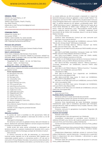 WWW.GHIDULPRIMARIILOR.RO JUDE%u021aUL D%u00c2MBOVI%u021aA / 317ORA%u0218UL FIENIAdres%u0103: Ing. Aurel Rainu, nr. 67Cod po%u0219tal: 135100Telefon: 0245-774070, 774071, 774072,; Fax: 0245-774073; Adresa de e-mail: fieni.primaria@gmail.comURL: www.fieni.roCOMUNA FINTAAdres%u0103: Str. Eroilor, Nr. 1Cod po%u0219tal: 137220Telefon: 0245-242495; Fax: 0245-242495; Adresa de e-mail: primariafinta@yahoo.comURL: https://primariacomuneifinta.ro/Persoane din primarie:Primar: ec.%u00a0Florentin OpreaConsilier cu atribu%u021bii de Secretar General: Rodica PredaContabil: Aurelia Alina GrigoreSate %u00een administra%u021bie:Finta-Mare, Gheboaia, Bechene%u015fti, Finta-VecheSuprafa%u021ba:%u00a04985,52 ha; Intravilan:%u00a0308,85 ha; Extravilan:%u00a04676,67 ha; Popula%u021bia:%u00a03800; Gospod%u0103rii:%u00a01426; Locuin%u021be:%u00a01586; Gr%u0103dini%u021be:%u00a03; %u0218coli:%u00a02; Cum se ajunge in localitate:T%u00e2rgovi%u0219te DJ 711 %u2013 Baleni %u2013 DC 28 %u2013 DJ 720A FintaPloie%u0219ti %u2013 DN1A %u2013 DJ 720A Finta Bucure%u0219ti %u2013 DN1A %u2013 DJ 720A FintaActivitati economice si specifice zonei:Agricultura, cre%u0219terea animalelor, producerea %u0219i comercializarea produselor lactateFirme reprezentative:SC Semagrim Flor S.R.LS.C Simflor S.R.LS.C Romgaz S.R.LS.C. Ghecosflor S.R.LS.C Semalex S.R.LS.C Agro Floendy Cen S.R.LS.C. TCI Grup SO S.R.LS.C. SAS Pharma Plus S.R.LS.C. Savior Pharma Vista S.R.LS.C. Fadel Farm S.R.LS.C. CNM Test Auto S.R.LS.C. RegiaNicusor S.R.LS.C. Abysar Ang S.R.LS.C. Erk Pak Com S.R.LS.C. Leone Alfa Group S.R.LS.C. Raluca Ardeleanu Trans S.R.LProduc%u0103tori locali:Sima St%u0103nic%u0103, Oprea Florentin, Ardeleanu RalucaProduse locale:Cereale, fructe si legume, produse lactateMe%u0219te%u0219ugari: Ol%u0103ritObiective turistice:%u00cen partea de nord%u00a0 a localit%u0103%u0163ii se afl%u0103 aproximativ 1000 de ha de p%u0103dure, unde se g%u0103se%u015fte o rezerva%u0163ie de zimbri cu 42 de exemplareDescoperiri arheologicePe teritoriul comunei se g%u0103se%u0219te limesul denumit Brazda lui Novac, dat%u00e2nd din perioada st%u0103p%u00e2nirii romane asupra Munteniei %u00een timpul lui Constantin cel Mare.Exist%u0103 scrieri din acea vreme ,arheologii au descoperit pe teritoriul comunei o a%u0219ezare medieval%u0103 din secolele VIII-X, care a c%u0103p%u0103tat statutul de sit arheologic protejat de Ministerul Culturii.Monumente%u00cen centrul comunei se afl%u0103, de asemenea, un monument %u00eenchinat eroilor dezvelit tot la 26 octombrie 1933. Realizat prin subscrip%u021bie public%u0103 pentru a comemora jertfa a 37 de eroi ai comunei %u00een Primul R%u0103zboi Mondial, monumentul a fost dezvelit la 26 octombrie 1933. Pe obeliscul din beton, surmontat de un vultur cu aripile def%u0103cute, se afl%u0103 %u00eencruci%u0219at%u0103 o baionet%u0103 %u0219i o teac%u0103 de baionet%u0103 deasupra c%u0103rora se g%u0103se%u0219te o casc%u0103 model %u201cAdrian%u201d. Pe frontispiciu are %u00eenscris:%u201d1916 -%u00a01918/ Cinste %u0219i laud%u0103 eroilor/ Comuna Finta/ %u00centregirea Neamului/ Lupta de la Finta/ 22 %u0219i 23 novembrie 1916%u201d. %u00cen p%u0103r%u021bile laterale se mai g%u0103sesc urm%u0103toarele texte: %u201c1877 -%u00a01878/ Domnitorul Carol I%u201d%u00a0(dreapta) %u0219i %u201c1653 mai 15/ lupta de la Finta/ Matei Basarab/ %u0219i/ Vasile Lupu%u201d%u00a0 (st%u00e2nga) Pe o plac%u0103 din bronz, fixat%u0103 pe postament, scrie %u201cRecuno%u0219tin%u021b%u0103 eroilor jertfi%u021bi pentru ap%u0103rarea patriei (22.VI.1941 -%u00a0 9.V.1945)%u201d, dedesubt fiind enumera%u021bi 28 de militari din localitate c%u0103zu%u021bi %u00een cel de-Al Doilea R%u0103zboi Mondial.%u00a0Monumente istoriceConform listei Ministerului Culturii pe raza comunei sunt urm%u0103toarele monumente istorice:220 DB-I-s--17047 Necropol%u0103 sat GHEBOAIA; comuna FINTA %u201cMovila din C%u00e2mpul Budii%u201d%u00a01639 Epoca medieval%u0103821 DB-II-m-B-17486 Biserica %u201cSf%u00e2ntul%u00a0 Nicolae%u201d%u00a0 sat FINTA MARE; comuna FINTA 1721, - rep. 1851822 DB-II-m-B-17487 Prim%u0103ria veche sat FINTA MARE; comuna FINTA 1910823 DB-II-a-B-17488 Ansamblul Conacului Hulea sat FINTA MARE; comuna FINTA sf%u00e2r%u0219itul%u00a0secolului al%u00a0XIX-lea824 DB-II-m-B-17488.01 Conacul Hulea sat FINTA MARE; comuna FINTA sf%u00e2r%u0219itul%u00a0secolului%u00a0al XIX-lea825 DB-II-m-B-17488.02 Moara de f%u0103in%u0103 a Conacului Hulea sat FINTA MARE; comuna FINTA sf%u00e2r%u0219itul%u00a0secolului al%u00a0XIX-lea847 DB-II-a-B-17510 Ansamblul bisericii %u201cSf%u00e2ntul%u00a0 Dumitru%u201d, %u201cCuvioasa Paraschiva%u201d%u00a0 sat GHEBOAIA; comuna FINTA Uli%u021ba Bisericii 1856848 DB-II-m-B-17510.01 Biserica %u201cSf%u00e2ntul Dumitru%u201d, %u201cCuvioasa Paraschiva%u201d sat GHEBOAIA; comuna FINTAUli%u021ba Bisericii 1856849 DB-II-m-B-17510.02 Turn clopotni%u021b%u0103 sat GHEBOAIA; comuna FINTA Uli%u021ba Bisericii 1919850 DB-II-m-B-17511 Casa Ioana D. Marin sat GHEBOAIA; comuna FINTA Uli%u021ba Bisericii 1910851 DB-II-m-B-17512 C%u00e2rcium%u0103 sat GHEBOAIA; comuna FINTA Str. Linia Grecule%u0219tilor 1925852 DB-II-m-B-17513 Casa Leana Gheorghe sat GHEBOAIA; comuna FINTA Uli%u021ba P%u0103durii 1910853 DB-II-m-B-17514 Casa Ion D%u0103nil%u0103 sat GHEBOAIA; comuna FINTA %u0218os. Principal%u0103 1900Evenimente:Ziua comunei FintaFacilit%u00e3%u0163i oferite investitorilor:Personal calificat %u00een toate domeniile de activitateReceptivitate %u0219i sprijin din partea Prim%u0103riei pentru investitoriCondi%u021bii de %u00eenfiin%u021bare microferme de animaleComuna Finta beneficieaz%u0103%u00a0 de toate facilit%u0103%u021biile necesare investitorilor: gaze, ap%u0103%u00a0 %u0219i canalizare, epurarea apei menajere, energie electric%u0103, re%u021bea de telefonie fix%u0103%u00a0%u0219i mobile, internet, cablu TV, drumuri modernePrezen%u021ba comunei %u00een apropierea municipiilor T%u00e2rgovi%u0219te (35 km) %u0219i Ploie%u0219ti (30 km)Proiecte de inv