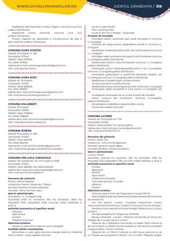 WWW.GHIDULPRIMARIILOR.RO JUDE%u021aUL D%u00c2MBOVI%u021aA / 319Reabilitare sal%u0103%u00a0festivit%u0103%u021bi %u00een satul F%u0103getu, comuna Gura Foii, jude%u021bul%u00a0D%u00e2mbovi%u021baReabilitate %u0219coala Catanele, comuna Gura Foii, jude%u021bul%u00a0D%u00e2mbovi%u021baProiect regional de dezvoltare a infrastructurii de ap%u0103%u00a0 %u0219i ap%u0103%u00a0uzat%u0103%u00a0din jude%u021bul D%u00e2mbovi%u021ba.COMUNA GURA OCNI%u0162EIAdres%u0103: Principal%u0103, nr. 180Cod po%u0219tal: 137240Telefon: 0245-673260; Fax: 0245-673532; Adresa de e-mail: primariaguraocnitei@gmail.comURL: www.guraocnitei.roCOMUNA GURA %u0218U%u0162IIAdres%u0103: str. PrincipalaCod po%u0219tal: 137245Telefon: 0245-682259; Fax: 0245-682187; Adresa de e-mail: primariagurasutii@yahoo.comURL: http://www.primariagurasutii.roCOMUNA HULUBE%u015eTIAdres%u0103: Principal%u0103Cod po%u0219tal: 137250Telefon: 0245-708600; Fax: 0245-708600; Adresa de e-mail: primaria.hulubesti@yahoo.comURL: https://primariahulubesti.ro/COMUNA IEDERAAdres%u0103: Principal%u0103, nr. 299Cod po%u0219tal: 137260Telefon: 0245-662018; Fax: 0245-662270; Adresa de e-mail: primaria.iedera@yahoo.comURL: https://sites.google.com/site/comunaiederaCOMUNA ION LUCA CARAGIALEAdres%u0103: Sat Ghirdoveni, Str. Principal%u0103 nr.1208Cod po%u0219tal: 137255Telefon: 0245-660332; Fax: 0245-660423; Adresa de e-mail: primariacaragiale@gmail.comURL: www.primariacaragiale.roPersoane din primarie:Primar:%u00a0Adrian N%u0103stase%u00a0Viceprimar: Marian Alexandru TrifescuSecretar General: Nicoleta Mihalcea%u00a0Contabil:%u00a0%u00a0Elena Carmen OlaruSate %u00een administra%u021bie:Ghirdoveni, I.L. Caragiale, MijaSuprafa%u021ba:%u00a0 6178 ha; Intravilan:%u00a0 254 ha; Extravilan:%u00a0 5924 ha; Popula%u021bia:%u00a0 7105; Gospod%u0103rii:%u00a0 2138; Locuin%u021be:%u00a0 2440; Gr%u0103dini%u021be:%u00a0 4; %u0218coli:%u00a05; Activitati economice si specifice zonei:IndustrieAgricultur%u0103Comer%u0163Industria lemnuluiObiective turistice:Muzeul %u015fi casa memorial%u0103 Ion Luca CaragialeFacilit%u00e3%u0163i oferite investitorilor:Alimentare cu ap%u0103, gaze naturale, energie electric%u0103, telefonie fix%u0103 %u015fi mobil%u0103 - toate re%u0163elele, internetAcces la calea ferat%u0103Parc Industrial MijaAcces la DN 710 A Ploie%u015fti - T%u00e2rgovi%u015fteProiecte de investi%u0163ii:Extindere sistem canalizare ap%u0103%u00a0 uzat%u0103%u00a0 menajer%u0103%u00a0 %u00een comuna I.L.CaragialeAchizi%u021bie de utilaje pentru gospod%u0103rire local%u0103%u00a0 %u00een comuna I.L. CaragialeReabilitare moderat%u0103%u00a0a %u0218COLII NR. I din sat Ghirdoveni,comuna I.L. CaragialeExtindere re%u021bea canalizare menajer%u0103%u00a0%u00een sat Ghirdoveni,comuna I.L.Caragiale,jude%u021bul%u00a0D%u00e2mbovi%u021baModernizare str%u0103zi %u00een satul Ghirdoveni, comuna I. L. Caragiale, jude%u021bul D%u00e2mbovi%u021baAmenajare %u0219an%u021buri betonate,prefabricate %u00een sat I.L.Caragiale, comuna I.L.Caragiale,jude%u021bul%u00a0D%u00e2mbovi%u021baAmenajare gard,cabine %u0219i platform%u0103%u00a0 betonat%u0103%u00a0 Stadion sat I.L.Caragiale,comuna I.L.Caragiale,jude%u021bul%u00a0D%u00e2mbovi%u021baReabilitare %u0219i modernizare unitate sanitar%u0103Construc%u021bie teren multifunc%u021bionalReabilitare trotuar %u0219i amenajare parcare cimitir sat I.L.CaragialeAmenajare rigol%u0103%u00a0carosabil%u0103%u00a0%u00een zona Centru I.L.Caragiale, DN 72Anvelopare, amenajare drum acces %u0219i spa%u021bii de recreereC%u0103min Cultural sat Ghirdoveni, comuna I.L.Caragiale, jude%u021bul%u00a0D%u00e2mbovi%u021baConsolidare %u0219i reabilitare %u0219arpant%u0103%u00a0Bloc centruConstruire capel%u0103%u00a0mortuar%u0103COMUNA LUCIENIAdres%u0103: Str. Principal%u0103, Nr. 779Cod po%u0219tal: 137265Telefon: 0245-242530; Fax: 0245-242574; Adresa de e-mail: primaria_lucieni@yahoo.comURL: www.primarialucieni.roPersoane din primarie:Primar: Vasile Ti%u021baViceprimar: %u00a0Emil Cornel BajenaruSecretar General:%u00a0Iuliana B%u0103janContabil %u0218ef Birou:%u00a0Mirela Munteanu%u00a0Sate %u00een administra%u021bie:Lucieni, OlteniSuprafa%u021ba:%u00a0 4444,32 ha; Intravilan:%u00a0 262 ha; Extravilan:%u00a0 4182 ha; Popula%u021bia:%u00a03131; Gospod%u0103rii:%u00a01130; Locuin%u021be:%u00a02498; Gr%u0103dini%u021be:%u00a02; %u0218coli:%u00a02; Activitati economice si specifice zonei:Comer%u0163Balastier%u0103Mor%u0103ritAgricultur%u0103Cre%u015fterea animalelorCultivarea pomilor fructiferiAlbin%u0103ritFlor%u0103ritObiective turistice:Comuna este la 9 km de T%u00e2rgovi%u015fte %u00een lungul DN 72Este str%u0103b%u0103tut%u0103 de r%u00e2ul D%u00e2mbovi%u0163a %u015fi este atestat%u0103 documentar din secolul XVAre trei biserici: Lucieni %u201cCuvioasa Paraschiva%u201d, Ciurari %u201cAdormirea Maicii Domnului%u201d %u015fi Olteni %u201cDuminica Tuturor Sfin%u0163ilor%u201dAre dou%u0103 monumente %u00eenchinate %u00centregirii Neamului %u00een Lucieni %u015fi OlteniAre ap%u0103 potabil%u0103 prin Programul SAPARDBarajul V%u0103c%u0103re%u015fti - Lucieni - Per%u015finari se %u00eentinde pe latura din dreapta de-a lungul satului LucieniDispune de o bibliotec%u0103 comunal%u0103, cu peste 7200 volume %u015fi de una %u015fcolar%u0103, cu 3500 volume, ambele cu sal%u0103 de lectur%u0103 dotat%u0103 corespunz%u0103tor, inclusiv internetDispune de un C%u0103min Cultural cu 400 locuri, precum %u015fi de un %u201cMuzeu de etnografie %u015fi folclor%u201d. Aici s-a aflat %u201cP%u0103durea %u0162eapa%u201d