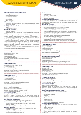 WWW.GHIDULPRIMARIILOR.RO JUDE%u021aUL D%u00c2MBOVI%u021aA / 327Activitati economice si specifice zonei:Extrac%u0163ie petrolCultivarea p%u0103m%u00e2ntuluiCre%u015fterea animalelorComer%u0163Agricultur%u0103Mic%u0103 industrieObiective turistice:Rezerva%u0163ia natural%u0103 Mozac la 3 km de comun%u0103 %u015fi Casa P%u0103durii%u201cBrazda lui Novac%u201dFacilit%u00e3%u0163i oferite investitorilor:TerenAcces drum jude%u0163eanProiecte de investi%u0163ii:Proiecte de viitor:Reabilitare drumuri comunale %u00een comuna R%u0103sc%u0103e%u0163i - Anghel SalignyExtindere re%u0163ea de canalizare %u00een satele R%u0103sc%u0103e%u0163i %u015fi Vultureanca, comuna R%u0103sc%u0103e%u0163i, jude%u0163ul D%u00e2mbovi%u0163a - Etapa II - Anghel SalignyAmenajare %u015fan%u0163uri betonate %u015fi accese propriet%u0103%u0163i %u00een comuna R%u0103sc%u0103e%u0163i, jude%u0163ul D%u00e2mbovi%u0163a - Anghel SalignyAsfaltare %u015fi modernizare str%u0103zi %u00een comuna R%u0103sc%u0103e%u0163i, jude%u0163ul D%u00e2mbovi%u0163a - Programul jude%u0163ean de dezvoltare local%u0103 D%u00e2mbovi%u0163aModernizare %u015fi dotare %u015ecoala Gimnazial%u0103 cu clasele I-VIII R%u0103sc%u0103e%u0163i, comuna R%u0103sc%u0103e%u0163i, jude%u0163ul D%u00e2mbovi%u0163a - Compania Na%u0163ional%u0103 de Investi%u0163iiDezvoltare re%u0163ea inteligent%u0103 de distribu%u0163ie a gazelor naturale %u00een comuna R%u0103sc%u0103e%u0163i, jude%u0163ul D%u00e2mbovi%u0163aCOMUNA R%u0102ZVADAdres%u0103: Principala, nr. 350Cod po%u0219tal: 137395Telefon: 0245-677516; Fax: 0245-677516, 677530; Adresa de e-mail: primariarazvad@yahoo.comURL: http://comunarazvad.roCOMUNA R%u00c2U ALBAdres%u0103: Sat R%u00e2u Alb de Jos, nr. 750Cod po%u0219tal: 137027Telefon: 0245-240740; Fax: 0245-240740; Adresa de e-mail: primariaraualb@yahoo.comURL: www.primariaraualb.roCOMUNA RUNCUAdres%u0103: Principal%u0103, nr. 17Cod po%u0219tal: 137400Telefon: 0245-234003; Fax: 0245-234003; Adresa de e-mail: primaria.runcu@yahoo.comURL: www.primaria-runcu-db.roPersoane din primarie:Primar: Gheorghe%u00a0BrebeanuViceprimar: Constantin%u00a0SolomonSecretar General:%u00a0Veronica - Mihaela%u00a0MaricaContabil: Maria-Mirabela%u00a0FoleaSate %u00een administra%u021bie:Runcu, B%u0103deni, Piatra, Sili%u015ftea, Ferestre, BrebuSuprafa%u021ba:%u00a0 7946ha; Intravilan:%u00a0 860 ha; Extravilan:%u00a0 7055 ha; Popula%u021bia:%u00a0 4090; Gospod%u0103rii:%u00a0 1592; Locuin%u021be:%u00a0 2032; Gr%u0103dini%u021be:%u00a0 3; %u0218coli:%u00a01; Cum se ajunge in localitate:Cu mijloacele de transport %u00een comun, automobile.Activitati economice si specifice zonei:Turism, pomicultur%u0103, cre%u0219terea animalelor, silvicultur%u0103Produse locale: Miere, fructe, %u021buic%u0103, zacusc%u0103, ciuperciObiective turistice:Crucea din V%u00e2rful lui In, a treia cruce ca m%u0103rime din %u021bar%u0103Cascada %u201dLa Blide%u201dPeisajul deosebit; pensiunile S%u0103rb%u0103torile anuale tradi%u021bionale, etc.Evenimente:R%u0103v%u0103%u0219itul oilorHaidook Summer FestHramul bisericilor Focul lui SumedruFacilit%u00e3%u0163i oferite investitorilor:Asigurarea accesului la propriet%u0103%u021bile pe care urmeaz%u0103 s%u0103 construiiasc%u0103, fie prin pietruirea, fie prin sfaltarea drumului care duce la acestea.Proiecte de investi%u0163ii:Printre proiectele finalizate se num%u0103r%u0103:Construirea C%u0103minului Cultural din satul BrebuConstruirea podului din punctul %u201dM%u0103noiu%u201dReabilitarea podului din punctul %u201dM%u0103noiu%u201dInstalarea panourilor solare pentru prim%u0103ria comunei RuncuCre%u0219terea eficien%u021bei energetice a sistemului de iluminat public prin %u00eenlocuirea vechilor l%u0103mpi, cu led-uriExtinderea re%u021belei de alimentare cu ap%u0103 potabil%u0103Regularizarea r%u00e2ului IalomicioaraConstruirea parcului din satul B%u0103deniModernizarea DJ 712 A %u00eentre localit%u0103%u021bile Runcu si R%u00e2ul Alb Modernizarea prin asfaltare a drumurilor locale lot II, etc.COMUNA S%u0102LCIOARAAdres%u0103: Sat B%u0103ne%u0219tiCod po%u0219tal: 137410Telefon: 0245-723661; Fax: 0245-723695; Adresa de e-mail: relatii.publicul@comunasalcioara.roURL: https://comunasalcioara.ro/COMUNA SLOBOZIA MOAR%u0102Adres%u0103: str. Primariei ,nr. 25Cod po%u0219tal: 137420Telefon: 0245-724174; Adresa de e-mail: office@comunasloboziamoara.roURL: https://www.comunasloboziamoara.ro/COMUNA %u015eELARUAdres%u0103: nr. 162Cod po%u0219tal: 137425Telefon: 0245-723024; Fax: 0245-723371; Adresa de e-mail: primaria.selarudb@gmail.comURL: http://comunaselaru.ro/Persoane din primarie:Primar: Matei Gheorghi%u021b%u0103Viceprimar: Relu Dr%u0103gu%u0219inSecretar General: Emilian- Petre DragneContabil: Niculina Mih%u0103e%u015fSate %u00een administra%u021bie:%u015eelaru, Fierbin%u0163i, GlogoveanuSuprafa%u021ba:%u00a0 8253 ha; Intravilan:%u00a0 428 ha; Extravilan:%u00a0 7825 ha; Popula%u021bia:%u00a0 2890; Gospod%u0103rii:%u00a0 1817; Locuin%u021be:%u00a0 2316; Gr%u0103dini%u021be:%u00a0 3; %u0218coli:%u00a02; Activitati economice si specifice zonei:Cultivarea terenului %u0219i cre%u0219terea animalelorComer%u021bAlimentatire public%u0103Mor%u0103ritSp%u0103l%u0103torii %u0219i vulcaniz%u0103riEvenimente:Zilele comuneiCupa seceri%u0219uluiEvenimente desf%u0103%u0219urate %u00een luna IulieFacilit%u00e3%u0163i oferite investitorilor:Pot fi oferite suprafe%u0163e mari de terenuri %u00een condi%u0163ii foarte avantajoaseSpa%u0163ii comercialeFor%u0163%u0103 de munc%u0103Oportunit%u0103%u021biPot fi oferite suprafe%u021be de terenuri agricole %u00een condi%u021bii avantajoase