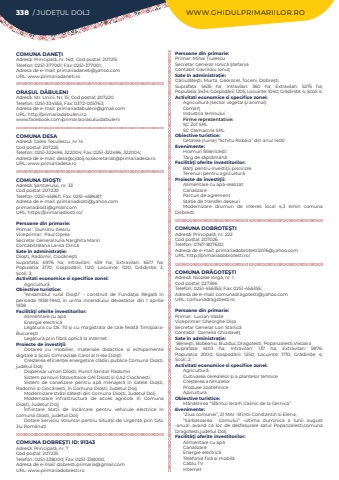 338 / JUDE%u021aUL DOLJ WWW.GHIDULPRIMARIILOR.ROCOMUNA DANE%u0162IAdres%u0103: Principal%u0103, nr. 160; Cod po%u0219tal: 207215Telefon: 0251-377001; Fax: 0251-377001; Adresa de e-mail: primariadaneti@yahoo.comURL: www.primariadaneti.roORA%u0218UL D%u0102BULENIAdres%u0103: Str. Unirii, Nr. 15; Cod po%u0219tal: 207220Telefon: 0251-334555; Fax: 0372-005763; Adresa de e-mail: primariadabuleni@gmail.comURL: http://primariadabuleni.rowww.facebook.com/primariaorasuluidabuleniCOMUNA DESAAdres%u0103: Calea Teculescu ,nr 14Cod po%u0219tal: 207225Telefon: 0251-322496, 322004; Fax: 0251-322496, 322004; Adresa de e-mail: desa@cjdolj.ro,secretariat@primariadesa.roURL: www.primariadesa.roCOMUNA DIO%u015eTIAdres%u0103: %u015eantierului, nr. 33Cod po%u0219tal: 207230Telefon: 0251-458611; Fax: 0251-458687; Adresa de e-mail: primariadiosti@yahoo.comprimariadiosti@gmail.comURL: https://primariadiosti.ro/Persoane din primarie:Primar:%u00a0%u00a0Dumitru Iliescu%u00a0Viceprimar: %u00a0Paul Oprea%u00a0Secretar General:Iulia Narghita Marin%u00a0Contabil:Ileana Larisa Dinc%u0103%u00a0Sate %u00een administra%u021bie:Dio%u015fti, Radomir, Cioc%u0103ne%u015ftiSuprafa%u021ba:%u00a0 6976 ha; Intravilan:%u00a0 459 ha; Extravilan:%u00a0 6517 ha; Popula%u021bia:%u00a0 3170; Gospod%u0103rii:%u00a0 1120; Locuin%u021be:%u00a0 1120; Gr%u0103dini%u021be:%u00a0 3; %u0218coli:%u00a03; Activitati economice si specifice zonei:Agricultur%u0103Obiective turistice:%u201cAnsamblul rural Dio%u015fti%u201d - construit de Funda%u0163ia Regal%u0103 %u00een perioada 1938-1940, %u00een urma incendiului devastator din 1 aprilie 1938Facilit%u00e3%u0163i oferite investitorilor:Alimentare cu ap%u0103Energie electric%u0103Leg%u0103tura cu DE 70 %u015fi cu magistrala de cale ferat%u0103 Timi%u015foaraBucure%u015ftiLeg%u0103tur%u0103 prin fibr%u0103 optic%u0103 la internetProiecte de investi%u0163ii:Dotarea cu mobilier, materiale didactice %u0219i echipamente digitale a %u0218colii Gimnaziale Carol al II-lea Dio%u0219tiCre%u0219terea eficien%u021bei energetice cl%u0103diri publice Comuna Dio%u0219ti, jude%u021bul DoljDispensar uman Dio%u0219ti, Punct Sanitar RadomirSistem panouri fotovoltaice GA1 Dio%u0219ti%u00a0%u0219i GA2 Cioc%u0103ne%u0219tiSistem de canalizare pentru ap%u0103%u00a0 menajer%u0103%u00a0 %u00een satele Dio%u0219ti, Radomir %u0219i Cioc%u0103ne%u0219ti, %u00een Comuna Dio%u0219ti, Jude%u021bul DoljModernizare str%u0103zi s%u0103te%u0219ti din Comuna Dio%u0219ti, Jude%u021bul DoljModernizare infrastructur%u0103%u00a0 de acces agricola %u00een Comuna Dio%u0219ti, Jude%u021bul Dolj%u00cenfiin%u021bare Sta%u021bii de %u00eenc%u0103rcare pentru vehicule electrice %u00een comuna Dio%u0219ti, jude%u021bul DoljDotare Serviciu Voluntar pentru Situa%u021bii de Urgen%u021b%u0103%u00a0prin GAL Jiu Rom%u00e2na%u021biCOMUNA DOBRE%u015eTI ID: 91343Adres%u0103: Principal%u0103, nr. 7Cod po%u0219tal: 207235Telefon: 0251-338000; Fax: 0251-338000; Adresa de e-mail: dobresti.primaria@gmail.comURL: www.primariadobresti.roPersoane din primarie:Primar:%u00a0Mihai %u021aiulescuSecretar General: Ionic%u0103 %u015etefaniaContabil: Gavriloiu Ionu%u0163Sate %u00een administra%u021bie:C%u0103ciul%u0103te%u015fti, Murta, Georocel, Toceni, Dobre%u015ftiSuprafa%u021ba:%u00a0 5635 ha; Intravilan:%u00a0 360 ha; Extravilan:%u00a0 5275 ha; Popula%u021bia:%u00a02434; Gospod%u0103rii:%u00a01205; Locuin%u021be:%u00a01040; Gr%u0103dini%u021be:%u00a04; %u0218coli:%u00a04; Activitati economice si specifice zonei:Agricultur%u0103 (sector vegetal %u015fi animal)Comer%u0163Industria lemnuluiFirme reprezentative:SC Zof SRL SC Clemarcris SRLObiective turistice:Cetatea (ruine) %u201cSchitu Robaia%u201d din anul 1400Evenimente:Hramuri Biserice%u015ftiT%u00e2rg de s%u0103pt%u0103m%u00e2n%u0103Facilit%u00e3%u0163i oferite investitorilor:B%u0103l%u0163i pentru investi%u0163ii piscicoleTerenuri pentru agricultur%u0103Proiecte de investi%u0163ii:Alimentare cu ap%u0103-realizatCanalizareParcuri de agrementSta%u021bie de transfer de%u0219euriModernizare drumuri de interes local 4,3 kmin comuna DobrestiCOMUNA DOBROTE%u015eTIAdres%u0103: Principal%u0103, nr. 222Cod po%u0219tal: 207026Telefon: 0767-807630; Adresa de e-mail: primariadobrotesti2016@yahoo.comURL: http://primariadobrotesti.ro/COMUNA DR%u0102GOTE%u015eTIAdres%u0103: Nicolae Iorga, nr. 1Cod po%u0219tal: 227396Telefon: 0251-456355; Fax: 0251-456355; Adresa de e-mail: comunadragotesti@yahoo.comURL: comunadragotesti.roPersoane din primarie:Primar: %u00a0Lucian VasileViceprimar: Gheorghe Di%u0219aSecretar General: Lori Stanic%u0103Contabil: %u00a0Cornelia Ghizdave%u0163%u00a0Sate %u00een administra%u021bie:%u00a0Bene%u015fti, Bobeanu, Buzduc,Dragotesti, Popanzalesti,ViisoaraSuprafa%u021ba:%u00a0 6013 ha; Intravilan:%u00a0 137 ha; Extravilan:%u00a0 5876; Popula%u021bia:%u00a0 2000; Gospod%u0103rii:%u00a0 1250; Locuin%u021be:%u00a0 1170; Gr%u0103dini%u021be:%u00a0 4; %u0218coli:%u00a02; Activitati economice si specifice zonei:Agricultur%u0103Cultivarea cerealelor %u015fi a plantelor tehniceCre%u015fterea animalelorProduse zootehniceApiculturaObiective turistice:M%u0103n%u0103stirea %u201cSf%u00e2ntul Ierarh Calinic de la Cernica%u201dEvenimente:%u201cZiua comunei%u201d, 21 MAI -Sfintii Constantin si Elena;%u201cSarbatoarea%u00a0 Cornului%u201d -ultima duminica a lunii august -anual ,avand ca loc de desfasurare satul Popanzalesti,comuna Dragotesti,judetul DoljFacilit%u00e3%u0163i oferite investitorilor:Alimentare cu ap%u0103CanalizareEnergie electric%u0103Telefonie fix%u0103%u00a0%u0219i mobil%u0103Cablu TVInternet
