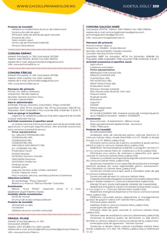 WWW.GHIDULPRIMARIILOR.RO JUDE%u021aUL DOLJ / 339Proiecte de investi%u0163ii:Asfaltare %u0219i modernizare drumuri de interes localConstruc%u021bie sal%u0103%u00a0de sport%u00cenfiin%u021bare re%u021bea de distribu%u021bie gaze naturaleProiecte de viitorTeren sintetic sportCentru de permanen%u021b%u0103%u00a0medical%u0103 Panouri fotovoltaiceCOMUNA DR%u0102NICAdres%u0103: Principal%u0103, nr. 762; Cod po%u0219tal: 207250Telefon: 0251-351070, 351102; Fax: 0251-351070; Adresa de e-mail: dolj.primariadranic@yahoo.comURL: www.primariadranic.roCOMUNA F%u0102RCA%u015eAdres%u0103: Principal%u0103, nr. 218; Cod po%u0219tal: 207255Telefon: 0251-440052; Fax: 0251-440052; Adresa de e-mail: primariafarcas@yahoo.comURL: www.primariafarcas.roPersoane din primarie:Primar: Ion Valeriu MiereanuViceprimar: Nicolae Speriu%u0219Secretar General: Dumitru DinuContabil: Gabriel B%u0103lanSate %u00een administra%u021bie:Am%u0103r%u0103%u015fti, F%u0103rca%u015f, Golumbu, Golumbelu, Plopu-Am%u0103r%u0103%u015ftiSuprafa%u021ba:%u00a04757, 18 ha; Intravilan:%u00a0105, 79 ha; Extravilan:%u00a04651,39 ha; Popula%u021bia:%u00a02047; Gospod%u0103rii:%u00a0744; Locuin%u021be:%u00a0852; Gr%u0103dini%u021be:%u00a03; %u0218coli:%u00a03; Cum se ajunge in localitate:Legatura cu resedin%u021ba jude%u021bului Dolj este asigurat%u0103%u00a0de Dj 606 Craiova-Meline%u0219ti-F%u0103rca%u0219Activitati economice si specifice zonei:La nivelul comunei F%u0103rca%u0219%u00a0principala ramur%u0103%u00a0de activitate este agricultura, %u00een principal legumicultura. Alte activit%u0103%u021bi economice sunt comer%u021bul %u0219i prest%u0103rile servicii.Firme reprezentative:S.C. MELCATI PRODIMEX SRLCODEMAUNU SRLCODEMADOI SRL CODEMATREI SRLMIKI NAILS AND BEAUTY SRLS.C. CORIMED OIL SRLProduc%u0103tori locali:DUDAS NicolaeOLTEANU Dumitru-ClaudiuGRIGORAN DomnicaGOGONEA-Andrei Ion Produse locale:Cereale: gr%u00e2uLegume: tomate, ardei, vinete, castravetiFructe: c%u0103p%u0219une, mureFlori: muscat%u0103, petunia, zambila,cyclamen,crizantema.Obiective turistice:Sit archeologic %u2018%u2019Piscul Jidovilor%u201dBiserica cu Hramul %u2018%u2019Sf%u00e2ntul Nicolae%u2019%u2019 GolumbuEvenimente:Balciul %u2018%u2019Gura Plo%u0219tii%u2019%u2019 organizat anual %u00een a treia s%u0103pt%u0103%u00e2an%u0103%u00a0dup%u0103%u00a0Pa%u0219tele ortodoxFacilit%u00e3%u0163i oferite investitorilor:For%u021b%u0103%u00a0de munc%u0103Drumuri de acces corespunz%u0103toareProiecte de investi%u0163ii:Alimentare cu ap%u0103CanalizareAsfaltare drumuri %u0219i str%u0103zi comunaleORA%u0218UL FILIA%u015eIAdres%u0103: B-dul Raco%u0163eanu, nr. 160Cod po%u0219tal: 205300Telefon: 0371-517288; Fax: 0251-441453; Adresa de e-mail: primarie@netfil.ro,contact@primaria-filiasi.roURL: www.primaria-filiasi.roCOMUNA GALICEA MARECod po%u0219tal: 207270; Telefon: 0251-316004; Fax: 0251-316004; Adresa de e-mail: primariagaliceamare@yahoo.comprimariagaliceamare@gmail.comURL: www.primariagaliceamare.roPersoane din primarie:Primar:Cristian V%u0103duva%u00a0Viceprimar:%u00a0M%u0103d%u0103lin%u00a0%u00a0Andrei Banic%u0103Secretar General:%u015etefan Claudiu IovoaicaContabil: Mariana Emilia Chiri%u021b%u0103%u00a0Suprafa%u021ba:%u00a0 5887 ha; Intravilan:%u00a0 497,14 ha; Extravilan:%u00a0 5289,86 ha; Popula%u021bia:%u00a04268; Gospod%u0103rii:%u00a01708; Locuin%u021be:%u00a01708; Gr%u0103dini%u021be:%u00a02; %u0218coli:%u00a01; Activitati economice si specifice zonei:Agricultur%u0103Cre%u015fterea animalelorFirme reprezentative:BRENADO FOR HOUSE SRLDRAVIO COMGEN SRLCLEAN RAUL SRLMD AGRICOLA SRLPROFI ROM FOOD SRLProduc%u0103tori locali:Petrescu Nicolae (cereale)Riza Mircea Iulian (br%u00e2nz%u0103, miei, iezi)Mu%u015furoi IoanaProduse locale:Br%u00e2nzeturiLegumeCerealePlante oleaginoaseMe%u015fte%u015fugari:SC GLOB CONSERV SRL (meserie artizanal%u0103, imita%u0163ie bijuterii)Iacov M%u0103d%u0103lina Nicoleta - telefon: 0763165371Evenimente:Ziua comunei - 8 septembrie + B%u00e2lciul anualPia%u0163a agroalimentar%u0103 s%u0103pt%u0103m%u00e2nal%u0103 - duminica Trifon 1 februarieProiecte de investi%u0163ii:%u00ceN IMPLEMENTARE:Amplasare sta%u021bii de re%u00eenc%u0103rcare pentru vehicule electrice %u00een comuna Galicea Mare, strada Eternit%u0103%u021bii nr.2-CF 30430 %u0219i Strada Dun%u0103rii nr.2-CF 30623, jude%u021bul Dolj%u00cenfiin%u021bare centru social de zi pentru consiliere %u0219i sprijin pentru p%u0103rin%u021bi %u0219i copii %u00een comuna Galicea Mare, jude%u021bul DoljReabilitare Termoenergetic%u0103 Gr%u0103dini%u021be cu program normal nr.1 %u0219i nr.2, comuna Galicea Mare, str. Calafatului nr.10-12, jude%u021bul Dolj%u00cenfiin%u021barea unui centru de colectare a de%u0219eurilor prin aport voluntar %u00een Comuna Galicea Mare, jude%u021bul DoljDotarea cu mobilier %u0219i echipamente digitale a %u0218colii Gimnaziale din comuna Galicea Mare, jude%u021bul DoljSprijinirea investi%u021biilor %u00een noi capacit%u0103%u021bi de producere a energiei electrice produse din surse regenerabile pentru autoconsumParc fotovoltaic %u00een Galicea Mare, jude%u021bul Dolj%u201dConstruire infrastructur%u0103%u00a0ap%u0103 uzat%u0103 %u0219i extindere re%u021bea de ap%u0103 %u00een comuna Galicea MareConstruire sal%u0103 de sport %u00een comuna Galicea MareCre%u0219terea eficien%u021bei energetice la %u0218coala Gimnazial%u0103 Galicea Mare ,Corpul 1-Strada Craiovei nr.1, Comuna Galicea Mare, Judetul DoljPROIECTE NOI: (FAZA DEPUNERE CERERE DE FINAN%u021aARE)Reabilitare Energetic%u0103%u00a0a %u0218colii Gimnaziale Galicea Mare, corpul nr 3 %u0219i corpul nr 4 , Comuna Galicea Mare Judetul DoljReabilitare energetic%u0103%u00a0dispensar %u0219i Farmacie, Comuna Galicea Mare, jude%u021bul DoljPlatforma comunal%u0103%u00a0 pentru depozitarea %u0219i managementul gunoiul de grajd %u00een cadrul UAT Galicea Mare, jude%u021bul Dolj%u00cenfiin%u021bare pia%u021b%u0103%u00a0volant%u0103Asfaltare str%u0103zi %u00een comuna Galicea Mare, jude%u021bul DoljAmenajare alei pietonale%u00cenfiin%u021