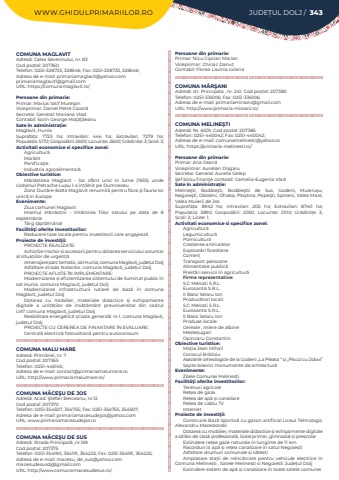 WWW.GHIDULPRIMARIILOR.RO JUDE%u021aUL DOLJ / 343COMUNA MAGLAVITAdres%u0103: Calea Severinului, nr. 83Cod po%u0219tal: 207360Telefon: 0251-328733, 328546; Fax: 0251-328733, 328546; Adresa de e-mail: primariamaglavit@yahoo.comprimariamaglavit1@gmail.comURL: https://comunamaglavit.ro/Persoane din primarie:Primar:%u00a0Marius Iosif Mure%u015fan%u00a0Viceprimar:%u00a0Daniel Petre Cioan%u0103%u00a0Secretar General: Mariana VladContabil: Sorin George Mo%u0163%u0103%u0163%u0103eanuSate %u00een administra%u021bie:Maglavit, HuniaSuprafa%u021ba:%u00a0 7723 ha; Intravilan:%u00a0 444 ha; Extravilan:%u00a0 7279 ha; Popula%u021bia:%u00a05170; Gospod%u0103rii:%u00a02600; Locuin%u021be:%u00a02600; Gr%u0103dini%u021be:%u00a03; %u0218coli:%u00a03; Activitati economice si specifice zonei:Agricultur%u0103Mor%u0103ritPanifica%u0163ieIndustria agroalimentar%u0103Obiective turistice:M%u00e2n%u0103stirea Maglavit - loc sf%u00e2nt unic %u00een lume (1935) unde ciobanul Petrache Lupu l-a %u00eent%u00e2lnit pe DumnezeuZona Dun%u0103re-Balta Maglavit renumit%u0103 pentru flora %u015fi fauna lor unic%u0103 %u00een EuropaEvenimente:Ziua comunei MaglavitHramul M%u0103n%u0103stirii - %u00eent%u00e2lnirea fiilor satului pe data de 8 septembrieT%u00e2rg s%u0103pt%u0103m%u00e2nalFacilit%u00e3%u0163i oferite investitorilor:Reducere taxe locale pentru investitorii care angajeaz%u0103Proiecte de investi%u0163ii:PROIECTE REALIZATE:Achizi%u021bie tractor %u0219i accesorii pentru dotarea serviciului voluntar al situa%u021biilor de urgen%u021b%u0103Amenajare parc tematic, sat Hunia, comuna Maglavi%u021b, jude%u021bul DoljAsfaltare strada Notarilor, comuna Maglavi%u021b, jude%u021bul DoljPROIECTE AFLATE %u00ceN IMPLEMENTARE:Modernizarea %u0219i eficientizarea sistemului de iluminat public %u00een sat Hunia, comuna Maglavi%u021b, jude%u021bul DoljModernizarea infrastructurii rutiere de baz%u0103 %u00een comuna Maglavi%u021b, jude%u021bul DoljDotarea cu mobilier, materiale didactice %u0219i echipamente digitale a unit%u0103%u021bilor de %u00eenv%u0103%u021b%u0103m%u00e2nt preuniversitar din cadrul UAT%u00a0comuna Maglavi%u021b, jude%u021bul DoljReabilitare energetic%u0103 %u0219coala general%u0103 nr.1, comuna Maglavi%u021b, jude%u021bul DoljPROIECTE CU CEREREA DE FINANTARE %u00ceN EVALUARE: Central%u0103 electric%u0103 fotovoltaic%u0103 pentru autoconsumCOMUNA MALU MAREAdres%u0103: Prim%u0103riei, nr. 7Cod po%u0219tal: 207365Telefon: 0251-446145; Adresa de e-mail: contact@primariamalumare.roURL: http://www.primariamalumare.ro/COMUNA M%u0102CE%u015eU DE JOSAdres%u0103: Acad. %u015etefan Berceanu, nr.12Cod po%u0219tal: 207370Telefon: 0251-354507, 354755; Fax: 0251-354755, 354507; Adresa de e-mail: primariamacesudejos@yahoo.comURL: www.primariamacesudejos.roCOMUNA M%u0102CE%u015eU DE SUSAdres%u0103: Strada Principal%u0103 ,nr.169Cod po%u0219tal: 207375Telefon: 0251-354190, 354191, 354225; Fax: 0251-354191, 354225; Adresa de e-mail: macesu_de_sus@yahoo.commacesudesusdj@gmail.comURL: http://www.comunamacesudesus.ro/Persoane din primarie:Primar: Nicu Ciprian MarianViceprimar: Chiriac DanutContabil: Florea Lavinia IulianaCOMUNA M%u00c2R%u015eANIAdres%u0103: str. Principala , nr. 241; Cod po%u0219tal: 207380Telefon: 0251-336106; Fax: 0251-336106; Adresa de e-mail: primariamirsani@gmail.comURL: http://www.primaria-mirsani.ro/COMUNA MELINE%u015eTIAdres%u0103: Nr. 60/A; Cod po%u0219tal: 207385Telefon: 0251-440042; Fax: 0251-440042; Adresa de e-mail: comunamelinesti@yahoo.roURL: https://primaria-melinesti.ro/Persoane din primarie:Primar: Ana Cean%u0103Viceprimar: Aurelian DogaruSecretar General: Aurelia Gelep%u015eef birou finan%u0163e contabil: Camelia-Eugenia VladSate %u00een administra%u021bie:Meline%u015fti, Bod%u0103ie%u015fti, Bod%u0103ie%u015ftii de Sus, Godeni, Muieru%u015fu, Negoie%u015fti, Odoleni, Ohaba, Plo%u015ftina, Pope%u015fti, Spineni, Valea Mare, Valea Muierii de JosSuprafa%u021ba:%u00a0 8942 ha; Intravilan:%u00a0 205 ha; Extravilan:%u00a0 8740 ha; Popula%u021bia:%u00a0 3890; Gospod%u0103rii:%u00a0 2050; Locuin%u021be:%u00a0 2100; Gr%u0103dini%u021be:%u00a0 3; %u0218coli:%u00a02; Licee:%u00a01; Activitati economice si specifice zonei:Agricultur%u0103Legumicultur%u0103Pomicultur%u0103Cre%u0219terea animalelorExploat%u0103ri forestiereComer%u021bTransport persoaneAlimenta%u021bie public%u0103Prest%u0103ri servicii %u00een agricultur%u0103Firme reprezentative:S.C Melcati S.R.L.Eurosantis S.R.L.II Baloi Selaru IonProduc%u0103tori locali:S.C Melcati S.R.L.Eurosantis S.R.L.II Baloi Selaru IonProduse locale:Cereale , miere de albineMe%u0219te%u0219ugari: Opincaru ConstantinObiective turistice:Mo%u021bia Jean MihailConacul Br%u0103iloiuA%u0219ez%u0103rile arheologice de la Godeni ,,La Pleasa %u201c %u0219i ,,Piscul cu Jidovi%u201d%u0218apte biserici monumente de arhitectur%u0103Evenimente:Zilele Comunei Meline%u0219tiFacilit%u00e3%u0163i oferite investitorilor:Terenuri agricoleRe%u021bea de gazeRe%u021bea de ap%u0103%u00a0%u0219i canaliareRe%u021bea de cablu TVInternetProiecte de investi%u0163ii:Construire Baz%u0103%u00a0Sportiv%u0103%u00a0cu gazon artificial Liceul Tehnologic Alexandru MacedonskiDotarea cu mobilier, materiale didactice %u0219i echipamente digitale a s%u0103lilor de clas%u0103%u00a0profesional%u0103, liceal primar, gimnazial %u0219i pre%u0219colarExtindere re%u021bea gaze naturale %u00een lungime de 11 kmRacorduri la ap%u0103%u00a0%u0219i re%u021bea canalizare %u00een satul Negoie%u0219tiAsfaltare drumuri comunale %u0219i s%u0103te%u0219tiAmplasare sta%u021bii de re%u00eenc%u0103rcare pentru vehicule electrice %u00een Comuna Meline%u0219ti , Satele Meline%u0219ti si Negoiesti Jude%u021bul DoljExtindere sistem de ap%u0103%u00a0%u0219i canalizare %u00een toate satele comunei