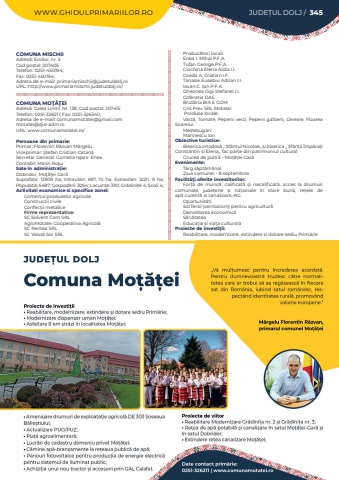 WWW.GHIDULPRIMARIILOR.RO JUDE%u021aUL DOLJ / 345COMUNA MISCHIIAdres%u0103: Eroilor, nr. 5Cod po%u0219tal: 207405Telefon: 0251-450194;Fax: 0251-450194; Adresa de e-mail: primariamischii@judetuldolj.roURL: http://www.primariamischii.judetuldolj.ro/COMUNA MO%u0162%u0102%u0162EIAdres%u0103: Calea Unirii, Nr. 138; Cod po%u0219tal: 207415Telefon: 0251-326211; Fax: 0251-326340; Adresa de e-mail: comunamotatei@gmail.commotatei@dj.e-adm.roURL: www.comunamotatei.ro/Persoane din primarie:Primar: Florentin R%u0103zvan M%u0103rgeluViceprimar: %u015etefan Cristian Catan%u0103Secretar General: Cornelia Ispas- EneaContabil: Marin Ro%u015fuSate %u00een administra%u021bie:Dobridor, Mo%u0163%u0103%u0163ei Gar%u0103Suprafa%u021ba:%u00a0 12909 ha; Intravilan:%u00a0 697, 10 ha; Extravilan:%u00a0 12211, 9 ha; Popula%u021bia:%u00a06487; Gospod%u0103rii:%u00a03064; Locuin%u021be:%u00a03101; Gr%u0103dini%u021be:%u00a04; %u0218coli:%u00a04; Activitati economice si specifice zonei:Comer%u021bul produselor agricoleConstruc%u021bii civileConfec%u021bii metaliceFirme reprezentative:SC Solvent Com SRLAgroMotatei Cooperativa Agricol%u0103SC Rentea SRLSC Wood Sor SRL Produc%u0103tori locali:Enea I. Mihai P.F.A.Tufan George P.F.A.Ciochina Elena Alida I.I.Coada A. Cristian I.F.Tanasie Eusebiu Adrian I.I.Iovan C. Ion P.F.A.Gheonea Gigi Stefanel I.I.Coferatia DAEBrut%u0103ria BIA E COMCris Prev SRL Motatei%u00a0Produse locale:Varz%u0103, Tomate, Pepeni verzi, Pepeni galbeni, Cereale, Floarea SoareluiMe%u0219te%u0219ugari: Marinescu IonObiective turistice:Biserica ortodox%u0103 ,, Sf%u00e2ntul Nicolae,, %u0219i biserica ,, Sf%u00e2n%u021bii %u00cemp%u0103ra%u021bi Constantin %u0219i Elena,, fac parte din patrimoniul cultural Crucea de piatr%u0103 - Mo%u021b%u0103%u021bei Gar%u0103Evenimente:T%u00e2rg s%u0103pt%u0103m%u00e2nalZiua comunei - 8 septembrieFacilit%u00e3%u0163i oferite investitorilor:For%u021b%u0103%u00a0 de munc%u0103, calificat%u0103%u00a0 %u0219i necalificat%u0103, acces la drumuri comunale, jude%u021bene %u0219i na%u021bionale %u00een stare bun%u0103, re%u021bele de ap%u0103%u00a0curent%u0103%u00a0%u0219i canalizare, etc.Oportunit%u0103%u021biSol fertil (cernoziom) pentru agricultur%u0103Dezvoltarea economic%u0103S%u0103n%u0103tateaEduca%u021bia %u0219i via%u021ba cultural%u0103Proiecte de investi%u0163ii:Reabilitare, modernizare, extindere %u0219i dotare sediu Prim%u0103rie