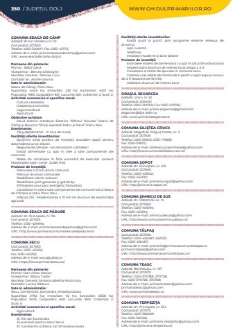350 / JUDE%u021aUL DOLJ WWW.GHIDULPRIMARIILOR.ROCOMUNA SEACA DE C%u00c2MPAdres%u0103: str.Ion Florescu nr.112Cod po%u0219tal: 207520Telefon: 0251-320017; Fax: 0351-431113; Adresa de e-mail: primariaseacadecamp@yahoo.comURL: www.seacadecamp-dolj.roPersoane din primarie:Primar : B%u0103loi Iulic%u0103Viceprimar : Bercea GheorgheSecretar General : Pencea LiviuContabil :ec. Andrei DorinaSate %u00een administra%u021bie:Seaca de C%u00e2mp, Piscu NouSuprafa%u021ba:%u00a0 4434 ha; Intravilan:%u00a0 233 ha; Extravilan:%u00a0 4201 ha; Popula%u021bia:%u00a01965; Gospod%u0103rii:%u00a0821; Locuin%u021be:%u00a0821; Gr%u0103dini%u021be:%u00a02; %u0218coli:%u00a02; Activitati economice si specifice zonei:Cultura cerealelorCre%u015fterea animalelorLegumicultur%u0103Apicultur%u0103Obiective turistice:Dou%u0103 biserici ortodoxe: Biserica %u201cSf%u00e2ntul%u00a0 Niculae%u201d Seaca de C%u00e2mp %u015fi Biserica %u201cSfin%u0163ii Apostoli Petru %u015fi Pavel%u201d Piscu NouEvenimente:T%u00e2rg s%u0103pt%u0103m%u00e2nal - %u00een ziua de mar%u0163iFacilit%u00e3%u0163i oferite investitorilor:Sprijinim orice proiect de investi%u0163ii Acord%u0103m spa%u0163ii pentru deschiderea unor afaceriRegiune de c%u00e2mpie - sol cernoziom calitatea I Exist%u0103 alimentare cu ap%u0103 %u00een cele 2 sate componente ale comuneiRe%u021bea de canalizare %u00een faza avansat%u0103%u00a0 de execu%u021bie -proiect Masterplan Ap%u0103+ canal- Jude%u021b%u00a0DoljProiecte de investi%u0163ii:Pietruirea a 21 km drum comunalPietruiri drumuri comunaleReabilitare c%u0103min culturalReabilitare %u015fcoli generale %u015fi gr%u0103dini%u0163e%u00cenfiin%u0163area unui parc energetic fotovoltaicCanalizare %u00een cele 2 sate componente ale comunei satul Seaca de C%u00e2mpie %u0219i satul Piscu NouM%u0103sura 125 - Modernizarea a 10 km de drumuri de exploata%u0163ie agricol%u0103COMUNA SEACA DE P%u0102DUREAdres%u0103: str. Principala, nr 176Cod po%u0219tal: 207525Telefon: 0351-429945; Adresa de e-mail: primariaseacadepadure@gmail.comURL: http://www.primariacomuneiseacadepadure.ro/COMUNA SECUCod po%u0219tal: 207530Telefon: 0351-431252; Fax: 0351-431252; Adresa de e-mail: secu@cjdolj.roURL: https://www.primariasecu.ro/Persoane din primarie:Primar: Dan Victor MarianViceprimar: Alboiu TudorSecretar General: Simona Adelina MocircioiuContabil: Lucica R%u0103ducaSate %u00een administra%u021bie:Secu, Com%u0103nicea, %u015eumandra, SmadovicioaraSuprafa%u021ba:%u00a0 2750 ha; Intravilan:%u00a0 92 ha; Extravilan:%u00a0 2658 ha; Popula%u021bia:%u00a0 1400; Gospod%u0103rii:%u00a0 650; Locuin%u021be:%u00a0 800; Gr%u0103dini%u021be:%u00a0 3; %u0218coli:%u00a04; Activitati economice si specifice zonei:Agricultur%u0103Evenimente:Sf. Ilie, sat %u015eumandraZiua eroilor pentru satul SeculSf. Constantin %u015fi Elena, sat SmandovicioaraFacilit%u00e3%u0163i oferite investitorilor:Exist%u0103 pus%u0103 la punct prin programe externe re%u0163eaua de drumruiAp%u0103 curent%u0103TelefonieInstala%u0163ii moderne %u015fi bine dotateProiecte de investi%u0163ii:Extindere sistem de alimentara cu ap%u0103%u00a0%u00een satul SmadovicioaraModernizare drumuri de interes local, etapa a 2-aCanalizare %u0219i sta%u021bie de epurare %u00een comuna SecuCrearea unei re%u021bele de Centre de zi pentru copiii expu%u0219i riscului de a fi separate de familie Asfaltare drumuri de interes localORA%u0218UL SEGARCEAAdres%u0103: Unirii, nr. 52Cod po%u0219tal: 205400Telefon: 0251-210750; Fax: 0251-210795; Adresa de e-mail: prima.segarcea@gmail.comsegarcea@dj.e-adm.roURL: www.primariasegarcea.roCOMUNA SILI%u015eTEA CRUCIIAdres%u0103: Magistrat Dr%u0103gu%u0163 Costel, nr. 2Cod po%u0219tal: 207535Telefon: 0251-319212, 0351-179239; Fax: 0251-319212; Adresa de e-mail: silisteacruciiprimarie@yahoo.com URL: http://www.comunasilisteacrucii.ro/COMUNA SOPOTAdres%u0103: str. Principala ,nr 419Cod po%u0219tal: 207540Telefon: 0251-453102; Fax: 0251-453102; Adresa de e-mail: primaria.sopot@yahoo.comURL: http://primaria-sopot.ro/COMUNA %u015eIMNICU DE SUSAdres%u0103: str. CRAIOVEI nr. 10Cod po%u0219tal: 207550Telefon: 0251-451094; Fax: 0251-451094; Adresa de e-mail: simnicudesus@yahoo.comURL: http://www.comunasimnicudesus.ro/COMUNA T%u0102LPA%u015eCod po%u0219tal: 207266Telefon: 0251-452487, 452253; Fax: 0251-452487; Adresa de e-mail: primarie@primariacomuneitalpas.roprimaria.talpas@yahoo.comURL: http://www.primariacomuneitalpas.ro/COMUNA TEASCAdres%u0103: Bechetului, nr. 197Cod po%u0219tal: 207570Telefon: 0251-370788, 370728; Fax: 0251-370728, 370788; Adresa de e-mail: primaria.teasc@yahoo.comprimariateasc@yahoo.comURL: www.primariateasc.roCOMUNA TERPEZI%u0162AAdres%u0103: str. Principala ,nr 334Cod po%u0219tal: 207575Telefon: 0251-362009; Fax: 0251-362168; Adresa de e-mail: primaria_terpezita@yahoo.comURL: http://primaria-terpezita.ro/