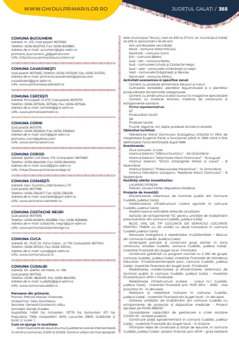 WWW.GHIDULPRIMARIILOR.RO JUDE%u021aUL GALA%u021aI / 355COMUNA BUCIUMENIAdres%u0103: nr. 213; Cod po%u0219tal: 807060Telefon: 0236-822703; Fax: 0236-822885; Adresa de e-mail: uciumeni@gl.e-adm.roprimaria_buciumeni_gl@yahoo.comURL: http://www.primariabuciumeni.ro/COMUNA CAVADINE%u015eTICod po%u0219tal: 807065; Telefon: 0236-347509; Fax: 0236-347515; Adresa de e-mail: primaria.cavadinesti@yahoo.comcavadinesti@gl.e-adm.roURL: www.primariacavadinesti.roCOMUNA CER%u0162E%u015eTIAdres%u0103: Principala nr.272; Cod po%u0219tal: 807070Telefon: 0236-337505, 337536; Fax: 0236-337536; Adresa de e-mail: certesti@gl.e-adm.roURL: www.primariacertesti.roCOMUNA CORNICod po%u0219tal: 807075Telefon: 0236-330820; Fax: 0236-330820; Adresa de e-mail: corni@gl.e-adm.roprimaria_corni@yahoo.comURL: www.comunacorni.roCOMUNA CORODAdres%u0103: %u015etefan Cel Mare, FN; Cod po%u0219tal: 807080Telefon: 0236-864006; Fax: 0236-864002; Adresa de e-mail: corod@gl.e-adm.roURL: https://www.primariacorodgl.ro/COMUNA COSME%u015eTIAdres%u0103: Gen. Dumitru D%u0103m%u0103ceanu 73Cod po%u0219tal: 807085Telefon: 0236-336227; Fax: 0236-336218; Adresa de e-mail: cosmesti@gl.e-adm.roURL: www.primaria-cosmesti.roCOMUNA COSTACHE NEGRICod po%u0219tal: 807095Telefon: 0236-825810, 825886; Fax: 0236-825886; Adresa de e-mail: costache_negri@gl.e-adm.roURL: www.primariacostachenegri.roCOMUNA CUCAAdres%u0103: str. Prof. Dr. Dinu Cezar , nr 119; Cod po%u0219tal: 807100Telefon: 0236-331124; Fax: 0236-331124; Adresa de e-mail: cuca@gl.e-adm.ro URL: www.comunacuca.roCOMUNA CUDALBIAdres%u0103: Str. %u0218tefan cel Mare, nr. 196Cod po%u0219tal: 807105Telefon: 0236- 862003; Fax: 0236-862055; Adresa de e-mail: cudalbi@gl.e-adm.roURL: www.comunacudalbi.roPersoane din primarie:Primar: Petric%u0103 Marian GheoneaViceprimar: Gelu MunteanuSecretar General:Constantin Albu%u00a0Contabil: Sanda Gradea%u00a0Suprafa%u021ba:%u00a0 14361 ha; Intravilan:%u00a0 13770 ha; Extravilan:%u00a0 571 ha; Popula%u021bia:%u00a0 7365; Gospod%u0103rii:%u00a0 4100; Locuin%u021be:%u00a0 2800; Gr%u0103dini%u021be:%u00a0 2; %u0218coli:%u00a02; Licee:%u00a01; Cum se ajunge in localitate:Este traversat%u0103 de dou%u0103 drumuri jude%u021bene care se intersecteaz%u0103 %u00een centrul comunei, DJ251 %u0219i DJ253. Centrul urban cel mai apropiat este municipiul Tecuci, care se afl%u0103 la 27 km, iar municipiul Gala%u021bi se afl%u0103 la aproximativ 55 de km.Are urm%u0103toarele vecin%u0103t%u0103%u0163i:Nord - comuna Valea M%u0103ruluiNord-est - comuna CorniEst %u2013 comuna B%u0103leniSud %u2013 est - comuna RediuSud - comunele Grivi%u0163a %u015fi Costache NegriSud %u2013 vest - comunele Umbr%u0103re%u015fti %u015fi Ive%u015ftiVest - comunele Dr%u0103g%u0103ne%u015fti %u015fi Barcea Nord vest - comuna MatcaActivitati economice si specifice zonei:Comer%u021b cu produse alimentare, b%u0103uturi %u0219i tutunCultivarea cerealelor, plantelor leguminoase %u0219i a plantelor produc%u0103toare de semint%u021be oleaginoaseComer%u021b cu am%u0103nuntul al altor bunuri %u00een magazine specializateComer%u021b cu material lemnos, material de construc%u021bii %u0219i echipamente sanitare Firme reprezentative:57Produc%u0103tori locali:28Produse locale:Fructe, legume, vin, lapte, produse lactate %u0219i cerealeObiective turistice:M%u0103n%u0103stirea Maicii Domnului (Gologanu) ctitorit%u0103 %u00een 1934 de mo%u015fiereasa Eugenia Pan%u0103, a func%u0163ionat p%u00e2n%u0103 %u00een 1959 c%u00e2nd a fost desfiin%u0163at%u0103, fiind re%u00eenfiin%u0163at%u0103 dup%u0103 1989Evenimente:Ziua comunei -2 Iulie%u00a0Hramul bisericii %u201cSf%u00e2ntul Dumitru%u201d - 26 OctombrieHramul bisericii %u201cAdormirea Maicii Domnului%u201d%u00a0- 15 AugustHramul bisericii %u201cSfin%u021bii Arhangheli Mihail %u0219i Gavril%u201d - 8 NoiembrieHramul bisericii %u201cPreacuvioasa Paraschiva%u201d - 14 OctombrieHramul M%u0103n%u0103stirii Gologanu %u201cNa%u0219terea Maicii Domnului%u201d - 8 SeptembrieFacilit%u00e3%u0163i oferite investitorilor:Localit%u0103%u021bi %u00eenfr%u0103%u021bite: Pelivan, %u021binutul Orhei, Republica MoldovaProiecte de investi%u0163ii:Eficientizarea sistemului de iluminat public din Comuna Cudalbi, jude%u0163ul Gala%u0163iModernizarea infrastructurii rutiere agricole %u00een comuna Cudalbi, judetul Gala%u0163iModernizare %u0219i extindere re%u021bea de canalizareAchizi%u0163ii de echipamente TIC pentru unit%u0103%u0163ile de %u00eenv%u0103%u0163%u0103m%u00e2nt preuniversitar din comuna Cudalbi, jude%u0163ul Gala%u0163iBLOC ANL DE TIP LOCUIN%u021aE DE SERVICIU/ LOCUIN%u021aE PENTRU TINERI cu 20 unit%u0103%u021bi cu dou%u0103 tronsoane %u00een comuna Cudalbi jude%u021bul Gala%u021biRenovare energetic%u0103%u00a0 a re%u0219edin%u021belor multifamiliale %u2013 Blocuri din Comuna Cudalbi, Jude%u021bul Gala%u021biAmenajare parcare %u0219i construire grup sanitar %u00een zona cimitirului ortodox Cudalbi, comuna Cudalbi, jude%u021bul%u00a0 Gala%u0163iinvestitie finan%u021bat%u0103%u00a0din buget local %u2013Finalizat%u0103Construire gr%u0103dini%u0163%u0103 cu program normal cu 2 S%u0103li de grup%u0103, comuna Cudalbi, jude%u0163ul Gala%u0163i investitie finan%u021bat%u0103%u00a0de Ministerul Educatiei %u2013FinalizataAmenajare parc, comuna Cudalbi, judetul Gala%u0163i- investitie finantata din buget local %u2013Finalizat%u0103Reabilitarea, modernizarea %u015fi eficientizarea sistemului de iluminat public %u00een comuna Cudalbi, jude%u0163ul Gala%u0163i - investi%u021bie finan%u021bat%u0103%u00a0prin AFM 1%u2013Finalizat%u0103Reabilitarea infrastructurii %u0219colare - Liceul nr.1 Cudalbi, jude%u021bul%u00a0 Gala%u0163i - investi%u021bie finan%u021bat%u0103%u00a0 prin POR 2014 %u2013 2020 - Axa prioritata 10 %u2013 %u00een derulareRealizare %u015fi reabilitare trotuare %u00een comuna Cudalbi, jude%u021bul%u00a0Gala%u0163i - investi%u021bie finan%u021bat%u0103%u00a0din buget local %u2013 %u00een derulareDotarea unit%u0103%u0163ilor de %u00eenv%u0103%u0163%u0103m%u00e2nt din comuna Cuda