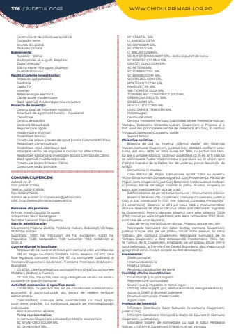 376 / JUDE%u021aUL GORJ WWW.GHIDULPRIMARIILOR.ROCentrul local de informare turistic%u0103Troi%u0163a din lemnCrucea din piatr%u0103P%u0103durea CrihalaEvenimente:Rusaliile - C%u00e2lnicProbojeniile - 6 august, PieptaniZiua minerului%u201dSf%u00e2nta Marie -15 august, Didile%u015ftiZiua V%u00e2rstniculuiFacilit%u00e3%u0163i oferite investitorilor:Re%u0163ea de ap%u0103 potabil%u0103TelefonieCablu TVInternetRe%u0163ea energie electric%u0103C%u0103i de acces modernizateBaz%u0103 sportiv%u0103 modern%u0103 pentru recrutareProiecte de investi%u0163ii:Centru local de informare turistic%u0103Structur%u0103 de agrement turistic - AqualandCanalizareCentru de b%u0103tr%u00e2niCentral%u0103 fotovoltaic%u0103Regularizare rigoleModernizare drumuriReabilitare bisericiConstruire anexe %u015fi teren de sport %u015ecoala Gimnazial%u0103%u00a0C%u00e2lnicReabilitare c%u0103min culturalReabilitare re%u0163ea distribu%u0163ie ap%u0103%u00cenfiin%u0163are centru de %u00eengrijirea a copiilor tip after schoolReabilitare sarpant%u0103 %u015fi %u00eenvelitoare %u015ecoala Gimnaziala C%u00e2lnicBaz%u0103 sportiv%u0103 multifunc%u0163ional%u0103Construire biseric%u0103 centru C%u00e2lnicConstruire sediu prim%u0103rieCOMUNA CIUPERCENIAdres%u0103: nr. 21Cod po%u0219tal: 217155Telefon: 0253-276526; Fax: 0253-276106; Adresa de e-mail: pcciuperceni@yahoo.comURL: http://www.primariaciuperceni.roPersoane din primarie:Primar: Matei-Claudiu Dragot%u0103Viceprimar: Sorin BasangeacSecretar General: Diana PopescuSate %u00een administra%u021bie:Ciuperceni, Priporu, Zorzila, Pe%u015fteana Vulcan, Boboie%u015fti, V%u00e2rtopu, Str%u00e2mba VulcanSuprafa%u021ba:%u00a0 7007 ha; Intravilan:%u00a0 24 ha; Extravilan:%u00a0 6300 ha; Popula%u021bia:%u00a0 1438; Gospod%u0103rii:%u00a0 1103; Locuin%u021be:%u00a0 1103; Gr%u0103dini%u021be:%u00a0 2; %u0218coli:%u00a02; Cum se ajunge in localitate:Re%u021beaua de c%u0103i rutiere ce trece prin comun%u0103 este urm%u0103toarea:DN 67 T%u00e2rgu-Jiu-Motru Drobeta Turnu Severin. DJ 672, care face leg%u0103tura comunei %u00eentre DN 67 cu comunele Godine%u0219ti %u0219i Tismana:Ciuperceni-Godinesti-Tismana-Pe%u0219ti%u0219ani-Br%u0103diceniBuduhalaDJ 673A, care face leg%u0103tura comunei %u00eentre DN 67 cu comunele M%u0103t%u0103sari, Bolbo%u0219i %u0219i TurceniDC 103, 104, 105 %u0219i 106, care asigur%u0103 leg%u0103tura satului de centru cu satele ce apar%u021bin comuneiActivitati economice si specifice zonei:Localitatea Ciuperceni are rol de coordonare administrativeconomic %u015fi socio-cultural%u0103, din punct de vedere teritorial administrativ.Concomitent, comuna este caracterizat%u0103 ca fiind spa%u0163iu rural dens populat, cu agricultur%u0103 bazat%u0103 pe microexploata%u0163ii individuale.Parc Fotovoltaic 45 MW Firme reprezentative:%u00cen comuna Ciuperceni activeaz%u0103 entit%u0103%u021bile economice:SC STENFORD SOLAR SRLSC CHAMONIX SRLSC CAMITAL SRLI.I. ANESCU GETASC SOPCORN SRLSC IONISILV SRLI.I. BALAN GABRIELSC SUPERTRANS COM SRL- sediu %u0219i punct de lucruSC BORTEC GIGANU SRLGRATZY CLAU COM SRLSC PETERS SRLSC TOMBACDEL SRLSC BANIBOCOM SRLSC CRILBEL COM SRLMOLTISANTI COM SRLPAVELVET 89 SRLSIB FIORISTA ELLA SRLTOWINPLAST CONSTRUCT 2017 SRLGREASOVA DELUTU SRLERIBELCOM SRL SEYCEL UTILCONS SRLLIVIU CARS & TRAILERS SRLMe%u0219te%u0219ugari:Centru de ol%u0103ritCentrul Pesteana-Vartopu cuprindea satele Pesteana-Vulcan, Vartopu, Boboiesti, Stramba-Vulcan, Ciuperceni si Priporu %u0219i a fost unul din principalele centre de ceramic%u0103 din Gorj, %u00een centrul V%u00eertopu(Ciuperceni)Carpeanu Vasile Suport tehnicObiective turistice:Biserica de zid cu hramul %u201eSf%u00e2ntul Vasile%u201d din Stramba Vulcan, comuna Ciuperceni, jude%u021bul Gorj dateaz%u0103 conform unor surse, din anul 1809, iar altor surse din 1819, cu picturi din 1824. Ea are o valoare istoric%u0103, localnicii povestind c%u0103 %u00een ea ar fi tras s%u0103 se odihneasc%u0103 Tudor Vladimirescu %u0219i pandurii lui, %u00een drum spre C%u00e2mpia Soarelui de la Pade%u0219, loc de unde au pornit Revolu%u021bia de la 1821.Denumirea %u00een muzeu:Casa P%u00e2r%u00e2ul de Pripor Denumirea local%u0103:%u00a0 Casa lui Anescu Victor Etnia:%u00a0rom%u00e2ni Zona etnografic%u0103:%u00a0Gorj Provenien%u0163a:%u00a0P%u00e2r%u00e2ul de Pripor, com. Ciuperceni, jud. Gorj Descriere: Cas%u0103 cu dou%u0103 %u00eenc%u0103peri %u015fi pridvor; b%u00e2rne de stejar cioplite %u00een patru muchii; acoperi%u015f %u00een patru ape %u00eenvelitoare din %u015fi%u0163%u0103 de brad.Edificii istorice de pe teritoriul comunei - Monumente istoriceBiserica de lemn din Ciuperceni, comuna%u00a0Ciuperceni,%u00a0jude%u021bul Gorj, a fost construit%u0103 %u00een%u00a01701. Are hramul %u201eCuvioasa Paraschiva%u201d (14 octombrie). Biserica se afl%u0103 pe noua list%u0103 a monumentelor istorice. Biserica se afl%u0103 %u00een c%u0103tunul V%u0103ian (sat%u00a0desfiin%u021bat, %u00eenglobat la%u00a0 Ciuperceni). Pentru datarea bisericii cert este v%u0103leatul 7209 (1701) trecut pe u%u0219ile %u00eemp%u0103r%u0103te%u0219ti; alte date vehiculate:%u00a01737,%u00a01848, sunt cele ale unor repara%u021bii.Casa de lemn Maria Stoican din sat Priporu, datare sec, XIX Necropola tumular%u0103 din satul V%u00e2rtop, comuna Ciuperceni jude%u021bul Gorj:se afl%u0103 pe un platou situat %u00eentre dealuri, %u00een satul V%u00e2rtopu din comuna Ciuperceni. Necropola tumular%u0103 de la V%u00e2rtopu-Ciuperceni a fost descoperit%u0103 %u00eenoctombrie 1964. Cei 14 Tumuli de la Ciuperceni, amplasa%u0163i pe un platou situat %u00eentr-o zon%u0103 deluroas%u0103, la 3 km N-E de Dealul Bujor%u0103scu, dau importan%u0163%u0103 geografic%u0103 zonei %u00een care ace%u015ftia au fost descoperi%u0163i.Evenimente:Zilele comuneiHramuri bisericii laHramul satului Festivalul s%u0103rb%u0103torilor de iarn%u0103Facilit%u00e3%u0163i oferite investitorilor:Consultan%u0163%u0103 %u015fi suport logisticReprezentare comunitateScutiri taxe %u015fi impozite %u00een temei legalUtil