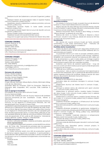 WWW.GHIDULPRIMARIILOR.RO JUDE%u021aUL GORJ / 377Realizare lucr%u0103ri de Cadastrare a comunei Ciuperceni, jude%u021bul Gorj Realizare Sistem de Supraveghere Video %u00een Spa%u021biile Publice, comuna Ciuperceni, jude%u021bul Gorj.TICReabilitare, dotare %u0219i digitalizare a sediului prim%u0103riei, comuna Ciuperceni, jude%u021bul GorjModernizare Iluminat Public %u00een toate satele comunei Ciuperceni, jude%u021bul GorjAmenajare %u0219i dotare Spa%u021bii Verzi %u0219i Locuri de Joac%u0103%u00een comuna Ciuperceni, jude%u021bul GorjDotare mobiler %u0218coala Gimnazial%u0103%u00a0CiuperceniReabiltare %u0218coala Gimnazial%u0103%u00a0Str%u00e2mba VulcanAsigurare scurgere ape %u0219an%u021buri Pereate DC 106,DC 105 %u0219i%u00a0DS2COMUNA CRASNAAdres%u0103: C%u0103rpini%u015f, nr. 79Cod po%u0219tal: 217169Telefon: 0253-474101; Fax: 0253-474101; Adresa de e-mail: primariacrasna@yahoo.comURL: http://www.crasnagorj.ro/COMUNA CRU%u015eE%u0162Adres%u0103: Principala, nr. 35Cod po%u0219tal: 217175Telefon: 0253-283067; Fax: 0253-283075; Adresa de e-mail: primaria_cruset@yahoo.comcruset@gj.e-adm.roURL: https://www.comunacruset.roPersoane din primarie:Primar: Teodor GodeanuViceprimar:%u00a0Adrian Popa%u00a0Secretar General: Bogdan Nicola%u00a0Contabil: ec. Ioana St%u0103varuSate %u00een administra%u021bie:Cru%u015fet, Sl%u0103vu%u0163a,%u00a0Marine%u015fti,%u00a0V%u0103lu%u0163a, Bojinu,%u00a0Mierea, Sl%u0103mne%u015fti,%u00a0M%u0103iag, Urda de Jos,%u00a0MiericeanaSuprafa%u021ba:%u00a0 8622 ha; Intravilan:%u00a0 721,91 ha; Extravilan:%u00a0 7900,39 ha; Popula%u021bia:%u00a0 2961; Gospod%u0103rii:%u00a0 1917; Locuin%u021be:%u00a0 1708; Gr%u0103dini%u021be:%u00a0 3; %u0218coli:%u00a03;Cum se ajunge in localitate:Principalele c%u0103i de acces c%u0103tre comuna Cru%u0219e%u021b:Drumul Na%u021bional DN6BComuna este str%u0103b%u0103tut%u0103 at%u00e2t de Drumul Na%u021bional 6B (str%u0103bate Comuna transversal, pe raza localit%u0103%u021bilor Cru%u0219e%u021b, Mierea %u0219i Sl%u0103mne%u0219ti).Drumul Comunal 51 (face legatura %u00eentre cu localitatea Tant%u0103reni,)Comuna nu are legatur%u0103 la infrastructura feroviar%u0103, cea mai apropiat%u0103 gar%u0103 fiind situat%u0103 %u00een Ora%u0219ul Filia%u0219i.Localitatea Cru%u0219e%u021b este situat%u0103 de-a lungul drumului na%u021bional DN 6B, afl%u00e2ndu-se la o distan%u0163%u0103 de 75 km fa%u0163%u0103 de re%u015fedin%u0163a de jude%u0163 T%u00e2rguJiu %u0219i la 35 km fa%u0163%u0103 de Municipiul Craiova din jude%u021bul Dolj. Comuna nu are legatur%u0103 la infrastructur%u0103 feroviar%u0103, cea mai apropiat%u0103 gar%u0103 fiind situat%u0103 la aproximativ 25 km, %u00een ora%u0219ul Filia%u0219i, jude%u021b Dolj, iar cea mai apropiat%u0103 distan%u021b%u0103 de c%u0103ile de comunicare aeriene fiind relativ mic%u0103, de aproximativ 47 Km unde se afl%u0103 Aeroportul Intena%u021bional Craiova, destinat curselor interne %u0219i interna%u021bionale.Activitati economice si specifice zonei:Comer%u021b, cultivarea cerealelor, cre%u0219terea animalelor, apicultur%u0103Firme reprezentative:%u00cen%u00a0 Cru%u0219e%u021b%u00a0 sunt%u00a0 %u00eenregistrate%u00a0 %u00een%u00a0 prezent%u00a0 un%u00a0 total%u00a0 de%u00a0 95%u00a0 firme,%u00a0 dintre%u00a0 care%u00a0 30%u00a0 firme%u00a0 SRL.%u00a0 Domeniile%u00a0de%u00a0activitate%u00a0cele%u00a0mai%u00a0populare sunt comer%u021bul cu am%u0103nuntul, agricultura %u0219i servicii turisticeProduc%u0103tori locali:La%u00a0 nivelul%u00a0 comunei%u00a0 exist%u0103%u00a0 circa%u00a0 200%u00a0 de%u00a0 produc%u0103tori%u00a0 agricoli %u00een domeniul aapicol, legumicol %u0219i zootehnic. O particularitate a produc%u0103torilor este diversificarea activit%u0103%u021bii %u00een sensul includerii de noi domenii cum ar fi cre%u0219terea florilor/plantelor ornamentale sau turismului.Produse locale:CerealeLegumeFlori (lavand%u0103)F%u0203nMiere Lapte %u0219i produse lactateObiective turistice:Ca vizitator %u00een Comuna Cru%u0219e%u021b, ne putem bucura de obiective turistice cu mare %u00eensemn%u0103tate istoric%u0103 %u0219i cultural%u0103:Stejarul secular din satul Sl%u0103vu%u0163a monumente istorice, situate %u00een centrul satelor Cru%u0219e%u021b %u0219i Maiag, ridicate %u00een cinstirea eroilor c%u0103zu%u0163i %u00een primul %u015fi cel de-al doilea r%u0103zboi MondialBiserica monument istoric situat%u0103 %u00een satul M%u0103iag, cu hramul %u201dSf%u00e2ntul Nicolae%u201d ce dateaz%u0103 din anul 1818 Biserica din lemn cu hramul %u201dIntrarea %u00een Biseric%u0103 a Maicii Domnului%u201d, situate %u00een satul Sl%u0103vu%u0163a, datat%u0103 din secolul al XVII-lea cu statut de monument istoricEvenimente:Din dorin%u021ba de a pune comuna Cru%u0219e%u021b pe harta cultural%u0103 rom%u00e2neasc%u0103, a luat fiin%u021b%u0103 evenimentul local - Festivalul de Literatura %u201cREMEMBER MONICA LOVINESCU%u201dFacilit%u00e3%u0163i oferite investitorilor:Mediul de afaceri este sus%u021binut prin asigurarea infrastructurii necesare (utilit%u0103%u021bi publice, c%u0103i de comunica%u021bie asfaltate) dar %u0219i o administra%u021bie pro investitii.Ca parametrii tehnici %u015fi %u00een ceea ce prive%u015fte utilit%u0103%u0163ile publice, comuna Cruse%u021b se bucur%u0103 de acoperire GSM Orange, Vodafone, RCS&RDS, are conexiune internet, are televiziune prin cablu, are re%u0163ea de alimentare cu ap%u0103 %u00een toate satele, pe %u00eentreaga lungime a localit%u0103%u021bii (52 Km), re%u0163ea de canalizare %u00een 4 sate componente, electricitatea acoper%u0103 100% din suprafa%u0163a locuibil%u0103.Existen%u021ba unor forme de asociere public-privat %u2013 Grup de Actiune Local%u0103%u00a0care ofer%u0103%u00a0mediului privat oportunit%u0103%u021bi de aplicarea la programe de finan%u021bareM%u00e2n%u0103 de lucru calificat%u0103 %u0219i necalificat%u0103 Ecoturismul %u2013 este un sector al turismului %u00eenc%u0103 nepromovat %u0219i %u00een consecin%u021b%u0103 neexploatat, dar cu poten%u021bial de dezvolta