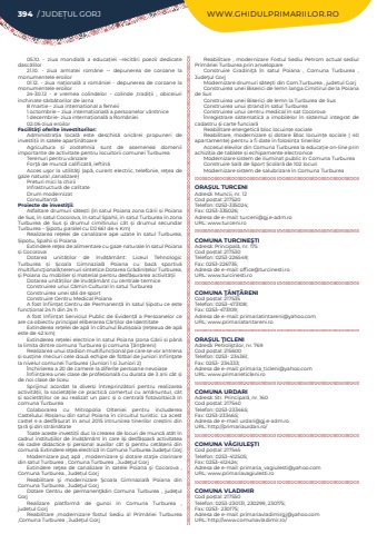 394 / JUDE%u021aUL GORJ WWW.GHIDULPRIMARIILOR.RO05.10. - ziua mondial%u0103%u00a0 a educa%u021biei %u2013recit%u0103ri poezii dedicate dasc%u0103lilor21.10. - ziua armatei rom%u0103ne -- depunerea de coroane la monumentele eroilor01.12. - ziua na%u021bional%u0103 a rom%u0103niei - depunerea de coroane la monumentele eroilor24-30.12 - e vremea colindelor - colinde ,tradi%u021bii , obiceiuri %u00eenchinate s%u0103rb%u0103torilor de iarna8 martie %u2013 ziua international a femeii1 octombrie %u2013 ziua interna%u021bional%u0103%u00a0a persoanelor v%u00e2rstnice1 decembrie- ziua interna%u021bional%u0103 a Rom%u00e2niei 02.06-ziua eroilorFacilit%u00e3%u0163i oferite investitorilor:Administra%u021bia local%u0103 este deschis%u0103 oric%u0103rei propuneri de investi%u021bii %u00een satele apar%u021bin%u0103toareAgricultura %u0219i zootehnia sunt de asemenea domenii importante de activitate pentru locuitorii comunei TurbureaTerenuri pentru v%u00e2nzareFor%u0163%u0103 de munc%u0103 calificat%u0103, ieftin%u0103 Acces u%u015for la utilit%u0103%u0163i (ap%u0103, curent electric, telefonie, re%u0163ea de gaze natural ,canalizare)Preturi mici la chiriiInfrastructur%u0103%u00a0de calitateDrum modernizat Consultan%u021b%u0103Proiecte de investi%u0163ii:Asfaltare drumuri s%u0103te%u0219ti (%u00een satul Poiana zona G%u0103rii %u0219i Poiana de Sus, %u00een satul Cocorova, %u00een satul Spahii, %u00een satul Turburea %u00een zona Turburea de Sus %u015fi drumul cimitirului c%u00e2t %u0219i drumul secundar Turburea %u2013 %u015eipotu paralel cu DJ 661 de 4 Km)Realizarea re%u021belei de canalizare ape uzate %u00een satul Turburea, %u0218ipotu, Spahii %u0219i PoianaExtindere re%u0163ea de alimentare cu gaze naturale %u00een satul Poiana %u0219i CocorovaDotarea unit%u0103%u021bilor de %u00eenv%u0103%u021b%u0103m%u00e2nt: Liceul Tehnologic Turburea %u0219i %u0218coala Gimnazial%u0103 Poiana cu baz%u0103 sportiv%u0103 multifunc%u0163ional%u0103;terenuri sintetice Dotarea Gr%u0103dini%u021belor Turburea, %u0219i Poiana cu mobilier %u0219i material pentru desf%u0103%u0219urarea activit%u0103%u021biiDotarea unit%u0103%u021bilor de %u00eenv%u0103%u021b%u0103m%u00e2nt cu centrale termiceConstruirea unui C%u0103min Cultural %u00een satul TurbureaConstruirea unei s%u0103li de sportConstruire Centru Medical PoianaA fost %u00eenfiin%u021bat Centru de Permanen%u021b%u0103 %u00een satul %u0218ipotu ce este func%u021bional 24 h din 24 hA fost %u00eenfiin%u021bat Serviciul Public de Eviden%u021b%u0103 a Persoanelor ce are ca obiectiv principal eliberarea C%u0103r%u021bilor de IdentitateExtinderea re%u021belei de ap%u0103 %u00een c%u0103tunul Buti%u0219oaia (re%u021beaua de ap%u0103 este de 42 km)Extinderea re%u021belei electrice %u00een satul Poiana (zona G%u0103rii %u0219i p%u00e2n%u0103 la limita dintre comuna Turburea %u015fi comuna %u0162%u00e2n%u0163%u0103reni)Realizarea unui stadion multifunc%u021bional pe care se vor antrena %u0219i sus%u021bine meciuri cele dou%u0103 echipe de fotbal de juniori %u00eenfiin%u0163ate la nivelul comunei Turburea (Juniori 1 %u0219i Juniori 2)%u00cenchirierea a 20 de camere la diferite persoane nevoia%u0219e%u00cenfiin%u021barea unei clase de profesional%u0103 cu durata de 3 ani c%u00e2t %u0219i de noi clase de liceuSprijinul acordat la diver%u0219i %u00eentreprinz%u0103tori pentru realizarea activit%u0103%u021bii, la societ%u0103%u021bile ce practic%u0103 comer%u021bul cu am%u0103nuntul, c%u00e2t %u0219i societ%u0103%u021bilor ce au realizat un parc %u0219i o central%u0103 fotovoltaic%u0103 %u00een comuna TurbureaColaborarea cu Mitropolia Olteniei pentru includerea Castelului Ro%u0219ianu din satul Poiana %u00een circuitul turistic. La acest castel s-a desf%u0103%u0219urat %u00een anul 2015 %u00eentrunirea tinerilor cre%u0219tini din %u0163ar%u0103 %u015fi din str%u0103in%u0103tateToate aceste investi%u021bii duc la crearea de locuri de munc%u0103 at%u00e2t %u00een cadrul institu%u021biilor de %u00eenv%u0103%u021b%u0103m%u00e2nt %u00een care %u00ee%u0219i desf%u0103%u0219oar%u0103 activitatea 46 cadre didactice %u0219i personal auxiliar c%u00e2t %u0219i pentru cet%u0103%u021benii din comun%u0103. Extindere re%u0163ea electric%u0103 %u00een Comuna Turburea Jude%u0163ul GorjModernizare pu%u0163 ap%u0103 , modernizare %u015fi dotare sta%u0163ie clorinare din satul Turburea , Comuna Turburea , Jude%u0163ul GorjExtindere re%u0163ea de canalizare %u00een satele Poiana %u015fi Cocorova , Comuna Turburea , Jude%u021bul%u00a0GorjReabilitare %u015fi modernizare %u015ecoala Gimnazial%u0103 Poiana din Comuna Turburea , Jude%u0163ul GorjDotare Centru de permanen%u0163%u0103din Comuna Turburea , jude%u0163ul GorjRealizare platform%u0103 de gunoi %u00een Comuna Turburea , jude%u021bul%u00a0GorjReabilitare ,modernizare fostul Sediu al Prim%u0103riei Turburea ,Comuna Turburea , Jude%u0163ul GorjReabilitare , modernizare Fostul Sediu Petrom actual sediul Prim%u0103riei Turburea prin anvelopareConstruire Gradini%u0163%u0103 %u00een satul Poiana , Comuna Turburea , Jude%u0163ul GorjModernizare drumuri s%u0103te%u015fti din Com.Turburea , judetul GorjConstruirea unei Biserici de lemn langa Cimitirul de la Poiana de SusConstruirea unei Biserici de lemn la Turburea de SusConstruirea unui %u0219trand %u00een satul TurbureaConstruirea unui centru medical %u00een sat Cocorova%u00cenregistrare sistematic%u0103 a imobilelor %u00een sistemul integrat de cadastru %u0219i carte funciar%u0103Reabilitare energetic%u0103 bloc locuin%u021be socialeReabilitare, modernizare %u0219i dotare Bloc locuin%u021be sociale ( 40 apartamente) pentru a fi date %u00een folosin%u021ba tinerilorAccesul elevilor din Comuna Turburea la educa%u021bie on-line prin achizi%u021bia de tablete %u0219i echipamente electroniceModernizare sistem de iluminat public %u00een Comuna TurbureaConstruire Sal%u0103 de Sport %u0218colar%u0103 de 102 locuriModernizare sistem de salubrizare %u00een Comuna TurbureaORA%u0218UL TURCENIAdres%u0103: Muncii, nr. 1