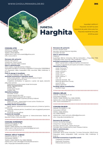 WWW.GHIDULPRIMARIILOR.RO 395Suprafa%u021b%u0103: 6.639 km%u00b2Popula%u021bie: 343.467 locuitoriRe%u0219edin%u021b%u0103 de jude%u021b: Miercurea CiucPopula%u021bia re%u0219edin%u021bei de jude%u021b: 47.073 locuitoriJUDE%u021aULHarghitaCOMUNA ATIDAdres%u0103: Principal%u0103, nr. 469Cod po%u0219tal: 537005Telefon: 0746-188757; Adresa de e-mail: comunaatid@yahoo.comURL: www.atid.roPersoane din primarie:Primar:%u00a0Pal LorincziViceprimar: Szocs LazsloSecretar General: P%u00e9ter AndreiSate %u00een administra%u021bie:Atid, Cri%u015feni, Cu%u015fmed, %u015eiclod, Inl%u0103ceniSuprafa%u021ba:%u00a0140,28 km%u00b2; Intravilan:%u00a04026305 m%u00b2; Extravilan:%u00a01092299849 m%u00b2; Popula%u021bia:%u00a0 2594; Gospod%u0103rii:%u00a0 876; Locuin%u021be:%u00a0 1358; Gr%u0103dini%u021be:%u00a0 3; %u0218coli:%u00a03; Cum se ajunge in localitate:Drumul Jude%u021bean 136A, 135, 136BActivitati economice si specifice zonei:Prelucrarea paielor - specific%u0103 zonei satului Cri%u015feniFiert %u0163uic%u0103 din prune %u015fi mereCre%u015fterea animalelor, %u00een special a vacilor de lapte, datorit%u0103 p%u0103%u015funilor extinseExploatarea %u015fi prelucrarea masei lemnoaseFirme reprezentative:Fitobau SRLProduc%u0103tori locali: Fitobau SRLObiective turistice:Muntele %u201cFirtos%u201dMuzeul satului din AtidMuzeul p%u0103l%u0103riei de paie din Cri%u015feniBisericile din satele Cu%u015fmed, %u015eiclod %u015fi Inl%u0103ceniEvenimente:Zilele comunei - organizate %u00een luna iunie a fiec%u0103rui anFestivalul de p%u0103l%u0103rii Cri%u015feniFacilit%u00e3%u0163i oferite investitorilor:Spa%u0163ii pentru obiective economice precum %u015fi terenuri pentru construc%u0163iiImpozite sc%u0103zute pentru investitorii care angajeaz%u0103 persoane din comun%u0103For%u0163%u0103 de munc%u0103 ieftin%u0103Proiecte de investi%u0163ii:Construire Sta%u021bie de Epurare %u0219i Interconectarea Sta%u021biei de Epurare Cri%u0219eni, Comuna AtidCOMUNA AVR%u0102ME%u015eTIAdres%u0103: Principal%u0103, nr. 126Cod po%u0219tal: 537010Telefon: 0266-220024; Fax: 0266-220010; Adresa de e-mail: primaria.avramesti@gmail.comURL: www.szentabraham.roORA%u0218UL B%u0102ILE TU%u015eNADAdres%u0103: str.Oltului, nr. 114Cod po%u0219tal: 535100Telefon: 0266-335017; Fax: 0266-335006; Adresa de e-mail: office@primariabailetusnad.roURL: https://primariabailetusnad.ro/Persoane din primarie:Primar: Butyka ZsoltSecretar General: Banica HajnalkaContabil: Ilie EditSate %u00een administra%u021bie:CarpitusSuprafa%u021ba:%u00a0189 ha; Intravilan:%u00a0189 ha; Extravilan:%u00a0-; Popula%u021bia:%u00a01728; Gospod%u0103rii:%u00a0602; Locuin%u021be:%u00a0376; Gr%u0103dini%u021be:%u00a01; %u0218coli:%u00a01; Activitati economice si specifice zonei:B%u0103ile Tu%u015fnad este o sta%u0163iune balneo-climateric%u0103Turismul reprezint%u0103 principala activitate a ora%u015fului Obiective turistice:Hotel %u201cFortuna%u201d***Hotel %u201cTu%u015fnad%u201d**Hotel %u201cCiuca%u015f%u201d**Hotel %u201cOlt%u201d**Hotel %u201cOnix%u201d**Hotel %u201cAstoria%u201d**Vile - 60Case de vacan%u0163%u0103 - 152Baz%u0103 de agrement Ciuca%u015fLacul Sf. AnaSt%u00e2nca %u015eoimilorFacilit%u00e3%u0163i oferite investitorilor:Conform legiiORA%u0218UL B%u0102LANAdres%u0103: 1 Decembrie, nr. 25Cod po%u0219tal: 535200Telefon: 0266-330335; Fax: 0266-330335; Adresa de e-mail: office@orasulbalan.roURL: www.orasulbalan.roCOMUNA BILBORAdres%u0103: Principal%u0103, nr. 120Cod po%u0219tal: 537020Telefon: 0266-355004; Fax: 0266-355504; Adresa de e-mail: primaria_bilbor@yahoo.comURL: https://primariabilbor.ro/Persoane din primarie:Primar: Ilie Daniel H%u00e2nganViceprimar: George ApostolSecretar General: Dan-%u00a0Adrian RuncanContabil: Stan Ionela Dorina, Stan Floarea CristinaSate %u00een administra%u021bie:Bilbor, R%u0103chiti%u015fSuprafa%u021ba:%u00a0227,31 kmp; Intravilan:%u00a07,4 kmp; Extravilan:%u00a0220,01 kmp; Popula%u021bia:%u00a0 2649; Gospod%u0103rii:%u00a0 1529; Locuin%u021be:%u00a0 950; Gr%u0103dini%u021be:%u00a0 3; %u0218coli:%u00a05; Activitati economice si specifice zonei:Cre%u015fterea animalelorExploat%u0103ri forestierePrelucrarea lemnului