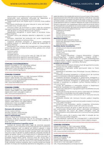 WWW.GHIDULPRIMARIILOR.RO JUDE%u021aUL HARGHITA / 399Reamenajare %u0219i extindere %u0219coala gimnazial%u0103%u00a0Kajoni JanosConstruirea unei platforme comunale de depozitare %u0219i gospod%u0103rire a gunoiului de grajd %u00een comuna CiceuModernizare drum de interes local %u00een comuna Ciceu jude%u021bul Harghita%u00cenfiin%u0163area distribu%u0163iei de gaze naturale %u00een%u00a0 zona Adi Forest %u2013 comunele Ciceu, Siculeni, Racu%u00cenfiin%u021bare sistem de alimentare cu ap%u0103 %u0219i re%u021bea de canalizare menajer%u0103, sta%u021biunea Piricske, comuna Ciceu, jude%u021bul HarghitaSal%u0103 de sport cu tribun%u0103 180 locuri,sat. CiaracioReabilitarea energetic%u0103 a noului sediu al prim%u0103riei Ciceu, jude%u0163ul Harghita%u00cenfiin%u0163are centru de colectare selectiv%u0103 a de%u015feurilor, cu aport voluntar%u00cenfiin%u0163are capacitate de produc%u0163ie din surse regenerabile pentru consum propriu %u00een comuna CiceuCre%u015fterea eficien%u0163ei energetic %u015fi gestionarea inteligent%u0103 %u00een cl%u0103dirile publice cu destina%u0163ie de unit%u0103%u0163i de %u00eenv%u0103%u0163%u0103m%u00e2nt %u00een gr%u0103dini%u0163a PillangoDezvoltarea unor sisteme de management al documentelor %u0219i fluxurilor de lucru la nivelul comuna Ciceu, ghi%u0219eu unic virtual pentru cet%u0103%u021beni (TIC)Iluminat publicC%u0103min culturalComplex sportivModernizare drum comunal DC 4915, DC 4935, DC 4961Modernizare drum agricol %u00een zona Adi ForestModernizare drum agricol %u00een zona Adi KozepcsikCOMUNA CIUCS%u00c2NGEORGIUAdres%u0103: Principal%u0103, nr. 131; Cod po%u0219tal: 537040Telefon: 0266-331603; Fax: 0266-331765; Adresa de e-mail: office@ciucsangeorgiu.roURL: www.csikszentgyorgy.euCOMUNA CIUMANIAdres%u0103: P-%u0163a. Borsos Mikl%u00f3s, nr. 208; Cod po%u0219tal: 537050Telefon: 0266-351006; Fax: 0266-351006; Adresa de e-mail: csomafalva@csomafalva.infoconsiliul_ciumani@yahoo.comURL: www.csomafalva.infoCOMUNA CORBUAdres%u0103: Str. Principal%u0103 nr. 119; Cod po%u0219tal: 537055Telefon: 0266-338814; Fax: 0266-338744; Adresa de e-mail: corbu@hr.e-adm.roURL: www.primariacorbuhr.roCOMUNA CORUNDAdres%u0103: Principal%u0103, nr. 96; Cod po%u0219tal: 537060Telefon: 0266-249101; Fax: 0266-249344; Adresa de e-mail: corund@hr.e-adm.roprimariacorund@yahoo.comURL: www.comunacorund.roPersoane din primarie:Primar: Katona Mih%u00e1lySecretar General: L%u00e1szl%u00f3%u00a0MonikaContabil: Kelemen Gz%u0151ngyv%u00e9rSate %u00een administra%u021bie:Valea Lui Pavel, Atia, F%u00e2nt%u00e2na Brazilor, CalondaSuprafa%u021ba:%u00a0 11436 ha; Intravilan:%u00a0 551, 45 ha; Extravilan:%u00a0 10884, 55 ha; Popula%u021bia:%u00a06553; Gospod%u0103rii:%u00a02458; Locuin%u021be:%u00a02199; Gr%u0103dini%u021be:%u00a05; %u0218coli:%u00a05; Licee:%u00a01; Activitati economice si specifice zonei:Numele de Corund este str%u00e2ns legat de ceramic%u0103 popular%u0103, reprezint%u0103 un centru important al ceramicii populare din Transilvania. Ol%u0103ritul tradi%u021bional, care s-a p%u0103strat aici p%u00e2n%u0103 %u00een prezent, a adus localit%u0103%u021bii cre%u0219tere economic%u0103 %u0219i turistic%u0103 semnificativ%u0103. Secuii cinsti%u021bi %u0219i harnici i-au adus comunei renume mondial. Dac%u0103 vine vorba de Corund cu to%u021bii ne g%u00e2ndim la vasele sm%u0103l%u021buite, ulcioarele colorate de ag%u0103%u021bat pe perete, vazele cu flori %u00eenalte precum %u0219i obiectele de decor din iasc%u0103. La Corund %u201ep%u0103s%u0103rile povestitoare%u201c %u0219i %u201ecerbii miraculo%u0219i%u201d ne povestesc despre istoria veche. Comuna mare din %u021ainutul S%u0103rii a devenit un simbol, un centru de cump%u0103rat cadouri, unde fiecare %u00ee%u0219i g%u0103se%u0219te pe placul lui. Este deci centrul unui t%u00e2rg stradal permanent, unde comer%u021bul, turismul, existen%u021ba, dar %u0219i cultura local%u0103 sunt baza%u021bi pe ol%u0103rit. %u00cen timpul verii localitatea seam%u0103n%u0103 mai degrab%u0103 cu un stup agitat de albine. Pe ambele p%u0103r%u021bi ale drumului principal, %u00een fa%u021ba caselor, la pavilioane din lemn femeile le ofer%u0103 clien%u021bilor m%u0103rfurile lor. Vara este sezonul principal, trotuarele sunt pline de turi%u0219ti curio%u0219i. Nu conteaz%u0103 ce limb%u0103 vorbesc, corundenii vorbesc orice limb%u0103, se %u00een%u021beleg cu oricine. Dup%u0103 p%u0103rerea lor banul nu trebuie neap%u0103rat s%u0103 curg%u0103 numai s%u0103 picure fiecare zi c%u00e2te pu%u021bin. Aici me%u0219te%u0219ugul, ol%u0103ritul, este transmis din tat%u0103 %u00een fiu. Produsele lor sunt prezente nu numai acas%u0103 ci %u0219i %u00een aproape toate zonele renumite turistice, de aceea, se mai spune c%u0103, este imposibil s%u0103 organizezi o reunire mondiala la CorundCre%u015fterea animalelorAgricultur%u0103Turism ruralComer%u0163 produse artizanaleFabric%u0103 de ceramic%u0103%u00a0Obiective turistice:Izvoare de ap%u0103 mineral%u0103 %u015fi s%u0103rat%u0103Rezerva%u0163ia geologic%u0103 Dealul MelcilorCetatea FirtosSt%u00e2ncile Moricko, Holl%u00f3k%u0151, Likask%u0151Facilit%u00e3%u0163i oferite investitorilor:Infrastructur%u0103 re%u0163ea de ap%u0103 potabil%u0103CanalizareFor%u0163%u0103 de munc%u0103 disponibil%u0103Turism ruralLocalit%u0103%u021bi %u00eenfr%u0103%u021bite: Arl%u00f3 %u2013 Ungaria, Becsehely %u2013 Ungaria, J%u00e1noshalma %u2013 Ungaria, Kiskunf%u00e9legyh%u00e1za %u2013 Ungaria, Kissz%u00e9kely %u2013 Ungaria, K%u00f6r%u00f6m %u2013 Ungaria, Nagyr%u00e1b%u00e9 %u2013 Ungaria, Paloznak %u2013 Ungaria, Szabadegyh%u00e1za %u2013 Ungaria, Sz%u0171csi %u2013 Ungaria, %u00dajszentmargita %u2013 Ungaria, Veresegyh%u00e1z %u2013 Ungaria, Valea lui Mihai %u2013 jud. Bihor, RomaniaProiecte de investi%u0163ii:Modernizare %u0219i %u00eenfiin%u021bare infrastructur%u0103 de agrement %u0219i %u0219colar, %u00een Comuna Corund, Jude%u021bul Harghita Reabilitare %u0219i extindere %u0219coal%u0103 gimnazial%u0103 Valea lui Pavel, jude%u021bu