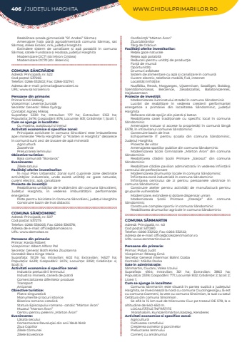 406 / JUDE%u021aUL HARGHITA WWW.GHIDULPRIMARIILOR.ROReabilitare %u0219coala gimnazial%u0103 %u201dSf. Andrei%u201d S%u0103rma%u0219Amenajare hala pia%u021b%u0103%u00a0 agroalimentar%u0103 comuna S%u0103rma%u0219, sat S%u0103rma%u0219, Aleea Eroilor, nr.6, jude%u021bul HarghitaExtindere sistem de canalizare %u0219i ap%u0103 potabil%u0103 %u00een comuna S%u0103rma%u0219, satele Fundoaia %u0219i Hodo%u0219a, jude%u021bul HarghitaModernizare DC71 (str.Miron Cristea)Modernizare DC70 (str. Bisericii)COMUNA S%u00c2NCR%u0102IENIAdres%u0103: Principal%u0103, nr. 522Cod po%u0219tal: 537265Telefon: 0266-332502; Fax: 0266-332741; Adresa de e-mail: primaria@sancraieni.roURL: www.sancraieni.roPersoane din primarie:Primar:Ern%u0151%u00a0Sz%u00e9kely%u00a0Viceprimar: Levente Jurcs%u00e1k%u00a0Secretar General : R%u00e9ka Gy%u00f6rgy%u00a0Contabil: Agne%u015f%u00a0Miklo%u015fSuprafa%u021ba:%u00a0 5330 ha; Intravilan:%u00a0 177 ha; Extravilan:%u00a0 5153 ha; Popula%u021bia:%u00a02476; Gospod%u0103rii:%u00a0876; Locuin%u021be:%u00a0831; Gr%u0103dini%u021be:%u00a01; %u0218coli:%u00a01; Cum se ajunge in localitate:Cu ma%u0219ina, autobuzul %u0219i trenulActivitati economice si specifice zonei:Principala activitate %u00een comuna S%u00eencr%u0103ieni este %u00eembutelierea apei minerale %u201cPerla Harghitei%u201d %u015fi %u201cKraiten in Harghita%u201d deoarece %u00een comun%u0103 sunt zeci de izvoare de ap%u0103 mineral%u0103Agricultur%u0103ZootehniePrelucrarea lemnuluiObiective turistice:Baia comunal%u0103 %u201cBorsaros%u201dEvenimente:Zilele satuluiFacilit%u00e3%u0163i oferite investitorilor:%u00cen noul Plan Urbanistic Zonal sunt cuprinse zone destinate activit%u0103%u0163ilor industriale, unde exist%u0103 utilit%u0103%u0163i ca: gaze naturale, curent electric, ap%u0103, canalizareProiecte de investi%u0163ii:Reabilitarea unit%u0103%u021bilor de %u00eenv%u0103%u021b%u0103m%u00e2nt din comuna S%u00e2ncr%u0103ieni, Jude%u021bul Harghita, %u00een vederea %u00eembun%u0103t%u0103%u021birii performan%u021bei energeticePiste pentru biciclete %u00een Comuna S%u00e2ncr%u0103ieni, jude%u021bul Harghita Construire bazin de %u00eenot didacticCOMUNA S%u00c2NDOMINICAdres%u0103: Principal%u0103, nr. 507Cod po%u0219tal: 537275Telefon: 0266-336005; Fax: 0266-336578; Adresa de e-mail: office@domokos.roURL: www.domokos.roPersoane din primarie:Primar: Karda R%u00f3bertViceprimar: Albert Alfonz PalSecretar General: Both Kinka ZsuzsannaContabil: Bara Kinga MariaSuprafa%u021ba:%u00a0 15129 ha; Intravilan:%u00a0 602 ha; Extravilan:%u00a0 14527 ha; Popula%u021bia:%u00a0 6439; Gospod%u0103rii:%u00a0 2474; Locuin%u021be:%u00a0 2250; Gr%u0103dini%u021be:%u00a0 4; %u0218coli:%u00a05; Activitati economice si specifice zonei:Industria prelucr%u0103rii lemnuluiIndustria minier%u0103, carier%u0103 de piatr%u0103Comercializarea diferitelor produseTransportArtizanatObiective turistice:Piatra singuratic%u0103Monumente %u015fi locuri istoriceBiserica romano-catolic%u0103Statuia Episcopului romano- catolic %u201cM%u00e1rton %u00c1ron%u201dMuzeul %u201dMarton %u00c1ron%u201dCentru pentru pelerini %u201eM%u00e1rton %u00c1ron%u201dEvenimente:L%u0103sata seculuiComemorare Revolu%u0163iei din anii 1848-1849Ziua CopiilorZilele ComuneiZilele EcvestriceConferin%u0163%u0103 %u201cM%u00e1rton %u00c1ron%u201dZiua b%u0103tr%u00e2nilorT%u00e2rg de Cr%u0103ciunFacilit%u00e3%u0163i oferite investitorilor:Re%u0163ea gaze naturaleRe%u0163ea ap%u0103 potabil%u0103Reduceri pentru unit%u0103%u0163i de produc%u0163ie For%u0163%u0103 de munc%u0103Oportunit%u0103%u021biDrumuri asfaltateSistem de alimentare cu ap%u0103 %u0219i canalizare %u00een comun%u0103Curent electric, telefonie mobil%u0103, fix%u0103, internetLocalit%u0103%u021bi %u00eenfr%u0103%u021bite:Nu%u0219f%u0103l%u0103u, Recsk, Magyargec, Ujszentivan, Szodliget, Boldog, Szentdomonokos, Berzence, Jakabszallas, Balatonszemes, HajdusamsonProiecte de investi%u0163ii:Modernizarea iluminatului stradal %u00een comuna S%u00e2ndominicLucr%u0103ri de reabilitare %u00een vederea cre%u0219terii performan%u021bei energetice a prim%u0103riei din localitatea S%u00e2ndominic, jude%u021bul HarghitaRefacere zid de sprijin din piatr%u0103 %u0219i betonReabilitarea casei tradi%u021bionale cu specific local %u00een comuna S%u00e2ndominicAmenajare trotuar %u0219i accese la propriet%u0103%u021bi %u00een comun%u0103%u00a0 l%u00e2ng%u0103 E578, %u00een intravilanul comunei S%u00e2ndominicConstruire bazin de %u00eenotEchipamente IT pentru %u0219coala din comuna S%u00e2ndominic, Jude%u021bul HarghitaProiecte de viitorAmenajarea spa%u021biilor publice din comuna S%u00e2ndominicModernizarea %u0218colii Gimnaziale %u201eM%u00e1rton %u00c1ron%u201d din comuna S%u00e2ndominicReabilitarea cl%u0103dirii %u0218colii Primare %u201eS%u00e1ros%u00fat%u201d din comuna S%u00e2ndominicReabilitare cl%u0103dire pavilion administrativ %u00een vederea %u00eenfiin%u021b%u0103rii centrului de perfec%u021bionareModernizarea drumurilor locale %u00een comuna S%u00e2ndominic%u00cenfiin%u021barea zon%u0103 industrial%u0103 %u00een comuna S%u00e2ndominic%u00cenfiin%u021barea centrului de zi pentru persoanele v%u00e2rstnice %u00een comuna S%u00e2ndominicConstruire atelier pentru activit%u0103%u021bi de manufactur%u0103 pentru grupurile vulnerabileModernizare, extindere %u0219i dotare dispensar umanModernizarea %u0218colii Primare %u201eCseralja%u201d din comuna S%u00e2ndominicConstruire complex sportiv %u00een comuna S%u00e2ndominicReabilitarea drumurilor agricole %u00een comuna S%u00e2ndominicCOMUNA S%u00c2NMARTIN Adres%u0103: Principal%u0103, nr. 40Cod po%u0219tal: 537280Telefon: 0266-332122; Fax: 0266-332122; Adresa de e-mail: office@csikszentmarton.roURL: www.sanmartinciuc.roPersoane din primarie:Primar: Poty%u00f3%u00a0JuditViceprimar: R%u00e9szeg Ern%u00f6Secretar General interimar: B%u00e1lint CsabaContabil%u00a0: Mikl%u00f3s DorkaSate %u00een administra%u021bie:S%u00e2nmartin, Ciucani, Valea UzuluiSuprafa%u021ba:%u00a0 4164; Intravilan:%u00a0 301 
