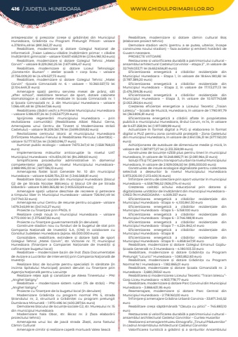416 / JUDE%u021aUL HUNEDOARA WWW.GHIDULPRIMARIILOR.ROantepre%u0219colar %u0219i pre%u0219colar (cre%u0219e %u0219i gr%u0103dini%u021be) din Municipiul Hunedoara, Gr%u0103dini%u021ba cu Program Prelungit Piticot%u2013 valoare 4.378.914,49 lei (891.363,37 euro)Reabilitare, modernizare %u0219i dotare Colegiul Na%u021bional de Informatic%u0103 %u201eTraian Lalescu%u2013cl%u0103dire %u00eenv%u0103%u021b%u0103m%u00e2nt primar + cl%u0103dire %u00eenv%u0103%u021b%u0103m%u00e2nt gimnazial %u2013 valoare 10.657.458,09 lei (2.164.961,92 euro)Reabilitare, modernizare %u0219i dotare Colegiul Tehnic %u201eMatei Corvin%u201d %u2013 valoare 8.229.260,25 lei (1.671.696,47 euro)Reabilitare, modernizare %u0219i dotare Liceul Tehnologic %u201eConstantin Bursan%u201d %u2013 atelier %u0219coal%u0103 + corp liceu %u2013 valoare 21.756.009,20 lei (4.419.527,73 euro)Reabilitare, modernizare %u0219i dotare Colegiul Tehnic %u201eMatei Corvin%u201d %u2013%u0218coala Gimnazial%u0103 nr. 6 %u2013 valoare %u2013 10.360.557,72 lei (2.104.649,31 euro)Amenajare spa%u021bii pentru servirea mesei de pr%u00e2nz, s%u0103li %u201eafter school%u201d, reabilitare terenuri de sport, dotare cabinete stomatologice %u0219i cabinete medicale %u00een %u0218coala Gimnazial%u0103 nr. 1 %u0219i %u0218coala Gimnazial%u0103 nr. 2. din Municipiul Hunedoara %u2013 valoare 1.066.491,48 lei (216.647,66 euro)Reabilitarea cl%u0103dirii vechi a Prim%u0103riei Municipiului Hunedoara %u2013 valoare 5.186.937,24 lei (1.053.677,29 euro)Sprijinirea regener%u0103rii municipiului Hunedoara %u2013 prin revitalizarea comunit%u0103%u021bii (Reabilitarea Albiei R%u00e2ului Cerna, Amenajarea unui Centru de Tineret %u0219i Modernizarea str%u0103zii Castelului) %u2013 valoare 18.209.361,78 lei (3.699.059,82 euro)Revitalizarea centrului istoric al municipiului Hunedoara (%u00cenfiin%u021barea Muzeului Fierului %u0219i Reabilitarea Parcului Libert%u0103%u021bii) %u2013 valoare 15.177.157,54 lei (3.083.096,17 euro)Iluminat public ecologic %u2013 valoare 7.673.347,41 lei (1.558.768,03 euro)Implementarea m%u0103surilor anticorup%u021bie la nivelul UAT Municipiul Hunedoara %u2013414.834,00 lei (84.269,60 euro)Simplificarea procedurilor administrative %u00een domeniul competen%u021belor partajate, la nivelul Municipiului Hunedoara%u2013 2.988.995,00 lei ( 607.186,10 euro)Amenajarea fostei %u0218coli Generale Nr. 10 din municipiul Hunedoara%u00a0%u2013 valoare 6.628.754,33 lei (1.346.568,81 euro)Reabilitare blocuri sociale din municipiul Hunedoara (blocul G2 de pe Strada Nicolae B%u0103lcescu %u0219i blocul G9 de pe Strada Eliber%u0103rii%u2013 valoare 9.380.365,82 lei (1.905.532,69 euro)Amenajare spa%u021bii urbane deschise de recreere %u0219i petrecere a timpului liber %u00een Municipiul Hunedoara%u2013 valoare 726.941,49 lei (147.740.32 euro)Amenajarea unui Centru de resurse pentru ocupare%u2013 valoare 1.679.345,99 lei (341.143,27 euro)Proiecte cu finan%u0163are prin PNDL IIRealizare cre%u0219%u0103 nou%u0103 %u00een municipiul Hunedoara %u2013 valoare 6.772.000 lei (1.375.667,82 euro)Proiecte cu finan%u0163are guvernamental%u0103 (%u00een derulare)Construire stadion nou cu fonduri de la bugetul de stat prin Compania Na%u021bional%u0103 de Investi%u021bii S.A. (CNI) %u00een colaborare cu Consiliul Jude%u021bean Hunedoara (aprox. 65.000.000 euro)Consolidare, reabilitare, extindere %u0219i dotare Sal%u0103 de sport Colegiul Tehnic %u201eMatei Corvin%u201d, str. Victoriei nr. 17, municipiul Hunedoara (finan%u021bare a Companiei Na%u021bionale de Investi%u021bii %u0219i cofinan%u021bare bugetul local)Reabilitare %u2013 modernizare bazin de %u00eenot (faza Documenta%u021biei de Avizare a Lucr%u0103rilor de Interven%u021bii) prin Compania Na%u0163ional%u0103 de Investi%u0163iiRealizare bloc de locuin%u021be pentru speciali%u0219ti %u00een s%u0103n%u0103tate (%u00een incinta Spitalului Municipal) proiect derulat cu finan%u021bare prin Agen%u0163ia Na%u0163ional%u0103 pentru Locuin%u0163eRealizare re%u0163ea ap%u0103 %u015fi canalizare pe Aleea Tineretului - PNI %u201eAnghel Saligny%u201dReabilitare %u2013 modernizare sistem rutier (75 de str%u0103zi) - PNI %u201eAnghel Saligny%u201dProiecte cu finan%u0163are de la bugetul local (%u00een derulare)Modernizare Gr%u0103dini%u021ba cu program normal PN 5, strada %u0218trandului nr, 2, structur%u0103 a Gr%u0103dini%u021bei cu program prelungit Dumbrava Minunat%u0103 %u2013 1.970.496 lei (400.287,64 euro)Demolarea blocului de locuin%u021be sociale G2, str. Mure%u0219ului nr. 15 din municipiul HunedoaraModernizare hala Obor, str. Bicaz nr. 2 (faza elabor%u0103rii proiectului tehnic)Amenajarea unui loc de joac%u0103 strada Zla%u0219ti, zona fostului C%u0103min CulturalAmenajare cimitir %u0219i realizare capel%u0103 mortuar%u0103 Valea Seac%u0103Reabilitare, modernizare %u0219i dotare c%u0103min cultural Bo%u0219 (elaborare proiect tehnic)Demolare stadion vechi (pentru a se putea, ulterior, %u00eencepe construirea noului stadion) %u2013 faza avizelor %u015fi emiterii hot%u0103r%u00e2rii de Guvern necesare.PROIECTE VIITOARERestaurarea %u0219i valorificarea durabil%u0103 a patrimoniului cultural %u2013 ansamblul arhitectural Castelul Corvinilor %u2013 etapa 2%u201d , %u00een valoare de 32.749.033,71 lei (6.652.656,81 euro)Eficientizarea energetic%u0103 a cl%u0103dirilor reziden%u0163iale din Municipiul Hunedoara %u2013 Etapa 1, %u00een valoare de 18.644.180,82 lei (3.787.389,20 euro)Eficientizarea energetic%u0103 a cl%u0103dirilor reziden%u021biale din Municipiul Hunedoara - Etapa 2, %u00een valoare de 17.113.271,13 lei (3.476.399,36 euro)Eficientizarea energetic%u0103 a cl%u0103dirilor reziden%u0163iale din Municipiul Hunedoara %u2013 Etapa 3, %u00een valoare de 10.107.743,68 (2.053.292,64 euro)Cre%u0219terea eficien%u021bei energetice a Liceului Teoretic %u201eTraian Lalescu%u201d %u2013 %u0218coala de Muzic%u0103, Hunedoara, %u00een valoare de 1.790.911,79 lei (363.806,81 euro)Eficientizarea energetic%u0103 a cl%u0103dirii aflat