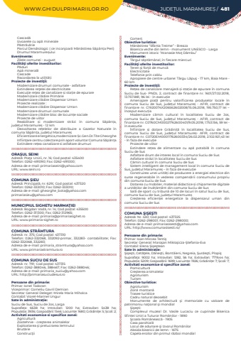 WWW.GHIDULPRIMARIILOR.RO JUDE%u021aUL MARAMURE%u0218 / 481Cascad%u0103Izvoarele cu ap%u0103 mineraleP%u0103str%u0103v%u0103rieParcul Dendrologic ( ce inconjoar%u0103 M%u0103n%u0103stirea S%u0103p%u00e2n%u021ba Peri) Drumul Maramure%u0219uluiEvenimente:Zilele comunei - augustFacilit%u00e3%u0163i oferite investitorilor:P%u0103duriAp%u0103 mineral%u0103CascadeRacordarea la utilit%u0103%u021biProiecte de investi%u0163ii:Modernizare drumuri comunale - asfaltareExtinderea re%u0163elei de electricitateExecu%u0163ie re%u0163ea de canalizare %u0219i sta%u021bie de epurareModernizare cl%u0103dire Prim%u0103rieModernizare cl%u0103dire Dispensar UmanProiecte realizate :Modernizare cl%u0103dire Dispensar UmanModernizare drumuri comunaleModernizare cl%u0103dire bloc de locuin%u021be socialeProiecte de viitorReabilitare %u0219i modernizare str%u0103zi %u00een comuna%u00a0 S%u0103p%u00e2n%u021ba, jude%u021bul%u00a0Maramure%u0219 - 12 kmDezvoltarea re%u021belelor de distribuire a Gazelor Naturale %u00een comuna%u00a0S%u0103p%u00e2n%u021ba,%u00a0jude%u021bul%u00a0Maramure%u0219Eficientizare energetica,modernizare %u0218c.Gen.Dr.Tite GheorgheInfiin%u021bare centru colectare prin aport voluntar Comuna S%u0103p%u00e2n%u021baExtindere re%u021bea canalizare si asfaltare drumuri ORA%u0218UL SEINIAdres%u0103: Pia%u0163a Unirii, nr. 16; Cod po%u0219tal: 435400Telefon: 0262-491090; Fax: 0262-491000; Adresa de e-mail: primariaseini@yahoo.comURL: www.seini.roCOMUNA %u0218IEUAdres%u0103: Principal%u0103, nr. 629; Cod po%u0219tal: 437320Telefon: 0262-333010; Fax: 0262-333010; Adresa de e-mail: gheorghe_bota@yahoo.comprimariasieu@yahoo.comMUNICIPIUL SIGHETU MARMA%u0162IEIAdres%u0103: Bogdan Vod%u0103, nr. 14; Cod po%u0219tal: 435500Telefon: 0262-311300; Fax: 0262-312965; Adresa de e-mail: primaria@primariasighet.roURL: www.primaria-sighet.roCOMUNA STR%u00c2MTURAAdres%u0103: nr. 375; Cod po%u0219tal: 437310Telefon: 0262-332068, 332092-primar, 332283- contabilitate; Fax: 0262-332068, 332283; Adresa de e-mail: primaria_stramtura@yahoo.comURL: www.primariastramtura.roCOMUNA SUCIU DE SUSAdres%u0103: nr. 791; Cod po%u0219tal: 437315Telefon: 0262-388046, 388467; Fax: 0262-388046; Adresa de e-mail: primaria_suciu@yahoo.comURL: http://primariasuciudesus.roPersoane din primarie:Primar: Ionel TodoranViceprimar: Corneliu Gavril DemianSecretar General Delegat: Mirela Maria MiholcaContabil: Viorel-Marinel UngurSate %u00een administra%u021bie:Suciu de Sus, Suciu de Jos, LargaSuprafa%u021ba:%u00a0 6638 ha; Intravilan:%u00a0 1200 ha; Extravilan:%u00a0 5438 ha; Popula%u021bia:%u00a03936; Gospod%u0103rii:%u00a01546; Locuin%u021be:%u00a01680; Gr%u0103dini%u021be:%u00a05; %u0218coli:%u00a02; Activitati economice si specifice zonei:Agricultur%u0103Zootehnie - cre%u015fterea animalelorExploatarea %u015fi prelucrarea lemnuluiBrut%u0103rieConstruc%u0163iiComer%u0163Obiective turistice:M%u0103n%u0103stirea %u201cSf%u00e2nta Treime%u201d - BreazaBiserica veche din lemn - monument UNESCO - LargaMonument istoric %u201cAtanasie Mo%u0163 D%u00e2mbu%u201dEvenimente:T%u00e2rgul s%u0103pt%u0103m%u00e2nal, %u00een fiecare miercuriFacilit%u00e3%u0163i oferite investitorilor:Teren %u015fi for%u0163%u0103 de munc%u0103ElectricitateTelefonie prin cabluApropiere de centre urbane: T%u00e2rgu L%u0103pu%u015f - 17 km, Baia Mare - 60 kmProiecte de investi%u0163ii:Re%u021bea de canalizare menajer%u0103%u00a0%u0219i sta%u021bie de epurare %u00een comuna Suciu de Sus- PNDL 2, contract de finan%u021bare nr. 1601/27.02.2018, 13.757.881, 96 lei - %u00een execu%u021bieAmenajare pia%u021b%u0103%u00a0 pentru valorificarea produselor locale %u00een comuna Suciu de Sus, jude%u021bul Maramure%u0219%u00a0 - AFIR, contract de finan%u021bare nr. C1920074X206562602008/15.06.2018, 195.750,17 lei%u00a0 %u2013 %u00eenceput execu%u021biaModernizare c%u0103min cultural %u00een localitatea Suciu de Jos, comuna Suciu de Sus, jude%u021bul Maramure%u0219%u00a0 - AFIR, contract de finan%u021bare nr. C0760CM00021762600401/9.05.2018, 1.753.156, 59 lei - %u00een executie%u00cenfiin%u021bare %u0219i dotare Gr%u0103dini%u021b%u0103%u00a0 %u00een localitatea Suciu de Sus, comuna Suciu de Sus, jude%u021bul Maramure%u0219- AFIR, contract de finan%u021bare nr. C0720EM00011762600334/26.02.2018, 2.102.921,43 lei - %u00een faza de execu%u021bieProiecte de viitorExtindere re%u021bea de alimentare cu ap%u0103%u00a0 potabil%u0103%u00a0 %u00een comuna Suciu de SusAsfaltare drum de interes local %u00een comuna Suciu de SusAsfaltare str%u0103zi %u00een localitatea Suciu de SusC%u0103min cultural %u00een comuna Suciu de SusSistem intelligent de management local %u00een comuna Suciu de Sus, jude%u021bul Maramure%u0219%u00a0%u2013 %u00een faza de execu%u021bieConstruirea unei unit%u0103%u021bi de producere a energiei electrice din surse regenerabile %u00een vederea compens%u0103rii consumului propriu din comuna Suciu de SusDotarea cu mobilier, material didactice %u0219i chipamente digitale a unit%u0103%u021bilor de %u00eenv%u0103%u021b%u0103m%u00e2nt din comuna Suciu de SusSal%u0103 de sport cu tribun%u0103%u00a0de 10 de locuri %u00een satul Suciu de Sus, comuna Suciu de Sus, jude%u021bul Maramure%u0219Cre%u0219terea eficien%u021bei energetice la dispensarul uman din comuna Suciu de SusCOMUNA %u015eI%u015eE%u015eTIAdres%u0103: Nr. 430; Cod po%u0219tal: 437325Telefon: 0262-298001; Fax: 0262-298000; Adresa de e-mail: primariasisesti@yahoo.comURL: http://www.comunasisesti.ro/Persoane din primarie:Primar: Ioan-Mircea Tenti%u015fSecretar General: Maro%u015fan Miklo%u015ficza-%u015etefania-EvaContabil: Elena %u015ei%u015fe%u015fteanSate %u00een administra%u021bie:%u015ei%u015fe%u015fti, Cet%u0103%u0163ele,%u00a0D%u0103ne%u015fti,%u00a0Bont%u0103ieni, Negreia, %u015eurde%u015fti,%u00a0Plopi%u015fSuprafa%u021ba:%u00a0 9002 ha; Intravilan:%u00a0 1282, 56 ha; Extravilan:%u00a0 7719,44 ha; Popula%u021bia:%u00a05209; Gospod%u0103rii:%u00a01699; Locuin%u021be:%u00a01926; Gr%u0103dini%u021be:%u00a07; %u0218coli:%u00a07; A
