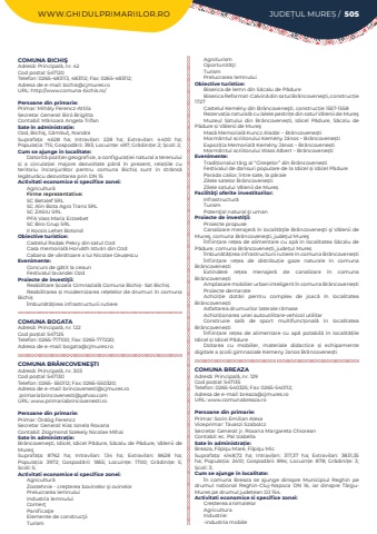 WWW.GHIDULPRIMARIILOR.RO JUDE%u021aUL MURE%u0218 / 505COMUNA BICHI%u015eAdres%u0103: Principal%u0103, nr. 42Cod po%u0219tal: 547120Telefon: 0265-483113, 483112; Fax: 0265-483112; Adresa de e-mail: bichis@cjmures.roURL: http://www.comuna-bichis.ro/Persoane din primarie:Primar: Mih%u00e1ly Ferencz-AttilaSecretar General: Bir%u00f3%u00a0BrigittaContabil:%u00a0M%u0103rioara Angela%u00a0TrifanSate %u00een administra%u021bie:Ozd, Bichi%u015f, G%u00e2mbu%u021b, NandraSuprafa%u021ba:%u00a0 4628 ha; Intravilan:%u00a0 228 ha; Extravilan:%u00a0 4400 ha; Popula%u021bia:%u00a0715; Gospod%u0103rii:%u00a0393; Locuin%u021be:%u00a0497; Gr%u0103dini%u021be:%u00a02; %u0218coli:%u00a02; Cum se ajunge in localitate:Datorit%u0103 pozi%u021biei geografice, a configura%u021biei natural a terenului %u0219i a circula%u021biei majore dezvoltate p%u00e2n%u0103 %u00een prezent, rela%u021biile cu teritoriu %u00eenconjur%u0103tor pentru comuna Bichi%u0219 sunt %u00een str%u0103ns%u0103 leg%u0103tur%u0103cu dezvoltarea prin DN 15Activitati economice si specifice zonei:Agricultur%u0103 Firme reprezentative:SC Betalef SRLSC Alin Bota Agro Trans SRLSC ZASIU SRLPFA Vass Maria ErzsebetSC Biro Grup SRLII Kocsis Lehet BotondObiective turistice:Castelul Radak Pekry din satul OzdCasa memorial%u0103 Horv%u00e1th Istv%u00e1n din OzdCabana de v%u00e2n%u0103toare a lui Nicolae Ceu%u0219escuEvenimente:Concurs de g%u0103tit la ceaun Festivalul lavandei OzdProiecte de investi%u0163ii:Reabilitare %u0218coala Gimnazial%u0103 Comuna Bichi%u0219- Sat Bichi%u0219Reabilitarea %u0219i modernizarea re%u021belelor de drumuri %u00een comuna Bichi%u0219 %u00cembun%u0103t%u0103%u021birea infrastructurii rutiereCOMUNA BOGATAAdres%u0103: Principal%u0103, nr. 122Cod po%u0219tal: 547125Telefon: 0265-717100; Fax: 0265-717220; Adresa de e-mail: bogata@cjmures.roCOMUNA BR%u00c2NCOVENE%u015eTIAdres%u0103: Principal%u0103, nr. 303Cod po%u0219tal: 547130Telefon: 0265- 550112; Fax: 0265-550320; Adresa de e-mail: brincovenesti@cjmures.ro primariabrincovenesti@yahoo.comURL: www.primariabrincovenesti.roPersoane din primarie:Primar: %u00d6rd%u00f6g FerenczSecretar General: Kiss Ionela RoxanaContabil: Zsigmond Szekely Nicolae MihaiSate %u00een administra%u021bie:Br%u00e2ncovene%u015fti, Idicel, Idicel P%u0103dure, S%u0103calu de P%u0103dure, V%u0103lenii de Mure%u015fSuprafa%u021ba:%u00a0 8762 ha; Intravilan:%u00a0 134 ha; Extravilan:%u00a0 8628 ha; Popula%u021bia:%u00a0 3972; Gospod%u0103rii:%u00a0 1855; Locuin%u021be:%u00a0 1700; Gr%u0103dini%u021be:%u00a0 5; %u0218coli:%u00a05; Activitati economice si specifice zonei:Agricultur%u0103Zootehnie - cre%u015fterea bovinelor %u015fi ovinelorPrelucrarea lemnuluiIndustria lemnuluiComer%u0163Panifica%u0163ieElemente de construc%u0163iiTurismAgroturismOportunit%u0103%u0163i:Turism Prelucrarea lemnuluiObiective turistice:Biserica de lemn din S%u0103calu de P%u0103dureBiserica Reformat-Calvin%u0103 din satul Br%u00e2ncovene%u015fti, construc%u021bie 1727Castelul Kem%u00e9ny din Br%u00e2ncovene%u015fti, construc%u021bie 1557-1558Rezerva%u021bia natural%u0103 cu lalele pestri%u021be din satul V%u0103lenii de Mure%u015fMuzeul Satului din Br%u00e2ncovene%u0219ti, Idicel P%u0103dure, S%u0103calu de P%u0103dure %u0219i V%u0103lenii de Mure%u015fMas%u0103 Memorial%u0103 Kuncz Alad%u00e1r %u2013 Br%u00e2ncovene%u0219tiMorm%u00e2ntul scriitorului Kem%u00e9ny J%u00e1nos %u2013 Br%u00e2ncovene%u0219tiExpozi%u021bia Memorial%u0103 Kem%u00e9ny J%u00e1nos %u2013 Br%u00e2ncovene%u0219ti Morm%u00e2ntul scriitorului Wass Albert %u2013 Br%u00e2ncovene%u0219tiEvenimente:Tradi%u021bionalul t%u00e2rg al %u201cCire%u015felor%u201d din Br%u00e2ncovene%u0219tiFestivalul de dansuri populare de la Idicel %u0219i Idicel P%u0103dureParada cailor, %u00eentre sate, la p%u00e2raieZilele satelor Br%u00e2ncovene%u0219ti Zilele satului V%u0103lenii de Mure%u0219Facilit%u00e3%u0163i oferite investitorilor:Infrastructur%u0103TurismPoten%u0163ial natural %u015fi umanProiecte de investi%u0163ii:Proiecte propuseCanalizare menajer%u0103 %u00een localit%u0103%u0163ile Br%u00e2ncovene%u015fti %u015fi V%u0103lenii de Mure%u015f, comuna Br%u00e2ncovene%u015fti, jude%u0163ul Mure%u015f%u00cenfiin%u021bare re%u021bea de alimentare cu ap%u0103 %u00een localitatea S%u0103calu de P%u0103dure, comuna Br%u00e2ncovene%u0219ti, jude%u021bul Mure%u0219%u00cembun%u0103t%u0103%u021birea infrastructurii rutiere %u00een comuna Br%u00e2ncovene%u0219ti%u00cenfiin%u021bare re%u021bea de distribu%u021bie gaze naturale %u00een comuna Br%u00e2ncovene%u0219tiExtindere re%u021bea menajer%u0103 de canalizare %u00een comuna Br%u00e2ncovene%u0219tiAmplasare mobilier urban inteligent %u00een comuna Br%u00e2ncovene%u0219tiProiecte demarateAchizi%u021bie dot%u0103ri pentru complex de joac%u0103 %u00een localitatea Br%u00e2ncovene%u0219tiAsfaltarea drumurilor laterale r%u0103maseAchizi%u021bionarea unei autoutilitare-vehicol utilitarConstruire sal%u0103 de sport multifunc%u021bonal%u0103 %u00een localitatea Br%u00e2ncovene%u0219ti%u00cenfiin%u021bare re%u021bea de alimentare cu ap%u0103 potabil%u0103 %u00een localit%u0103%u021bile Idicel %u0219i Idicel P%u0103dure Dotarea cu mobilier, materiale didactice %u0219i echipamente digitale a %u0219colii gimnaziale Kemeny Janos Br%u00e2ncovene%u0219tiCOMUNA BREAZAAdres%u0103: Principal%u0103, nr. 129Cod po%u0219tal: 547135Telefon: 0265-540325; Fax: 0265-540112; Adresa de e-mail: breaza@cjmures.roURL: www.comunabreaza.roPersoane din primarie:Primar:%u00a0Sorin Emilian AlexaViceprimar: Tavaszi SzabolczSecretar General: jr. Roxana Margareta ChioreanContabil: ec. Pal IzabellaSate %u00een administra%u021bie:Breaza, Filpi%u015fu Mare, Filpi%u015fu MicSuprafa%u021ba:%u00a0 4148,72 ha; Intravilan:%u00a0 317,37 ha; Extravilan:%u00a0 3831,35 ha; Popula%u021bia:%u00a0 2410; Gospod%u0103rii:%u00a0 894; Locuin%u021be:%u00a0 878; Gr%u0103dini%u021be:%u00a0 3; %u0218coli:%u00a03; Cum se ajunge in localitate:%u00cen comuna Breaza se ajunge dinspre Municipiul Reghin 