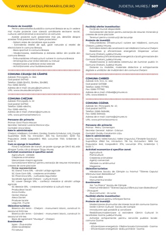 WWW.GHIDULPRIMARIILOR.RO JUDE%u021aUL MURE%u0218 / 507Proiecte de investi%u0163ii:Pentru dezvoltarea durabil%u0103%u00a0a comunei Breaza se au %u00een vedere mai multe proiecte care vizeaz%u0103%u00a0 urm%u0103toarle sectoare: social, cultural, administrative %u0219i economic al comunei.Aceste proiecte sunt prezentate mai jos, detaliile despre acestea fiind prezentate %u00een fi%u0219ele proiectelor:- Sistem re%u021bea de canalizare ape auzate-%u00a0 Extinderea re%u021belei de ap%u0103, gaze naturale %u0219i re%u021belei de electricitate %u00een comuna Breaza-%u00a0Baza sportiv%u0103%u00a0%u00een comuna Breaza-%u00a0 Modernizarea, reabilitarea %u0219i dotarea s%u0103lilor din %u0219colile din comuna Breaza- %u00cembunat%u0103%u021birea infrastructurii rutiere %u00een comuna Breaza-%u00a0Amenajarea unor str%u0103zi laterale cu trotuar-%u00a0Modernizare %u0219i asfaltare str%u0103zi laterale-%u00a0Achizi%u021bionarea unui buldoexcavatorCOMUNA CEUA%u015eU DE C%u00c2MPIEAdres%u0103: Principal%u0103, nr. 365Cod po%u0219tal: 547140Telefon: 0265-324112, 324164, 324383; Fax: 0265-324112; Adresa de e-mail: ceuasu@cjmures.roURL: www.ceuasudecampie.roCOMUNA CHE%u0162ANIAdres%u0103: Principal%u0103, nr. 51Cod po%u0219tal: 547150Telefon: 0265-484114; Fax: 0265-484114; Adresa de e-mail: chetani@cjmures.roURL: www.primariachetani.roPersoane din primarie:Primar: Emil Florin MocanSecretar General:%u00a0Lorena Monica U%u0163iu%u00a0Contabil: Anca S%u0103rac%u00a0Sate %u00een administra%u021bie:Che%u0163ani, H%u0103d%u0103reni, Grindeni, Cordo%u015f, Coasta Grindului, Lin%u0163, Giurgi%u0219Suprafa%u021ba:%u00a0 5535 ha; Intravilan:%u00a0 305 ha; Extravilan:%u00a0 5230 ha; Popula%u021bia:%u00a0 2468; Gospod%u0103rii:%u00a0 950; Locuin%u021be:%u00a0 1150; Gr%u0103dini%u021be:%u00a0 3; %u0218coli:%u00a03; Cum se ajunge in localitate:Fiind o localitate de tranzit ,se poate ajunge pe DN E 60, at%u00e2t dinspre Turda, c%u00e2t %u0219i dinspre T%u00e2rgu Mure%u0219Activitati economice si specifice zonei:Agricultur%u0103 - cerealeCre%u015fterea animalelorMecanizare-ma%u015fini agricoleConcesionare%u00a0terenuri pentru extrac%u0163ia de resurse minerale %u015fi crearea de zone piscicoleFirme reprezentative:SC Diana Trans SRL - v%u00e2nz%u0103ri utilaje agricoleSC Gore Com SRL - cre%u0219terea animalelorSC Prod Anca SRL - cultivarea legumelorSocietate Agricol%u0103 Che%u021bani - cultur%u0103 mareSC Lower Design SRL - confec%u021bii metalice %u0219i v%u00e2nz%u0103ri utilaje agricoleSC Bestsie SRL - cre%u0219terea animalelor %u0219i cultur%u0103%u00a0mareProduc%u0103tori locali:Anca OvidiuCeclan MariusAlexa DanielProduse locale: Legume , fructeObiective turistice:Biserica din lemn - Che%u0163ani - monument istoric, construit %u00een secolul al XVIII-leaBiserica din lemn - Grindeni - monument istoric, construit %u00een secolul al VIII-leaBaza de agrement %u201cMure%u015ful%u201d - Che%u0163aniEvenimente:Ispas - Ziua eroilorZilele localit%u0103%u0163ilorFiii satuluiFacilit%u00e3%u0163i oferite investitorilor:For%u0163%u0103 de munc%u0103 disponibil%u0103Concesion%u0103ri de teren pentru extrac%u0163ia de resurse minerale %u015fi crearea de zone piscicoleTerenuri pentru construc%u0163ii de locuin%u0163eProiecte de investi%u0163ii:%u00cembun%u0103t%u0103%u021birea infrastructurii rutiere sat H%u0103d%u0103reni, comuna Che%u021bani, jude%u021bul Mure%u015fExtindere sistem de canalizare %u00een sat H%u0103d%u0103reni Comuna Che%u0163aniReabilitare %u015fi eficientizare energetic%u0103 Dispensar uman Comuna Che%u021bani, jude%u021bul Mure%u015fReabilitarea %u015fi eficientizarea energetic%u0103 a %u0218colii gimnaziale din Comuna Chetani, jude%u021bul Mure%u015fModernizarea %u0219i extinderea sistemului de iluminat public %u00een Comuna Che%u021bani, Jude%u021bul Mure%u0219Dotarea cu mobilier, materiale didactice %u0219i echipamente digitale a unit%u0103%u021bilor de %u00eenv%u0103%u021b%u0103m%u00e2nt din comuna Che%u021baniCOMUNA CHIBEDAdres%u0103: D.N. 13 A, nr. 452;Cod po%u0219tal: 547268Telefon: 0265-717783; Fax: 0265-717783; Adresa de e-mail: chibed@cjmures.roURL: www.kibed.roCOMUNA COZMA Adres%u0103: Str. Principal%u0103, Nr. 41; Cod po%u0219tal: 547170Telefon: 0265-349456; Fax: 0265-349402; Adresa de e-mail: cozma@cjmures.roURL: www.primariacozma.roPersoane din primarie:Primar:%u00a0 Petru%u00a0%u00a0Ormeni%u015fan%u00a0Secretar General:%u00a0 Adrian%u00a0%u00a0Cr%u0103ciunContabil: Ovidiu Constantin%u00a0Li%u021biuSate %u00een administra%u021bie:Cozma, Socol, Valea Sasului,%u00a0Valea Ungurului,%u00a0F%u00e2na%u0163ele SocoluluiSuprafa%u021ba:%u00a0 2962 ha; Intravilan:%u00a0 116 ha; Extravilan:%u00a0 1695 ha; Popula%u021bia:%u00a0 645; Gospod%u0103rii:%u00a0 374; Locuin%u021be:%u00a0 374; Gr%u0103dini%u021be:%u00a0 1; %u0218coli:%u00a01; Activitati economice si specifice zonei:Agricultur%u0103Pomicultur%u0103Cre%u015fterea animalelorAgen%u0163i comercialiV%u00e2nzare cu am%u0103nuntulMagazine%u00a0Obiective turistice:M%u0103n%u0103stirea Socolu de C%u00e2mpie cu hramul %u201cT%u0103ierea Capului Sf%u00e2ntului Ioan Botez%u0103torul%u201dCrucea alb%u0103Monumentul eroilorEvenimente:Joc %u201cLa Praica%u201d Socolu de C%u00e2mpieHramul M%u0103n%u0103stirii %u201cT%u0103ierea Capului Sf%u00e2ntului Ioan Botez%u0103torul%u201d - 29 augustZiua comunei - 24 iunieFacilit%u00e3%u0163i oferite investitorilor:Teren agricol pentru %u00eenfiin%u0163are fermeProiecte de investi%u0163ii:Modernizarea drumurilor de interes local din comuna CozmaDot%u0103ri C%u0103min Cultural%u00a0 Socolu de CampieIntroducere ap%u0103 potabil%u0103 %u015fi canalizareReabilitare,modernizare %u0219i extindere C%u0103min Cultural %u00een localitatea Cozma jude%u021bul%u00a0Mure%u015fAchizi%u0163ie echipamente pentru serviciile publice localecomuna CozmaPNRR- Eficientizare energetic%u0103- Cl%u0103dire Scoala Gimnazial%u0103 - Cozma- Eficientizare energetic%u0103- sediu prim%u0103rie- Cozma