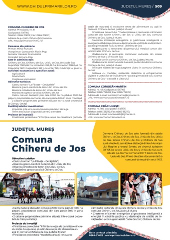 WWW.GHIDULPRIMARIILOR.RO JUDE%u021aUL MURE%u0218 / 509COMUNA CHIHERU DE JOSAdres%u0103: Principal%u0103, nr. 81Cod po%u0219tal: 547160Telefon: 0265-716112; Fax: 0265-716121; Adresa de e-mail: chiheru@cjmures.roURL: http://primariachiheru.ro/Persoane din primarie:Primar: Mihai RuncanViceprimar: Constantin Florin PopSecretar General: Maria HabaContabil: Simona PopSate %u00een administra%u021bie:Chiheru de Jos, Chiheru de Sus, Urisiu de Jos, Urisiu de SusSuprafa%u021ba:%u00a011525,84 ha; Intravilan:%u00a0265,35 ha; Extravilan:%u00a011260,49 ha; Popula%u021bia:%u00a01621; Gospod%u0103rii:%u00a0581; Locuin%u021be:%u00a0785; Gr%u0103dini%u021be:%u00a04; %u0218coli:%u00a04; Activitati economice si specifice zonei:Agricultur%u0103Silvicultur%u0103Cre%u015fterea animalelorObiective turistice:Castru roman %u201cLa F%u00e2na%u0163e - Cet%u0103%u0163elele%u201dBiserica greco-catolic%u0103 de lemn din Urisiu de JosBiserica ortodox%u0103 de lemn din Urisiu de SusM%u0103n%u0103stirea greco-catolic%u0103 Chiheru de JosCadru natural deosebit prin cele 2000 de ha p%u0103duri, 1000 ha p%u0103%u015funi, proprietatea comunei, din care peste 50% %u00een zona montan%u01032 cabane proprietatea prim%u0103riei situate %u00eentr-o zon%u0103 deosebit%u0103 la C%u00e2mpu Cet%u0103%u0163iiFacilit%u00e3%u0163i oferite investitorilor:Impozite %u015fi taxe la nivelul minim prev%u0103zut de legeTeren extravilan disponibil pentru arendareProiecte de investi%u0163ii:Finalizarea proiectului %u201c%u00eenfiin%u021bare re%u021bea de canalizare (inclusiv sta%u021bie de epurare) %u0219i extindere re%u021bea de alimentare cu ap%u0103 %u00een comuna Chiheru de Jos, jude%u021bul Mure%u0219%u201dFinalizarea proiectului %u201cmodernizarea %u0219i renovarea c%u0103minelor culturale din satele Chiheru de Jos %u0219i Urisiu de Jos, comuna Chiheru de Jos, jude%u021bul MuresCre%u0219terea eficien%u021bei energetice %u0219i gestinarea inteligent%u0103 a energiei %u00een cl%u0103dirile publice cu destina%u021bie de unit%u0103%u021bi de %u00eenv%u0103%u021b%u0103m%u00e2nt%u0219coala gimnazial%u0103 %u201cIuliu Grama%u201d, Chiheru de JosModernizarea %u0219i renovarea dispensarului medical uman din localalitatea Chiheru de SusModernizarea %u0219i renovarea c%u0103minelor culturale din satele Chiheru de Sus %u0219i Urisiu de SusAchizi%u021bie utv %u00een comuna Chiheru de Jos, jude%u021bul Mure%u0219Modernizarea sistemului de iluminat public stradal %u00een comuna Chiheru de Jos, jude%u021bul Mure%u0219%u00cenfiin%u021bare sistem de supraveghere video %u00een comuna Chiheru de JosDotarea cu mobilier, materiale didactice %u0219i echipamente digitale a unit%u0103%u021bilor de %u00eenv%u0103%u021b%u0103m%u00e2nt %u2013%u0219coala gimnazial%u0103 Iuliu Grama Chiheru de Jos %u2013 o %u0219coal%u0103 a viitoruluiCOMUNA COROIS%u00c2NMARTINAdres%u0103: nr. 49; Cod po%u0219tal: 547165Telefon: 0265-765012; Fax: 0265-765112; Adresa de e-mail: coroisinmartin@cjmures.roURL: www.comunacoroisinmartin.roCOMUNA CR%u0102CIUNE%u015eTIAdres%u0103: nr. 166; Cod po%u0219tal: 547175Telefon: 0265-332112; Fax: 0265-332113; Adresa de e-mail: craciunesti@cjmures.roURL: www.comunacraciunesti.ro