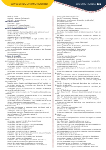 WWW.GHIDULPRIMARIILOR.RO JUDE%u021aUL MURE%u0218 / 535Produse locale:Agricole %u2013 legume, flori, cereale Animale %u2013 produse lactateObiective turistice:Complex %u201cLaguna%u201dRestaurantul %u201cPe%u015fti%u015forul de aur%u201dZona de pescuit Lacul Verde %u0219i DoralexFacilit%u00e3%u0163i oferite investitorilor:Drum jude%u0163eanCurent electric %u0219i iluminant public %u00een toate satele comuneiTelefonie fix%u0103 %u0219i mobile, cablu TV, internetInvesti%u021bii %u00een turismConcesion%u0103ri %u0219i %u00eenchirieri terenuriRe%u021bea de gaze naturale: Re%u021bea de ap%u0103 potabil%u0103, re%u021bea de canalizareServiciu de salubrizareServicii medicale %u0219i de educa%u021bieCre%u0219terea nivelului de calificare a popula%u021biei prin participarea la programe de instruire %u0219i formare profesional%u0103Atragerea fondurilor europene prin programe de finan%u021bare nerambursabileDezvoltarea infrastructuriiDezvoltarea serviciilor socialeProiecte de investi%u0163ii:Proiecte de investi%u021bii 2024Amenajare balustrad%u0103 de sprijin str. Mure%u0219ului, sat. S%u00e2ncraiu de Mure%u0219, com. S%u00e2ncraiu de Mure%u0219Amenajare %u015fan%u0163uri Cartierul tineretuluiCamere supraveghereAmenajare %u0219an%u021buri cu rigole (traversare drum) - str. DelureniAmenajare %u0219an%u021buri - traversari strad%u0103 - str. R%u0103s%u0103ritului %u0219i str. Mure%u0219uluiAmenajare trotuare str. Delureni, sat. S%u00e2ncraiu de Mure%u015fLucr%u0103ri de amenajare %u0219an%u021buri str Delureni, sat. S%u00e2ncraiu de Mure%u0219Amenajare trotuare str. Principal%u0103, comuna%u00a0S%u00e2ncraiu de Mure%u0219 - zona sta%u021biilor de autobusExecutie parc joac%u0103%u00a0copii %u00een Comuna S%u00e2ncraiu de Mure%u0219%u00a0- -loc de joac%u0103%u00a0NaznaMobilier %u0219colar - Pupitru individual (banca) START reglabil - GAmenajare %u015fan%u0163uri str. Mure%u015fului, sat. S%u00e2ncraiu de Mure%u015f, comuna%u00a0S%u00e2ncraiu de Mure%u015fAmenajare trotuar str. Principal%u0103, sat. S%u00e2ncraiu de Mure%u0219m comuna%u00a0S%u00e2ncraiu de Mure%u0219Amenajare %u0219an%u021buri cu rigole - str. Principal%u0103, localitatea%u00a0S%u00e2ncraiu de Mure%u0219Amenajare trotuare str. Mure%u015fului (etapa 2), sat. S%u00e2ncraiu de Mure%u015f, comuna S%u00e2ncriu de Mure%u015fExecu%u021bie parc joac%u0103%u00a0copii %u00een Comuna S%u00e2ncraiu de Mure%u0219Amenajare trotuare str. Mure%u015fului, comuna%u00a0S%u00e2ncraiu de Mure%u015fSistem video de supraveghere stradal%u0103Container cu grup sanitar COMPLET 6140 L ext. x 2400 l . ext. x 2680 h exteriorExtindere (proiectare %u0219i executie) re%u021bea distribu%u021bie ap%u0103 %u00een Comuna S%u00e2ncraiu de Mure%u0219Amenajare %u0219anturi cu rigole %u00een Cartierul TineretuluiProiectare %u0219i execu%u021bie - Reabilitare %u0219i modernizare drumuriServicii elaborare PT- Amenajare %u0219an%u021buri IExtindere conducte ap%u0103Proiectare %u0219i execu%u021bie - Extindere cl%u0103dire Gradini%u021ba S%u00e2ncraiu de Mure%u0219Amenajare parcare Prim%u0103rie S%u00eencraiu de Mure%u0219Amenajare sta%u021bii de autobusAmenajare parcare %u00een comuna S%u00e2ncraiu de Mure%u0219Amenajare trotuare str. L%u0103cr%u0103mioareiAmenajare trotuare str. Mure%u0219uluiAmenajare trotuare str. DealuluiAmenajare %u0219an%u021buri cu rigole str. DealuluiExtindere re%u021bea de iluminat str. Delureni, str. Noua, str.TarguluiExtindere re%u021bea de iluminat stradalAmenajare %u0219an%u021buri %u00een comuna S%u00e2ncraiu de Mure%u0219Amenajare trotuare str. Mure%u0219uluiExtindere retea iluminat public stradal-str. R%u0103s%u0103rituluiDot%u0103ri Sta%u021bie de pompare str. Sportivilor sat NaznaLucr%u0103ri de modernizare %u0219i reabilitare str. Mure%u0219uluiLucr%u0103ri Reabilitare Cl%u0103dire administrativ%u0103 sediu Prim%u0103rieIluminat public stradalAmenajare canalizare pluviala Servicii Proiectare %u0219i Execu%u021bieExtindere de canalizare str. Ghioceilor, Str. L%u0103m%u00e2i%u021beiExtindere canalizareExtindere canalizare Serv. SFExtindere %u0219i modernizare re%u021bea ap%u0103Achizi%u021bionare utilajeServicii execu%u021bie lucr%u0103ri - Amenajare %u0219an%u021buri IAchizi%u021bie sistem supraveghereExt. Re%u021bea iluminat (str. %u0218colii, str. L%u0103cr%u0103mioarei, str. Pie%u021bei, str. Ghioceilor)Ext. Re%u021bea iluminat (str. Nucului, str. Violetelor, str. P%u0103%u0219unii, str. Liliacului)Ext. Re%u021bea Iluminat (str. Iasomiei, str. Irisului, str. Magnoliei, str. Mu%u0219c%u0103%u021bii, str. Violetelor)Extindere re%u021bea electric%u0103 cartier%u00a0R%u0103s%u0103rituluiAmenajare refugii sta%u021biiAmenajare trotuare str. Mure%u0219ului, str. Livezilor, str. CrinuluiAmenajare trotuare str. Bujorului Amenajare parcare Sala de Sport NaznaAmenajare parcare /platform%u0103 pietruit%u0103Central%u0103%u00a0telefonic%u0103Asfalt%u0103riPrelungire conduct%u0103 de ap%u0103 %u0219i canalizareAmenajare instala%u021bie gazAmenajare intersec%u021bie str. FlorilorLucr%u0103ri de deviere re%u021bele de ap%u0103 %u0219i canalizare menajer%u0103 %u00een - Amenajare intersec%u021bie str. FlorilorAmenajare spa%u021biu de joac%u0103 str. NuculuiAmenajare parcare prim%u0103rieAmenajare spa%u021biu de joac%u0103 str. Nucului - Lucr%u0103ri montare dale de cauciucProiectare %u0219i execu%u021bie - Construire cre%u0219%u0103 %u00een localitatea S%u00e2ncraiu de Mure%u0219Serv. Documenta%u021bie tehnic%u0103 - Reabilitare Dispensar umanServ. Documenta%u021bie tehnic%u0103 - Reabilitare Dispensar veterinarServ. Elaborare doc tehnic%u0103 - Construire Cre%u0219%u0103 mic%u0103 NaznaServ. %u00centocmire Expertiz%u0103 tehnic%u0103 - Eficientizare energetic%u0103 Blocuri IIServicii Proiectare %u0219i Execu%u021bie Extindere de canalizare str. Ghioceilor, Str. L%u0103m%u00e2i%u021bei Servicii dirigen%u021bie Extindere re%u021bea canalizare str. Ghioceilor, str. L%u0103m%u00e2i%u021beiServ. SF Extindere %u0219i modernizare re%u021bea ap%u0103Serv. %u00centoc