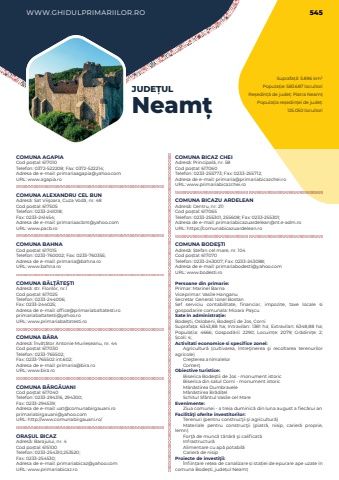 WWW.GHIDULPRIMARIILOR.RO 545Suprafa%u021b%u0103: 5.896 km%u00b2Popula%u021bie: 583.687 locuitoriRe%u0219edin%u021b%u0103 de jude%u021b: Piatra Neam%u021bPopula%u021bia re%u0219edin%u021bei de jude%u021b: 125.050 locuitoriJUDE%u021aULNeam%u021bCOMUNA AGAPIACod po%u0219tal: 617010Telefon: 0372-522208; Fax: 0372-522214; Adresa de e-mail: primariaagapia@yahoo.comURL: www.agapia.roCOMUNA ALEXANDRU CEL BUNAdres%u0103: Sat Vii%u015foara, Cuza Vod%u0103, nr. 48Cod po%u0219tal: 617505Telefon: 0233-241018; Fax: 0233-241454; Adresa de e-mail: primariaacbnt@yahoo.comURL: www.pacb.roCOMUNA BAHNACod po%u0219tal: 617015Telefon: 0233-760002; Fax: 0233-760355; Adresa de e-mail: primaria@bahna.roURL: www.bahna.roCOMUNA B%u0102L%u0162%u0102TE%u015eTIAdres%u0103: str. Florilor, nr.1Cod po%u0219tal: 617025Telefon: 0233-244006; Fax: 0233-244025; Adresa de e-mail: office@primariabaltatesti.ro primariabaltatesti@yahoo.roURL: www.primariabaltatesti.roCOMUNA B%u00c2RAAdres%u0103: %u00cenv%u0103%u021b%u0103tor Antonie Murie%u0219eanu, nr. 44Cod po%u0219tal: 617030Telefon: 0233-765502; Fax: 0233-765502 int.602; Adresa de e-mail: primaria@bira.roURL: www.bira.roCOMUNA B%u00c2RG%u0102UANICod po%u0219tal: 617040Telefon: 0233-294316, 294300; Fax: 0233-294539; Adresa de e-mail: uat@comunabirgauani.roprimariabirgauani@yahoo.comURL: http://www.comunabirgauani.ro/ORA%u0218UL BICAZAdres%u0103: Barajului, nr. 4Cod po%u0219tal: 615100Telefon: 0233-254310,253520; Fax: 0233-254530; Adresa de e-mail: primariabicaz@yahoo.comURL: www.primariabicaz.roCOMUNA BICAZ CHEIAdres%u0103: Principal%u0103, nr. 58Cod po%u0219tal: 617060Telefon: 0233-255773; Fax: 0233-255712; Adresa de e-mail: primaria@primariabicazchei.roURL: www.primariabicazchei.roCOMUNA BICAZU ARDELEANAdres%u0103: Centru, nr. 211Cod po%u0219tal: 617065Telefon: 0233-255301, 255608; Fax: 0233-255301; Adresa de e-mail: primariabicazuardelean@nt.e-adm.roURL: https://comunabicazuardelean.roCOMUNA BODE%u015eTIAdres%u0103: %u0218tefan cel mare, nr. 104Cod po%u0219tal: 617070Telefon: 0233-243007; Fax: 0233-243088; Adresa de e-mail: primariabodesti@yahoo.comURL: www.bodesti.roPersoane din primarie:Primar: Marinel BarnaViceprimar: Vasile HanganuSecretar General: Ionel BostanSef serviciu contabilitate, financiar, impozite, taxe locale si gospodarire comunala: Mioara Pa%u015fcuSate %u00een administra%u021bie:Bode%u015fti, Oslobeni, Bode%u015ftii de Jos, CorniSuprafa%u021ba:%u00a06343,88 ha; Intravilan:%u00a01381 ha; Extravilan:%u00a06348,88 ha; Popula%u021bia:%u00a0 4666; Gospod%u0103rii:%u00a0 2290; Locuin%u021be:%u00a0 2079; Gr%u0103dini%u021be:%u00a0 2; %u0218coli:%u00a04; Activitati economice si specifice zonei:Agricultur%u0103 (cultivarea, %u00eentre%u0163inerea %u015fi recoltarea terenurilor agricole)Cre%u015fterea animalelorComer%u0163%u00a0Obiective turistice:Biserica Bode%u015ftii de Jos - monument istoricBiserica din satul Corni - monument istoricM%u0103n%u0103stirea DumbraveleM%u00e2n%u0103stirea Br%u0103di%u021belSchitul Sf%u00e2ntul%u00a0Vasile cel MareEvenimente:Ziua comunei - a treia%u00a0duminic%u0103 din luna august a fiec%u0103rui anFacilit%u00e3%u0163i oferite investitorilor:Terenuri (pentru construc%u0163ii %u015fi agricultur%u0103)Materiale pentru construc%u0163ii (piatr%u0103, nisip, carier%u0103 proprie, lemn)For%u0163%u0103 de munc%u0103 t%u00e2n%u0103r%u0103 %u015fi calificat%u0103Infrastructur%u0103Alimentare cu ap%u0103 potabil%u0103Carier%u0103 de nisipProiecte de investi%u0163ii:%u00cenfiin%u021bare re%u021bea de canalizare %u0219i sta%u021biei de epurare ape uzate %u00een comuna Bode%u0219ti, jude%u021bul Neam%u021b