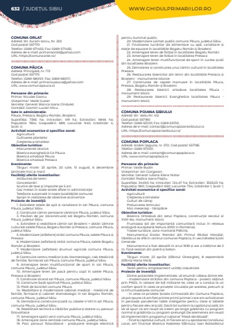 632 / JUDE%u021aUL SIBIU WWW.GHIDULPRIMARIILOR.ROCOMUNA ORLATAdres%u0103: Str. Avram Iancu, Nr. 202Cod po%u0219tal: 557170Telefon: 0269-571455; Fax: 0269-571455; Adresa de e-mail: primariaorlat@yahoo.comURL: https://comunaorlat.ro/COMUNA P%u0102UCAAdres%u0103: Principal%u0103, nr. 172Cod po%u0219tal: 557175Telefon: 0269-580101; Fax: 0269-580111; Adresa de e-mail: primaria.pauca@yahoo.comURL: www.comunapauca.roPersoane din primarie:Primar: Niculae DancuViceprimar: Vasile GusanSecretar General: Bianca Ioana C%u00eendule%u021bContabil: Cosmin Lucian MicuSate %u00een administra%u021bie:P%u0103uca, Presaca, Bogatu-Rom%u00e2n, Bro%u015fteniSuprafa%u021ba:%u00a0 7365 ha; Intravilan:%u00a0 419 ha; Extravilan:%u00a0 6946 ha; Popula%u021bia:%u00a0 1954; Gospod%u0103rii:%u00a0 689; Locuin%u021be:%u00a0 940; Gr%u0103dini%u021be:%u00a0 4; %u0218coli:%u00a04; Activitati economice si specifice zonei:Agricultur%u0103Cultivarea plantelorCre%u015fterea animalelor%u00a0Obiective turistice:Monumente istoriceBiserica evanghelic%u0103 CA P%u0103ucaBiserica ortodox%u0103 P%u0103ucaBiserica ortodox%u0103 PresacaEvenimente:T%u00e2rguri mixte: 23 aprilie, 20 iulie, 15 august, 6 decembrie (animale mici %u015fi mari)Facilit%u00e3%u0163i oferite investitorilor:Atribuirea de terenConcesion%u0103riScutire de taxe %u015fi impozite pe 5 aniGaz metan %u00een toate satele aflate %u00een administra%u0163ieTelefonie automat%u0103 %u00een toate localit%u0103%u0163iile comuneiSprijin %u00een realizarea de obiective economiceProiecte de investi%u0163ii:1. Extindere re%u021bele de ap%u0103 %u0219i canalizare %u00een sat P%u0103uca, comuna P%u0103uca, jude%u021bul Sibiu2. Construire c%u0103min persoane v%u00e2rstnice P%u0103uca, jude%u021bul Sibiu3. Pavilion de joc (reconstruire) sat Bogatu Rom%u00e2n, comuna P%u0103uca, jude%u021bul Sibiu4. Extindere %u0219i reabilitare c%u0103min sat Bro%u0219teni + dot%u0103ri c%u0103mine culturale satele P%u0103uca, Bogatu Rom%u00e2n %u0219i Presaca, comuna P%u0103uca, jude%u021bul Sibiu5. Modernizare (asfaltare) str%u0103zi comuna P%u0103uca, satele P%u0103uca %u0219i Presaca6. Modernizare (asfaltare) str%u0103zi comuna P%u0103uca, satele Bogatu Rom%u00e2n %u0219i Bro%u0219teni7. Modernizare (asfaltare) drumuri agricole comuna P%u0103uca, jude%u021bul Sibiu8. Construire centru medical (cab. Stomatologic, cab. Medicin%u0103 de familie, farmacie) sat P%u0103uca, comuna P%u0103uca, jude%u021bul Sibiu9. Amenajare teren multifunc%u021bional de sport %u00een sat P%u0103uca, comuna P%u0103uca, jude%u021bul Sibiu10. Amernajare teren de joac%u0103 pentru copii %u00een satele P%u0103uca, Presaca %u0219i Bro%u0219teni11. Construire %u0219trand sat P%u0103uca, comuna P%u0103uca, jude%u021bul Sibiu12. Construire baz%u0103 sportiv%u0103 P%u0103uca, jude%u021bul Sibiu13. Pist%u0103 de bicicli%u0219ti comuna P%u0103uca14. Reabilitare %u0219i modernizare cabinet medical - medicin%u0103 de familie, farmacie %u0219i cabinet stomatologic %u00een sat Bogatu Rom%u00e2n, comuna P%u0103uca, jude%u021bul Sibiu15. Demolare %u0219i construire %u0219coal%u0103 cu clasele V-VIII %u00een sat P%u0103uca, comuna P%u0103uca, jude%u021bul Sibiu16. Reabilitare termic%u0103 a cl%u0103dirilor publice %u0219i dotare cu panouri fotovoltaice17. Amenajare spa%u021bii verzi comuna P%u0103uca, jude%u021bul Sibiu18. Amenajare zone centrale comuna P%u0103uca, jude%u021bul Sibiu19. Parc panouri fotovoltaice - producere energie electric%u0103 pentru iluminat public20. Modernizare iulimat public comuna P%u0103uca, jude%u021bul Sibiu21. Finalizarea lucr%u0103rilor de alimentare cu ap%u0103, canalizare %u0219i sta%u021bie de epurare %u00een localit%u0103%u021bile Bogatu Rom%u00e2n %u0219i Bro%u0219teni22. Amenajare teren de fotbal %u00een localitatea Bogatu Rom%u00e2n23. Amenajare teren de fotbal %u00een localitatea Presaca24. Amenajare teren multifunc%u021bional de sport %u00een curtea %u0219colii din localitatea Bro%u0219teni25. Demolarea %u0219i construirea unui c%u0103min cultural %u00een localitatea Presaca26. Restaurarea bisericilor din lemn din localit%u0103%u021bile Presaca %u0219i Bro%u0219teni - monumente istorice%u00a027. Construirea de capele mortuare %u00een localit%u0103%u021bile P%u0103uca, Presaca, Bogatu Rom%u00e2n %u0219i Bro%u0219teni28. Restaurarea bisericii ortodoxe localitatea P%u0103uca - monument istoric29. Restaurarea bisericii Evanghelice localitatea P%u0103uca - monument istoricCOMUNA POIANA SIBIULUIAdres%u0103: Str. Vadu Nr. 412Cod po%u0219tal: 557180Telefon: 0269-531101; Fax: 0269-531110; Adresa de e-mail: contact@comunapoianasibiului.roURL: https://comunapoianasibiului.ro/COMUNA POPLACAAdres%u0103: Andrei %u0218aguna, nr. 572; Cod po%u0219tal: 557185Telefon: 0269-573101; Adresa de e-mail: contact@comunapoplaca.roURL: www.comunapoplaca.roPersoane din primarie:Primar: Vasile BudinViceprimar: Ion CiorgovanSecretar General: Iuliana Elena NistorContabil: Rodica Ioana Pa%u015ftiuSuprafa%u021ba:%u00a03449,5 ha; Intravilan:%u00a0124,47 ha; Extravilan:%u00a03325,03 ha; Popula%u021bia:%u00a01801; Gospod%u0103rii:%u00a0650; Locuin%u021be:%u00a0734; Gr%u0103dini%u021be:%u00a01; %u0218coli:%u00a01; Activitati economice si specifice zonei:Agricultur%u0103Cre%u015fterea animalelorCulturi de c%u00e2mpPrelucrarea lemnuluiMici meseria%u015fi - t%u00e2mpl%u0103rieObiective turistice:Biserica Ortodox%u0103 din satul Poplaca, construc%u021bie secolul al XVIII-lea, monument istoricFrumoasa (sit de importan%u021b%u0103 comunitar%u0103 inclus %u00een re%u021beaua ecologic%u0103 european%u0103 Natura 2000 %u00een Rom%u00e2nia).Trasee turistice, zona montan%u0103 P%u0103ltini%u0219.Monumentul Eroilor Rom%u00e2ni din Primul R%u0103zboi Mondial. Obeliscul se afl%u0103 %u00een centrul comunei Poplaca, %u00een vecin%u0103tatea %u0218colii Generale. Monumentul a fost dezvelit %u00een anul 1939 %u0219i are o %u00een%u0103l%u021bime de 3 m, fiind realizat din piatr%u0103 %u0219i beton.Evenimente:T%u00e2rguri mixte: 23 aprilie (Sf%u00e2ntul Gh