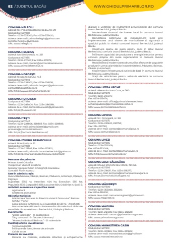 82 / JUDE%u021aUL BAC%u0102U WWW.GHIDULPRIMARIILOR.ROCOMUNA HELEGIUAdres%u0103: Str. Preot Constantin Badiu, Nr. 29Cod po%u0219tal: 607230Telefon: 0234-333000; Fax: 0234-333420; Adresa de e-mail: primarhelegiu@yahoo.comsecretar.helegiu@yahoo.roURL: www.helegiu.roCOMUNA HEMEIU%u015eAdres%u0103: Ion Simionescu, nr. 221Cod po%u0219tal: 607235Telefon: 0234-217510; Fax: 0234-217675; Adresa de e-mail: contact@primariahemeius.roURL: www.primariahemeius.roCOMUNA HORGE%u015eTIAdres%u0103: Strada Stejarului nr.3Cod po%u0219tal: 607240Telefon: 0234-226002; Fax: 0234-226108; Adresa de e-mail: primaria.horgesti@yahoo.comcontact@horgestibc.ro.roURL: http://www.comunahorgesti.ro/COMUNA HURUIE%u015eTICod po%u0219tal: 607250Telefon: 0234-286004; Fax: 0234-286289; Adresa de e-mail: primariahuruiesti@yahoo.comURL: https://huruiesti.ro/COMUNA ITE%u015eTICod po%u0219tal: 607047Telefon: 0234-228806, 228803; Fax: 0234-228806; Adresa de e-mail: primariaitesti@gmail.comprimaria@cprimariaitesti.comURL: https://comunaitestibacau.ro/COMUNA IZVORU BERHECIULUIAdres%u0103: Principal%u0103, nr. 51Cod po%u0219tal: 607260Telefon: 0234-223502; Fax: 0234-223502; Adresa de e-mail: primaria.izvoruberheciului@yahoo.roURL: https://primariaizvoruberheciului.ro/contact/Persoane din primarie:Primar: Ionel CristoforViceprimar: Vasilic%u0103 Breahn%u0103Secretar General: Sorin Ghiorghi%u021b%u0103 CiocodeiuContabil: Florin ApostuSate %u00een administra%u021bie:Izvorul Berheciului, Ob%u00eer%u015fia, Baimac, P%u0103dureni, Antohe%u015fti, O%u021bele%u015fti, F%u0103gheniSuprafa%u021ba:%u00a0 5755 ha; Intravilan:%u00a0 404 ha; Extravilan:%u00a0 5351 ha; Popula%u021bia:%u00a01536; Gospod%u0103rii:%u00a0836; Locuin%u021be:%u00a0824; Gr%u0103dini%u021be:%u00a04; %u0218coli:%u00a05; Activitati economice si specifice zonei:Agricultur%u0103Cre%u0219terea animalelorObiective turistice:M%u0103n%u0103stirea %u201cIntrarea %u00een Biseric%u0103 a Maicii Domnului%u201d BaimacSchitul %u201cPanu%u201dLacul piscicol Antohe%u015fti cu o suprafa%u0163%u0103 de 22 ha - Antohe%u015ftiMonumentele ridicate %u00een cinstea eroilor din cele dou%u0103 r%u0103zboaie mondiale din satele Izvoru Berheciului, Ob%u00e2r%u015fia %u015fi BaimacEvenimente:%u201cZilele localit%u0103%u0163ii%u201d - 14 septembrieT%u00e2rg comunal - %u00een fiecare zi de mar%u021bi%u201cHramul M%u0103n%u0103stirii Baimac%u201d - 21 noiembrieFacilit%u00e3%u0163i oferite investitorilor:Terenuri agricole%u00cenfiin%u021bare de livezi, ferme de animaleCai de accesProiecte de investi%u0163ii:Dotarea cu mobilier, materiala ditactice %u0219i echipamente digitale a unit%u0103%u021bilor de %u00eenv%u0103%u021b%u0103m%u00e2nt preuniversitar din comuna Izvoru Berheciului, jude%u021bul Bac%u0103uModernizare drumuri de interes local %u00een comuna Izvorul Berheciului, jude%u021bul Bac%u0103uDezvoltarea sistemului de management local prin implementarea unui sistem de monitorizare %u0219i siguran%u021b%u0103 a spa%u021biului public la nivelul comunei Izvorul Berheciului, jude%u021bul Bac%u0103uConstruire spa%u021biu de joac%u0103 pentru copii %u00een satul Izvorul Berheciului, comuna Izvorul Berheciului, jude%u021bul Bac%u0103u%u00cenfiin%u021bare capacit%u0103%u021bi de producere a energiei electrice pentru consum propriu din surse regenerabile %u00een comuna Izvorul Berheciului, jude%u021bul Bac%u0103uReabilitarea %u0219i modernizarea drumuriilor afectate de pagubele produse %u00een urma calamit%u0103%u021bilor %u00een satele O%u021bele%u0219ti, P%u0103dureni, Baimac, Ob%u00eer%u0219ia %u0219i Antohe%u0219tiModernizare infrastructur%u0103 rutier%u0103 de baz%u0103 %u00een comuna Izvorul Berheciului, jude%u021bul Bac%u0103u Sta%u021bii de re%u00eenc%u0103rcare pentru vehicule electrice %u00een comuna Izvorul Berheciului, jude%u021bul Bac%u0103uCOMUNA LETEA VECHEAdres%u0103: Alexandru Ioan Cuza, nr.360Cod po%u0219tal: 607270Telefon: 0234-213474; Fax: 0234-213474; Adresa de e-mail: office@primarialeteaveche.roachizitiipublice@primarialeteaveche.roURL: www.primarialeteaveche.roCOMUNA LIPOVAAdres%u0103: Str. Principal%u0103, nr. 98Cod po%u0219tal: 607275Telefon: 0234-220610, 220753; Fax: 234-220753; Adresa de e-mail: contact@comunalipova.roURL: www.comunalipova.roCOMUNA LIVEZICod po%u0219tal: 607285Telefon: 0234-332009; Fax: 0234-332009; Adresa de e-mail: contact@comunalivezi.roURL: http://www.comunalivezi.ro/COMUNA LUIZI-C%u0102LUG%u0102RAAdres%u0103: CALEA %u0218TEFAN CEL MARE, NR.166Cod po%u0219tal: 607295Telefon: 0234-218011; Fax: 0234-218277; Adresa de e-mail: primaria@comunaluizicalugara.roURL: https://comunaluizicalugara.ro/COMUNA M%u0102GIRE%u015eTICod po%u0219tal: 607300Telefon: 0234-355000, 355200; Fax: 0234-355200; Adresa de e-mail: comunamagiresti@yahoo.comURL: www.magiresti.roCOMUNA M%u0102GURACod po%u0219tal: 607305Telefon: 0234-212406; Fax: 0234-212623; Adresa de e-mail: contact@primaria-magura.roURL: www.primaria-magura.roCOMUNA M%u0102N%u0102STIREA CASINCod po%u0219tal: 607310Telefon: 0234-331824; Fax: 0234-331624; Adresa de e-mail: manastireacasin@gmail.comURL: www.manastireacasin.ro