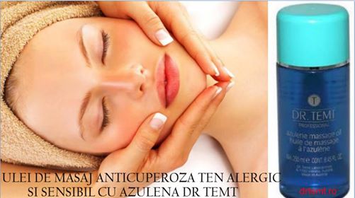Produsele cosmetice profesionale din GAMA PENTRU TEN SENSIBIL ALERGIC CU ROZACEE SI CUPEROZA CU AZULENA DR. TEMT sunt special concepute pentru problemele tenului alergic, sensibil, iritat, stresat si lipsit de expresivitate in urma expunerii la soare.Produsele cosmetice profesionale din GAMA PENTRU TEN SENSIBIL ALERGIC CU ROZACEE SI CUPEROZA CU AZULENA DR. TEMT diminueaza roseata zonelor afectate, intaresc celulele pielii, previn deshidratarea si atenueaza iritatiile pielii, relaxeaza, catifeleaza si niveleaza textura pielii.GAMA PENTRU TEN SENSIBIL ALERGIC CU ROZACEE SI CUPEROZA CU AZULENA DR. TEMT are ca ingredient principal AZULENA: un ulei volatil obþinut prin distilare la abur din musetel, avand culoarea albastra, specifica cerului senin dintr-o zi insorita. Musetelul contine o mare varietate de elemente active cu rol antiinflamator si antioxidant semnificativ fiind folosit inca din antichitate pentru calitatile sale revigorante.Musetelul este lipsit de de toxicitate, fiind recomandat in compozitia produselor cosmetice pentru pielea sensibila a copiilor.Azulena are proprietati antiinflamatorii, linistitoare, bacteriostatice si bactericide, trateaza acneea, rozaceea, ajuta la vindecarea ranilor si fragilitatii capilare, regenereaza pielea.IRIS CLASS GRUP - UNIC DISTRIBUITOR AUTORIZAT IN ROMANIA COSMETICE PROFESIONALE DR. TEMT.