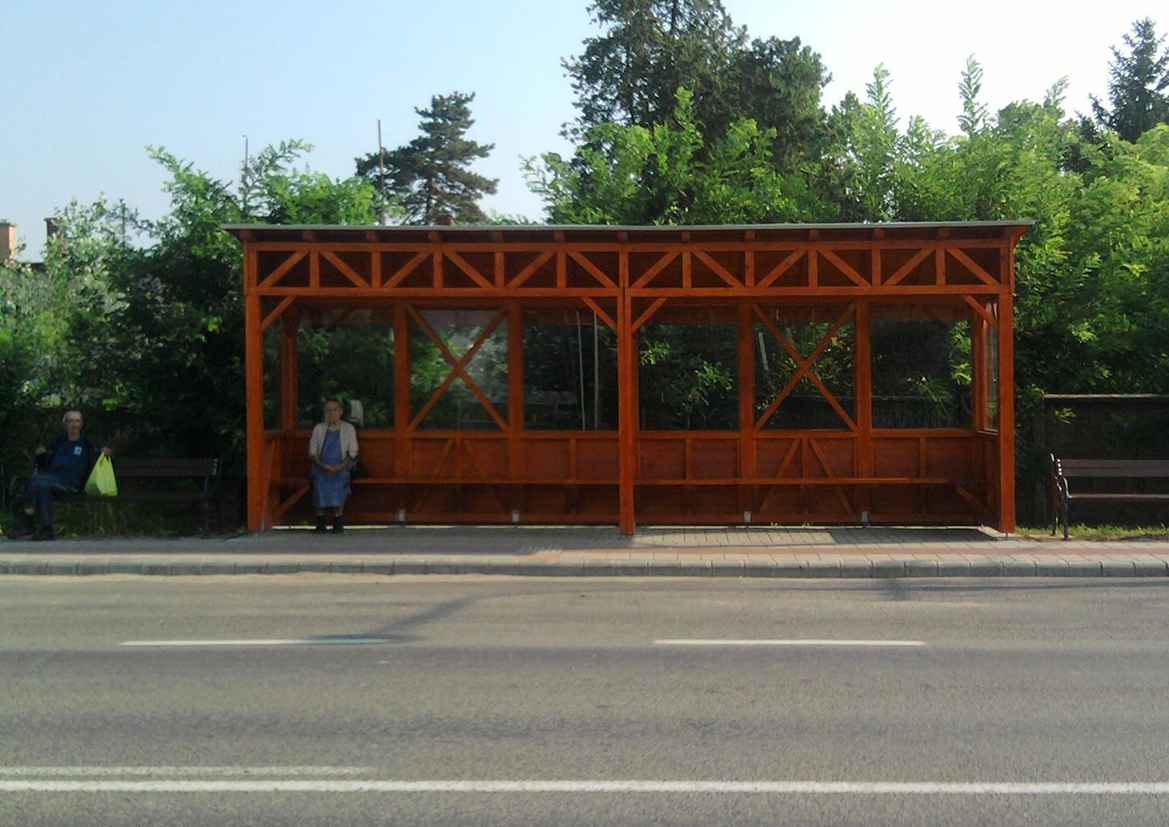 - Statie de autobuz cu banca din lemn rasinoase uscat, impregnat, baituit si lacuit rezistent la intemperiile atmosferice